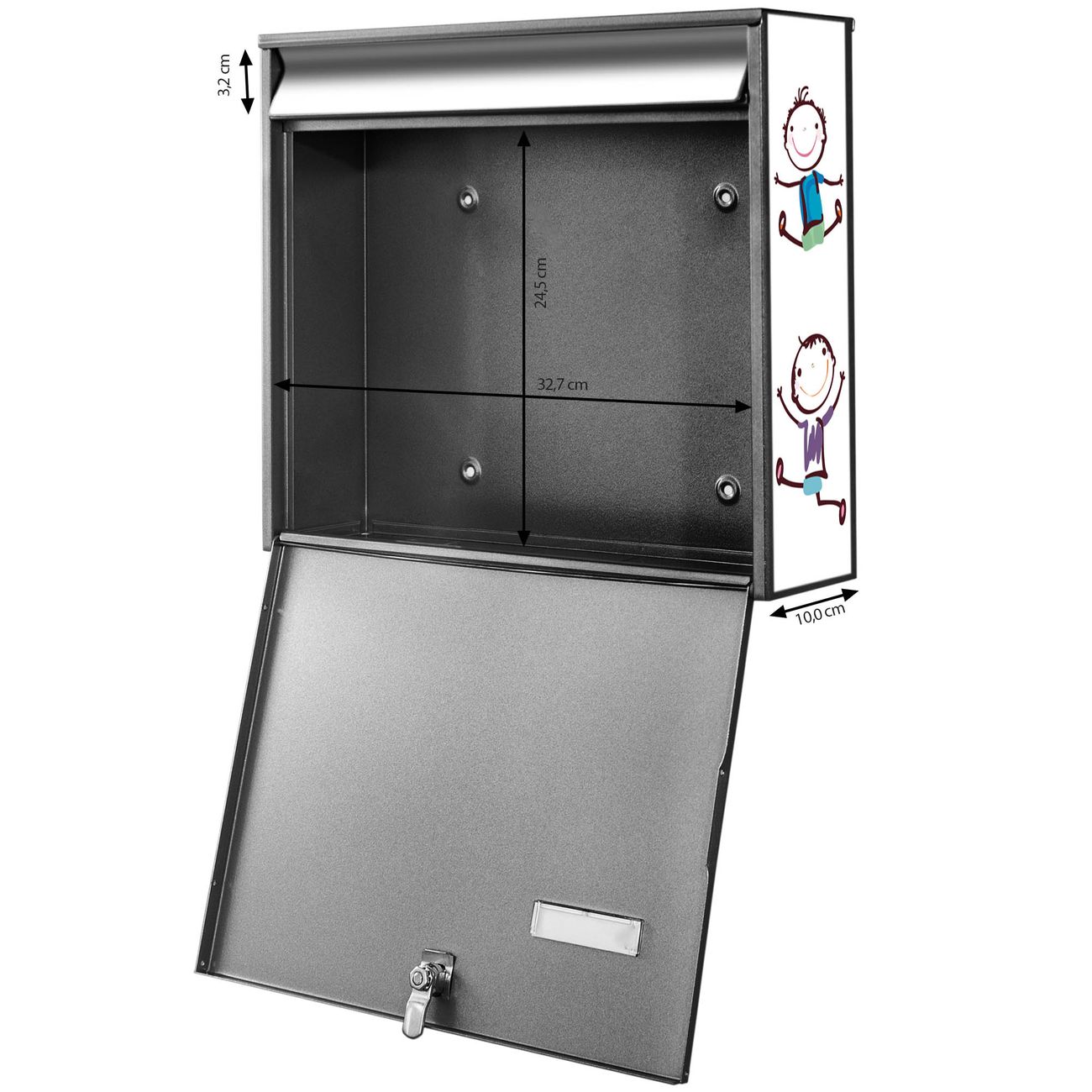 FUNKTION: Die Burg Wächter doppel Briefkastenanlage mit Motiv Happy Kids bietet Ihnen ein großes Fassungsvermögen, sodass auch A4 Sendungen eingeworfen werden können. Das Namensschild lässt sich individuell beschriften. DESIGN: Die 2 Briefkästen mit Happy Kids Motiv haben ein sehr ansprechendes und zeitloses Design. Heben Sie Sich von der tristen grauen Masse ab, ohne auf Funktionalität zu verzichten. Sie erhalten 2 Schlüssel sowie das Montagematerial. DETAILS: Der Doppelbriefkasten besteht aus verzinktem Stahl weiß. Er ist 72,5cm x 32,2cm x 10cm groß. Das Motiv besteht aus einer wetter- und UV-festen Folie, die Ihren Briefkasten zusätzlich vor Kratzern schützt. NUTZEN: Die stabile Bauart sowie die Wetterfestigkeit machen diese doppel Briefkästen zu einem zuverlässigen Begleiter im Alltag. Effektvoll in Reihe gehangen schmückt die Anlage jede Hauswand. BANJADO: Ihr Briefkasten wird in Sachsen in einer kleinen Manufaktur von Hand veredelt. Die Motivfolie ist lösungsmittelfrei und schutzlaminiert für einen langen Halt. Wir legen großen Wert auf die Verbindung von Funktionalität und Design. Sie erhalten Handarbeit aus Sachsen.