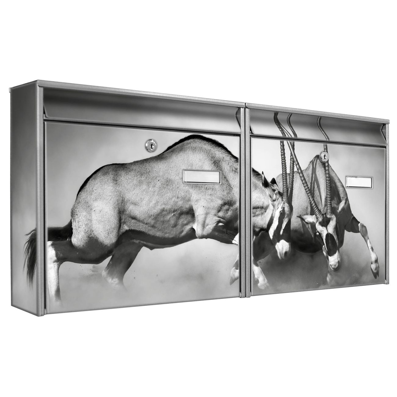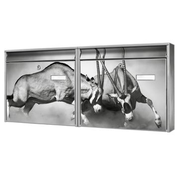 FUNKTION: Die Burg Wächter doppel Briefkastenanlage mit Motiv Head Crash bietet Ihnen ein großes Fassungsvermögen, sodass auch A4 Sendungen eingeworfen werden können. Das Namensschild lässt sich individuell beschriften. DESIGN: Die 2 Briefkästen mit Head Crash Motiv haben ein sehr ansprechendes und zeitloses Design. Heben Sie Sich von der tristen grauen Masse ab, ohne auf Funktionalität zu verzichten. Sie erhalten 2 Schlüssel sowie das Montagematerial. DETAILS: Der Doppelbriefkasten besteht aus verzinktem Stahl weiß. Er ist 72,5cm x 32,2cm x 10cm groß. Das Motiv besteht aus einer wetter- und UV-festen Folie, die Ihren Briefkasten zusätzlich vor Kratzern schützt. NUTZEN: Die stabile Bauart sowie die Wetterfestigkeit machen diese doppel Briefkästen zu einem zuverlässigen Begleiter im Alltag. Effektvoll in Reihe gehangen schmückt die Anlage jede Hauswand. BANJADO: Ihr Briefkasten wird in Sachsen in einer kleinen Manufaktur von Hand veredelt. Die Motivfolie ist lösungsmittelfrei und schutzlaminiert für einen langen Halt. Wir legen großen Wert auf die Verbindung von Funktionalität und Design. Sie erhalten Handarbeit aus Sachsen.
