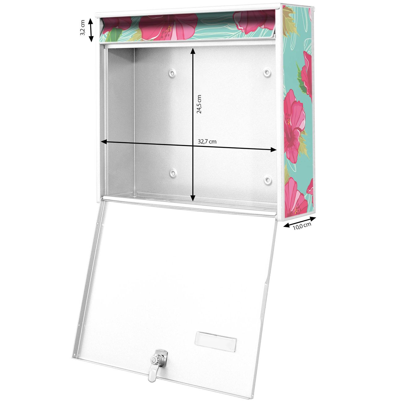 FUNKTION: Die Burg Wächter doppel Briefkastenanlage mit Motiv Hibiskus bietet Ihnen ein großes Fassungsvermögen, sodass auch A4 Sendungen eingeworfen werden können. Das Namensschild lässt sich individuell beschriften. DESIGN: Die 2 Briefkästen mit Hibiskus Motiv haben ein sehr ansprechendes und zeitloses Design. Heben Sie Sich von der tristen grauen Masse ab, ohne auf Funktionalität zu verzichten. Sie erhalten 2 Schlüssel sowie das Montagematerial. DETAILS: Der Doppelbriefkasten besteht aus verzinktem Stahl weiß. Er ist 72,5cm x 32,2cm x 10cm groß. Das Motiv besteht aus einer wetter- und UV-festen Folie, die Ihren Briefkasten zusätzlich vor Kratzern schützt. NUTZEN: Die stabile Bauart sowie die Wetterfestigkeit machen diese doppel Briefkästen zu einem zuverlässigen Begleiter im Alltag. Effektvoll in Reihe gehangen schmückt die Anlage jede Hauswand. BANJADO: Ihr Briefkasten wird in Sachsen in einer kleinen Manufaktur von Hand veredelt. Die Motivfolie ist lösungsmittelfrei und schutzlaminiert für einen langen Halt. Wir legen großen Wert auf die Verbindung von Funktionalität und Design. Sie erhalten Handarbeit aus Sachsen.