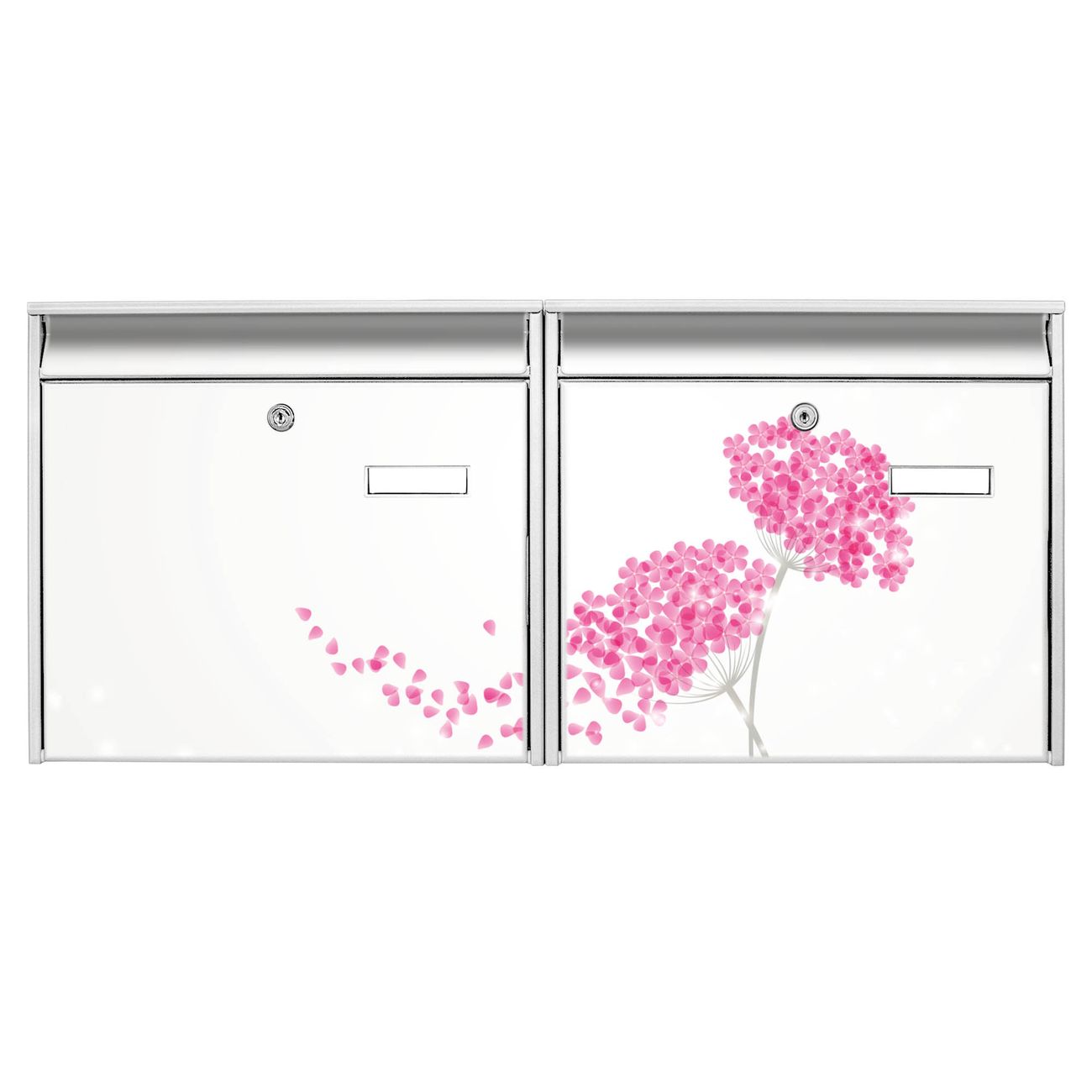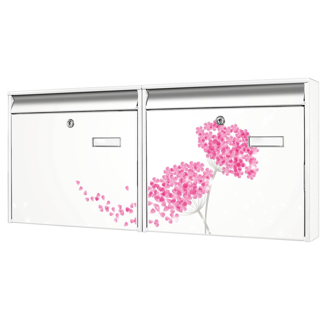 FUNKTION: Die Burg Wächter doppel Briefkastenanlage mit Motiv Holunder Pink bietet Ihnen ein großes Fassungsvermögen, sodass auch A4 Sendungen eingeworfen werden können. Das Namensschild lässt sich individuell beschriften. DESIGN: Die 2 Briefkästen mit Holunder Pink Motiv haben ein sehr ansprechendes und zeitloses Design. Heben Sie Sich von der tristen grauen Masse ab, ohne auf Funktionalität zu verzichten. Sie erhalten 2 Schlüssel sowie das Montagematerial. DETAILS: Der Doppelbriefkasten besteht aus verzinktem Stahl weiß. Er ist 72,5cm x 32,2cm x 10cm groß. Das Motiv besteht aus einer wetter- und UV-festen Folie, die Ihren Briefkasten zusätzlich vor Kratzern schützt. NUTZEN: Die stabile Bauart sowie die Wetterfestigkeit machen diese doppel Briefkästen zu einem zuverlässigen Begleiter im Alltag. Effektvoll in Reihe gehangen schmückt die Anlage jede Hauswand. BANJADO: Ihr Briefkasten wird in Sachsen in einer kleinen Manufaktur von Hand veredelt. Die Motivfolie ist lösungsmittelfrei und schutzlaminiert für einen langen Halt. Wir legen großen Wert auf die Verbindung von Funktionalität und Design. Sie erhalten Handarbeit aus Sachsen.