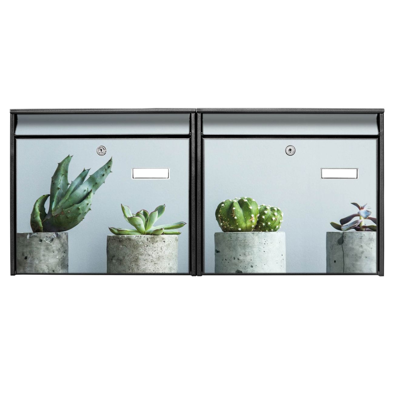 FUNKTION: Die Burg Wächter doppel Briefkastenanlage mit Motiv Kakteen in Beton bietet Ihnen ein großes Fassungsvermögen, sodass auch A4 Sendungen eingeworfen werden können. Das Namensschild lässt sich individuell beschriften. DESIGN: Die 2 Briefkästen mit Kakteen in Beton Motiv haben ein sehr ansprechendes und zeitloses Design. Heben Sie Sich von der tristen grauen Masse ab, ohne auf Funktionalität zu verzichten. Sie erhalten 2 Schlüssel sowie das Montagematerial. DETAILS: Der Doppelbriefkasten besteht aus verzinktem Stahl weiß. Er ist 72,5cm x 32,2cm x 10cm groß. Das Motiv besteht aus einer wetter- und UV-festen Folie, die Ihren Briefkasten zusätzlich vor Kratzern schützt. NUTZEN: Die stabile Bauart sowie die Wetterfestigkeit machen diese doppel Briefkästen zu einem zuverlässigen Begleiter im Alltag. Effektvoll in Reihe gehangen schmückt die Anlage jede Hauswand. BANJADO: Ihr Briefkasten wird in Sachsen in einer kleinen Manufaktur von Hand veredelt. Die Motivfolie ist lösungsmittelfrei und schutzlaminiert für einen langen Halt. Wir legen großen Wert auf die Verbindung von Funktionalität und Design. Sie erhalten Handarbeit aus Sachsen.