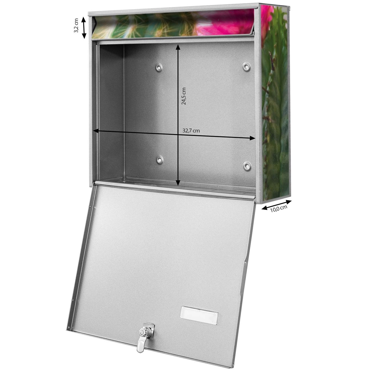 FUNKTION: Die Burg Wächter doppel Briefkastenanlage mit Motiv Kakteen bietet Ihnen ein großes Fassungsvermögen, sodass auch A4 Sendungen eingeworfen werden können. Das Namensschild lässt sich individuell beschriften. DESIGN: Die 2 Briefkästen mit Kakteen Motiv haben ein sehr ansprechendes und zeitloses Design. Heben Sie Sich von der tristen grauen Masse ab, ohne auf Funktionalität zu verzichten. Sie erhalten 2 Schlüssel sowie das Montagematerial. DETAILS: Der Doppelbriefkasten besteht aus verzinktem Stahl weiß. Er ist 72,5cm x 32,2cm x 10cm groß. Das Motiv besteht aus einer wetter- und UV-festen Folie, die Ihren Briefkasten zusätzlich vor Kratzern schützt. NUTZEN: Die stabile Bauart sowie die Wetterfestigkeit machen diese doppel Briefkästen zu einem zuverlässigen Begleiter im Alltag. Effektvoll in Reihe gehangen schmückt die Anlage jede Hauswand. BANJADO: Ihr Briefkasten wird in Sachsen in einer kleinen Manufaktur von Hand veredelt. Die Motivfolie ist lösungsmittelfrei und schutzlaminiert für einen langen Halt. Wir legen großen Wert auf die Verbindung von Funktionalität und Design. Sie erhalten Handarbeit aus Sachsen.