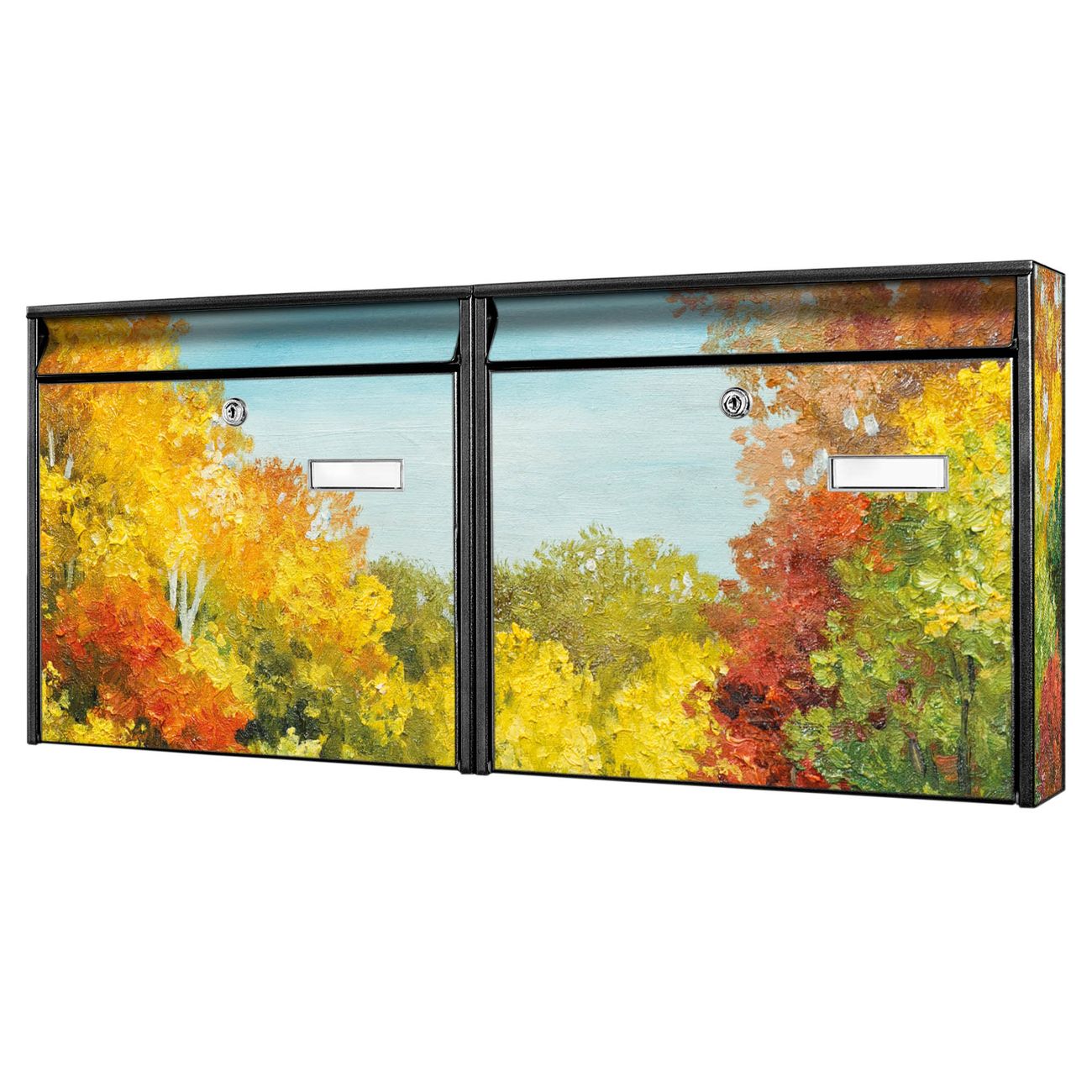 FUNKTION: Die Burg Wächter doppel Briefkastenanlage mit Motiv Kanal Im Herbst bietet Ihnen ein großes Fassungsvermögen, sodass auch A4 Sendungen eingeworfen werden können. Das Namensschild lässt sich individuell beschriften. DESIGN: Die 2 Briefkästen mit Kanal Im Herbst Motiv haben ein sehr ansprechendes und zeitloses Design. Heben Sie Sich von der tristen grauen Masse ab, ohne auf Funktionalität zu verzichten. Sie erhalten 2 Schlüssel sowie das Montagematerial. DETAILS: Der Doppelbriefkasten besteht aus verzinktem Stahl weiß. Er ist 72,5cm x 32,2cm x 10cm groß. Das Motiv besteht aus einer wetter- und UV-festen Folie, die Ihren Briefkasten zusätzlich vor Kratzern schützt. NUTZEN: Die stabile Bauart sowie die Wetterfestigkeit machen diese doppel Briefkästen zu einem zuverlässigen Begleiter im Alltag. Effektvoll in Reihe gehangen schmückt die Anlage jede Hauswand. BANJADO: Ihr Briefkasten wird in Sachsen in einer kleinen Manufaktur von Hand veredelt. Die Motivfolie ist lösungsmittelfrei und schutzlaminiert für einen langen Halt. Wir legen großen Wert auf die Verbindung von Funktionalität und Design. Sie erhalten Handarbeit aus Sachsen.