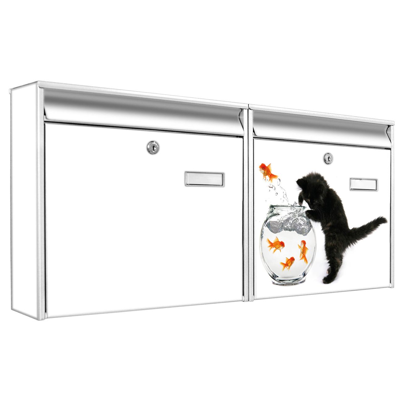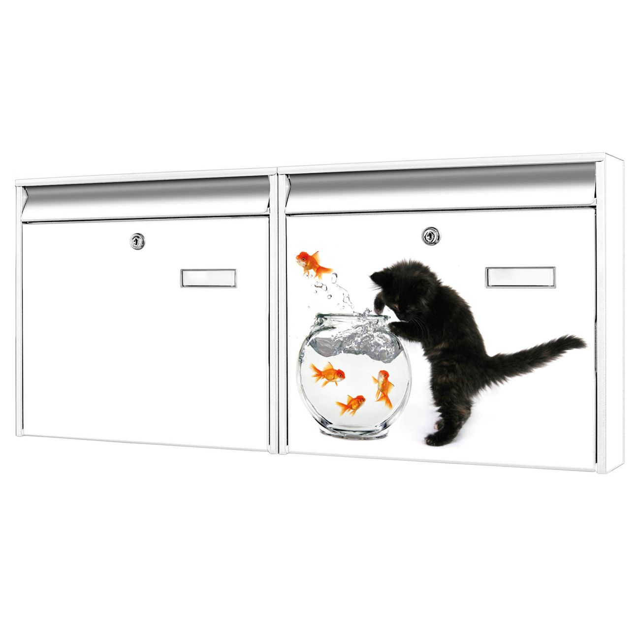 FUNKTION: Die Burg Wächter doppel Briefkastenanlage mit Motiv Katze Und Fisch bietet Ihnen ein großes Fassungsvermögen, sodass auch A4 Sendungen eingeworfen werden können. Das Namensschild lässt sich individuell beschriften. DESIGN: Die 2 Briefkästen mit Katze Und Fisch Motiv haben ein sehr ansprechendes und zeitloses Design. Heben Sie Sich von der tristen grauen Masse ab, ohne auf Funktionalität zu verzichten. Sie erhalten 2 Schlüssel sowie das Montagematerial. DETAILS: Der Doppelbriefkasten besteht aus verzinktem Stahl weiß. Er ist 72,5cm x 32,2cm x 10cm groß. Das Motiv besteht aus einer wetter- und UV-festen Folie, die Ihren Briefkasten zusätzlich vor Kratzern schützt. NUTZEN: Die stabile Bauart sowie die Wetterfestigkeit machen diese doppel Briefkästen zu einem zuverlässigen Begleiter im Alltag. Effektvoll in Reihe gehangen schmückt die Anlage jede Hauswand. BANJADO: Ihr Briefkasten wird in Sachsen in einer kleinen Manufaktur von Hand veredelt. Die Motivfolie ist lösungsmittelfrei und schutzlaminiert für einen langen Halt. Wir legen großen Wert auf die Verbindung von Funktionalität und Design. Sie erhalten Handarbeit aus Sachsen.