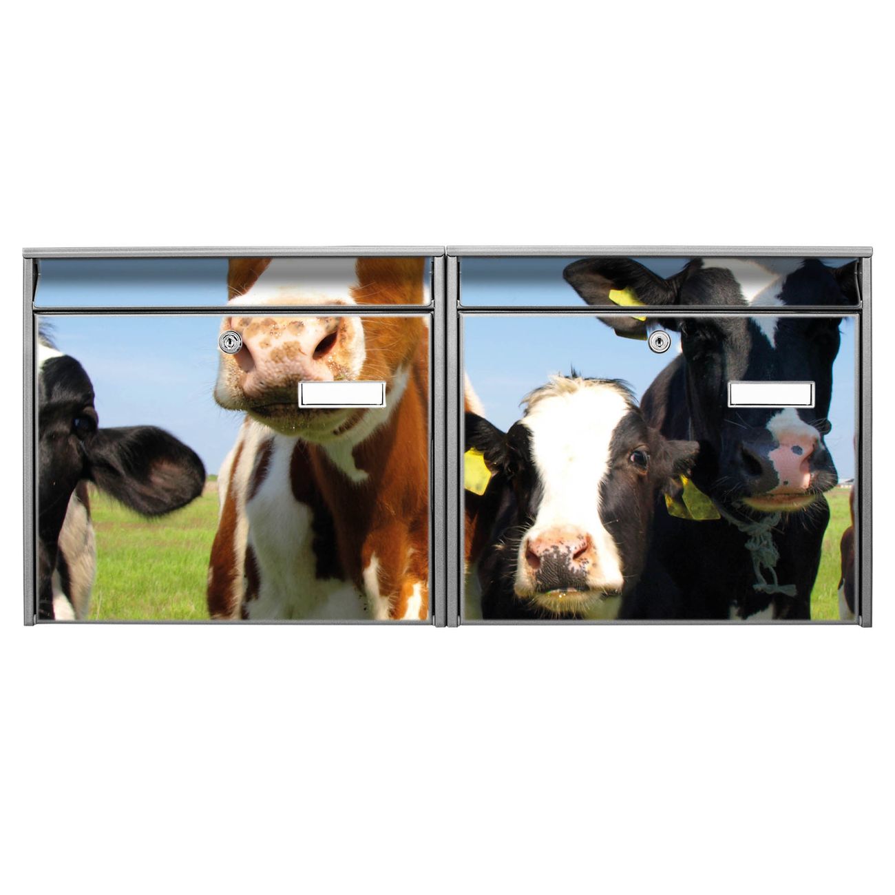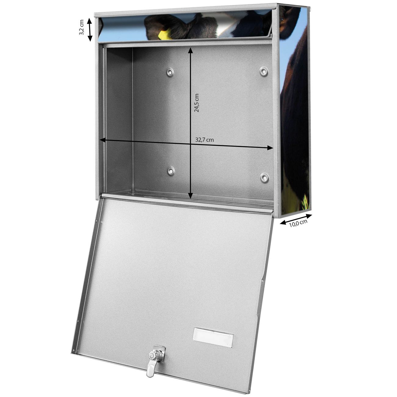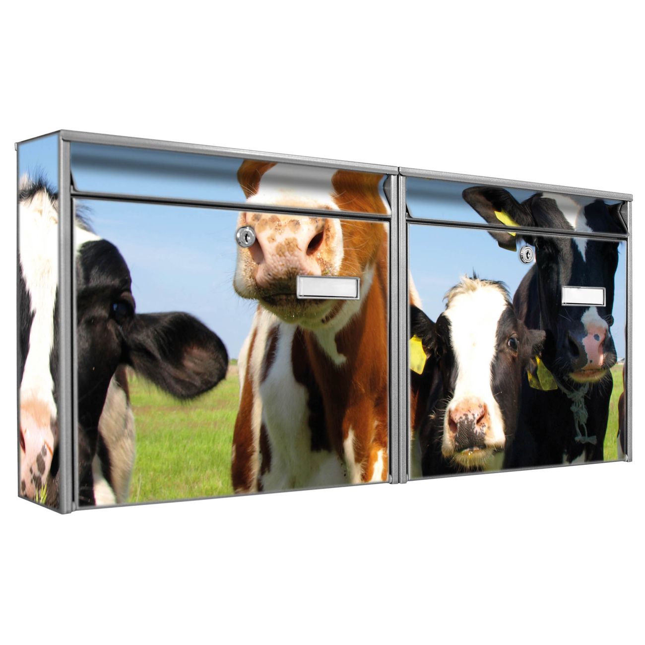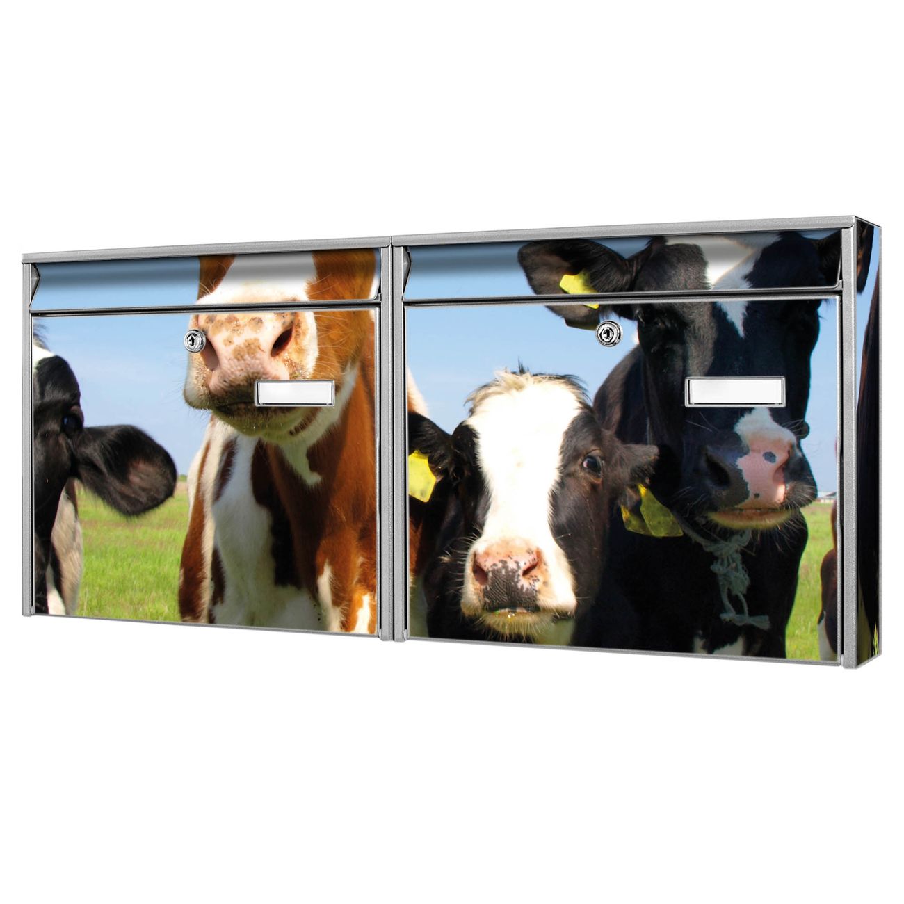 FUNKTION: Die Burg Wächter doppel Briefkastenanlage mit Motiv Kühe bietet Ihnen ein großes Fassungsvermögen, sodass auch A4 Sendungen eingeworfen werden können. Das Namensschild lässt sich individuell beschriften. DESIGN: Die 2 Briefkästen mit Kühe Motiv haben ein sehr ansprechendes und zeitloses Design. Heben Sie Sich von der tristen grauen Masse ab, ohne auf Funktionalität zu verzichten. Sie erhalten 2 Schlüssel sowie das Montagematerial. DETAILS: Der Doppelbriefkasten besteht aus verzinktem Stahl weiß. Er ist 72,5cm x 32,2cm x 10cm groß. Das Motiv besteht aus einer wetter- und UV-festen Folie, die Ihren Briefkasten zusätzlich vor Kratzern schützt. NUTZEN: Die stabile Bauart sowie die Wetterfestigkeit machen diese doppel Briefkästen zu einem zuverlässigen Begleiter im Alltag. Effektvoll in Reihe gehangen schmückt die Anlage jede Hauswand. BANJADO: Ihr Briefkasten wird in Sachsen in einer kleinen Manufaktur von Hand veredelt. Die Motivfolie ist lösungsmittelfrei und schutzlaminiert für einen langen Halt. Wir legen großen Wert auf die Verbindung von Funktionalität und Design. Sie erhalten Handarbeit aus Sachsen.