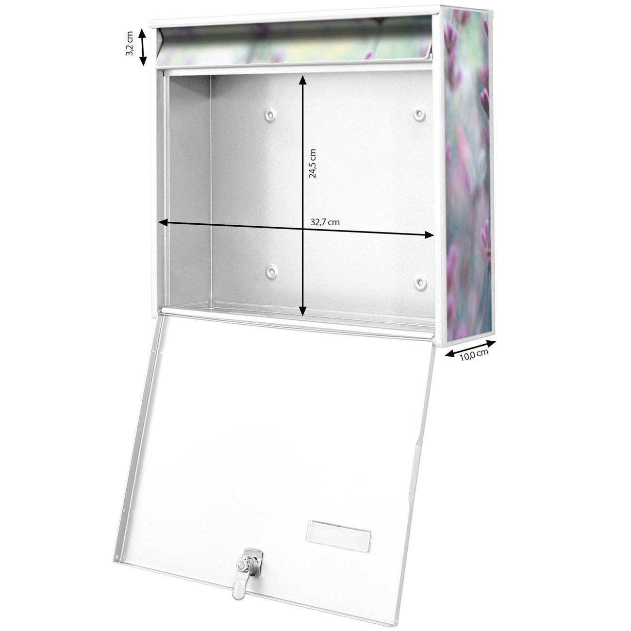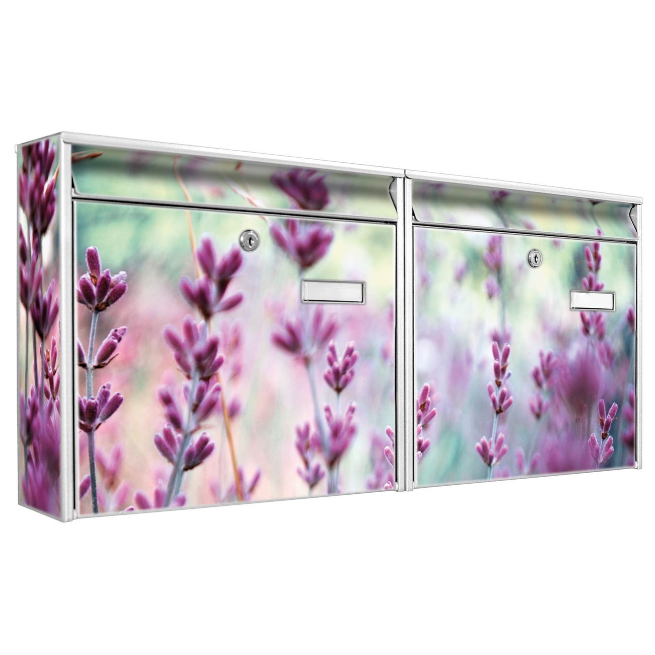 FUNKTION: Die Burg Wächter doppel Briefkastenanlage mit Motiv Lavendel 2 bietet Ihnen ein großes Fassungsvermögen, sodass auch A4 Sendungen eingeworfen werden können. Das Namensschild lässt sich individuell beschriften. DESIGN: Die 2 Briefkästen mit Lavendel 2 Motiv haben ein sehr ansprechendes und zeitloses Design. Heben Sie Sich von der tristen grauen Masse ab, ohne auf Funktionalität zu verzichten. Sie erhalten 2 Schlüssel sowie das Montagematerial. DETAILS: Der Doppelbriefkasten besteht aus verzinktem Stahl weiß. Er ist 72,5cm x 32,2cm x 10cm groß. Das Motiv besteht aus einer wetter- und UV-festen Folie, die Ihren Briefkasten zusätzlich vor Kratzern schützt. NUTZEN: Die stabile Bauart sowie die Wetterfestigkeit machen diese doppel Briefkästen zu einem zuverlässigen Begleiter im Alltag. Effektvoll in Reihe gehangen schmückt die Anlage jede Hauswand. BANJADO: Ihr Briefkasten wird in Sachsen in einer kleinen Manufaktur von Hand veredelt. Die Motivfolie ist lösungsmittelfrei und schutzlaminiert für einen langen Halt. Wir legen großen Wert auf die Verbindung von Funktionalität und Design. Sie erhalten Handarbeit aus Sachsen.