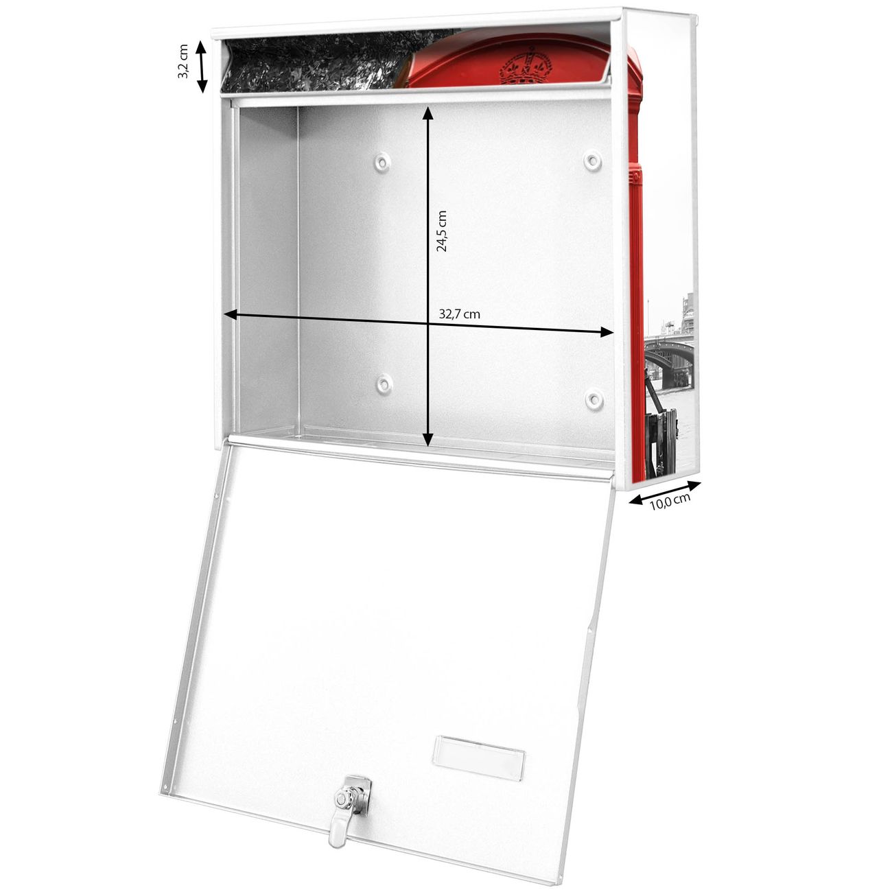 FUNKTION: Die Burg Wächter doppel Briefkastenanlage mit Motiv London Red Telephone bietet Ihnen ein großes Fassungsvermögen, sodass auch A4 Sendungen eingeworfen werden können. Das Namensschild lässt sich individuell beschriften. DESIGN: Die 2 Briefkästen mit London Red Telephone Motiv haben ein sehr ansprechendes und zeitloses Design. Heben Sie Sich von der tristen grauen Masse ab, ohne auf Funktionalität zu verzichten. Sie erhalten 2 Schlüssel sowie das Montagematerial. DETAILS: Der Doppelbriefkasten besteht aus verzinktem Stahl weiß. Er ist 72,5cm x 32,2cm x 10cm groß. Das Motiv besteht aus einer wetter- und UV-festen Folie, die Ihren Briefkasten zusätzlich vor Kratzern schützt. NUTZEN: Die stabile Bauart sowie die Wetterfestigkeit machen diese doppel Briefkästen zu einem zuverlässigen Begleiter im Alltag. Effektvoll in Reihe gehangen schmückt die Anlage jede Hauswand. BANJADO: Ihr Briefkasten wird in Sachsen in einer kleinen Manufaktur von Hand veredelt. Die Motivfolie ist lösungsmittelfrei und schutzlaminiert für einen langen Halt. Wir legen großen Wert auf die Verbindung von Funktionalität und Design. Sie erhalten Handarbeit aus Sachsen.