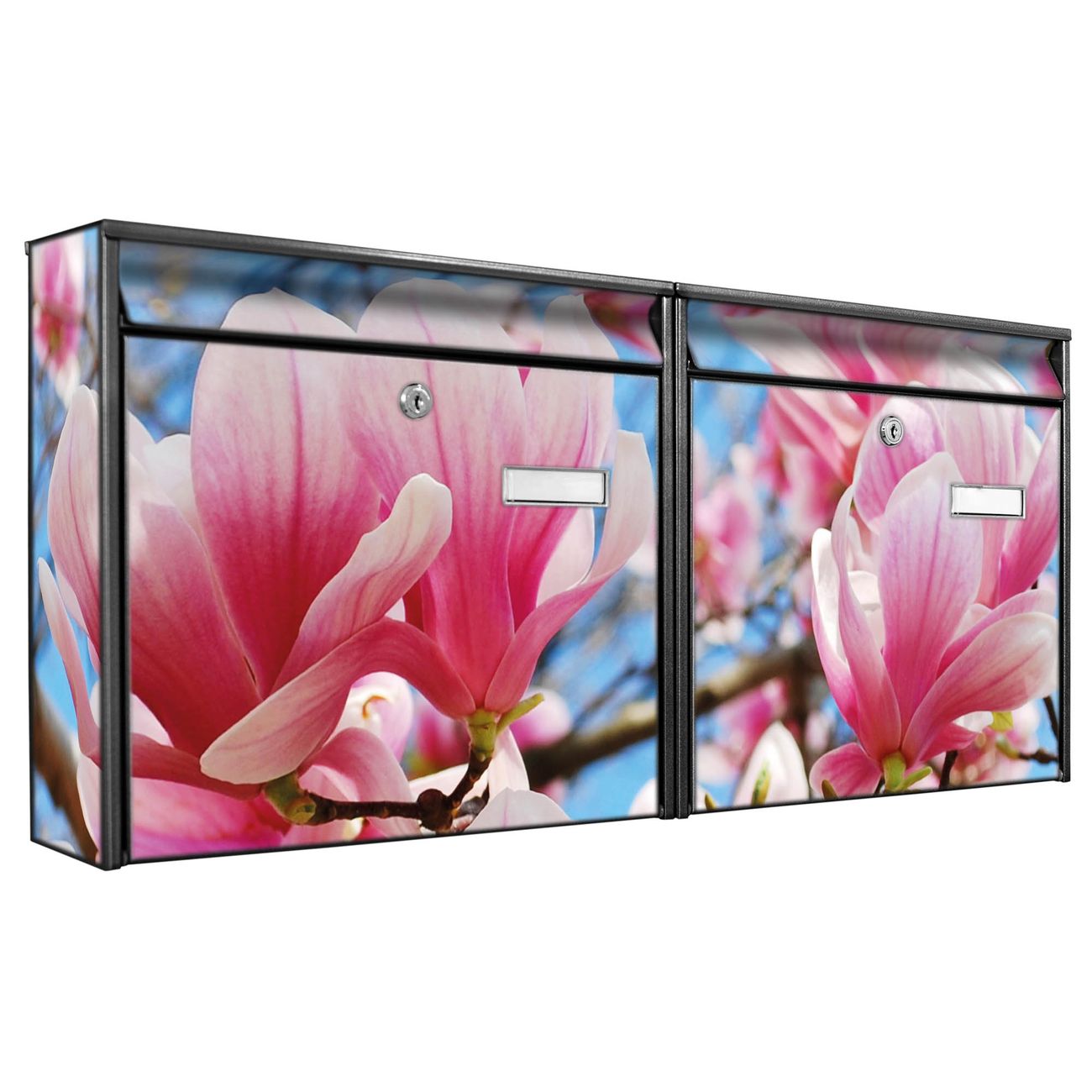 FUNKTION: Die Burg Wächter doppel Briefkastenanlage mit Motiv Magnolienbaum bietet Ihnen ein großes Fassungsvermögen, sodass auch A4 Sendungen eingeworfen werden können. Das Namensschild lässt sich individuell beschriften. DESIGN: Die 2 Briefkästen mit Magnolienbaum Motiv haben ein sehr ansprechendes und zeitloses Design. Heben Sie Sich von der tristen grauen Masse ab, ohne auf Funktionalität zu verzichten. Sie erhalten 2 Schlüssel sowie das Montagematerial. DETAILS: Der Doppelbriefkasten besteht aus verzinktem Stahl weiß. Er ist 72,5cm x 32,2cm x 10cm groß. Das Motiv besteht aus einer wetter- und UV-festen Folie, die Ihren Briefkasten zusätzlich vor Kratzern schützt. NUTZEN: Die stabile Bauart sowie die Wetterfestigkeit machen diese doppel Briefkästen zu einem zuverlässigen Begleiter im Alltag. Effektvoll in Reihe gehangen schmückt die Anlage jede Hauswand. BANJADO: Ihr Briefkasten wird in Sachsen in einer kleinen Manufaktur von Hand veredelt. Die Motivfolie ist lösungsmittelfrei und schutzlaminiert für einen langen Halt. Wir legen großen Wert auf die Verbindung von Funktionalität und Design. Sie erhalten Handarbeit aus Sachsen.