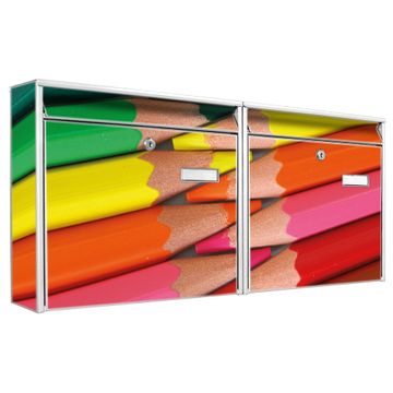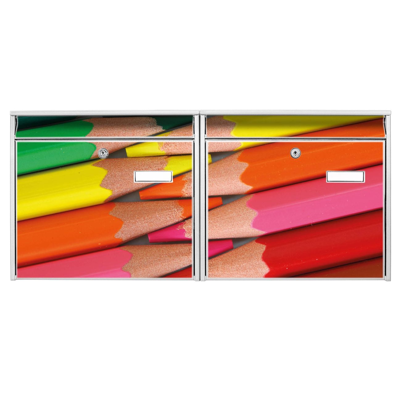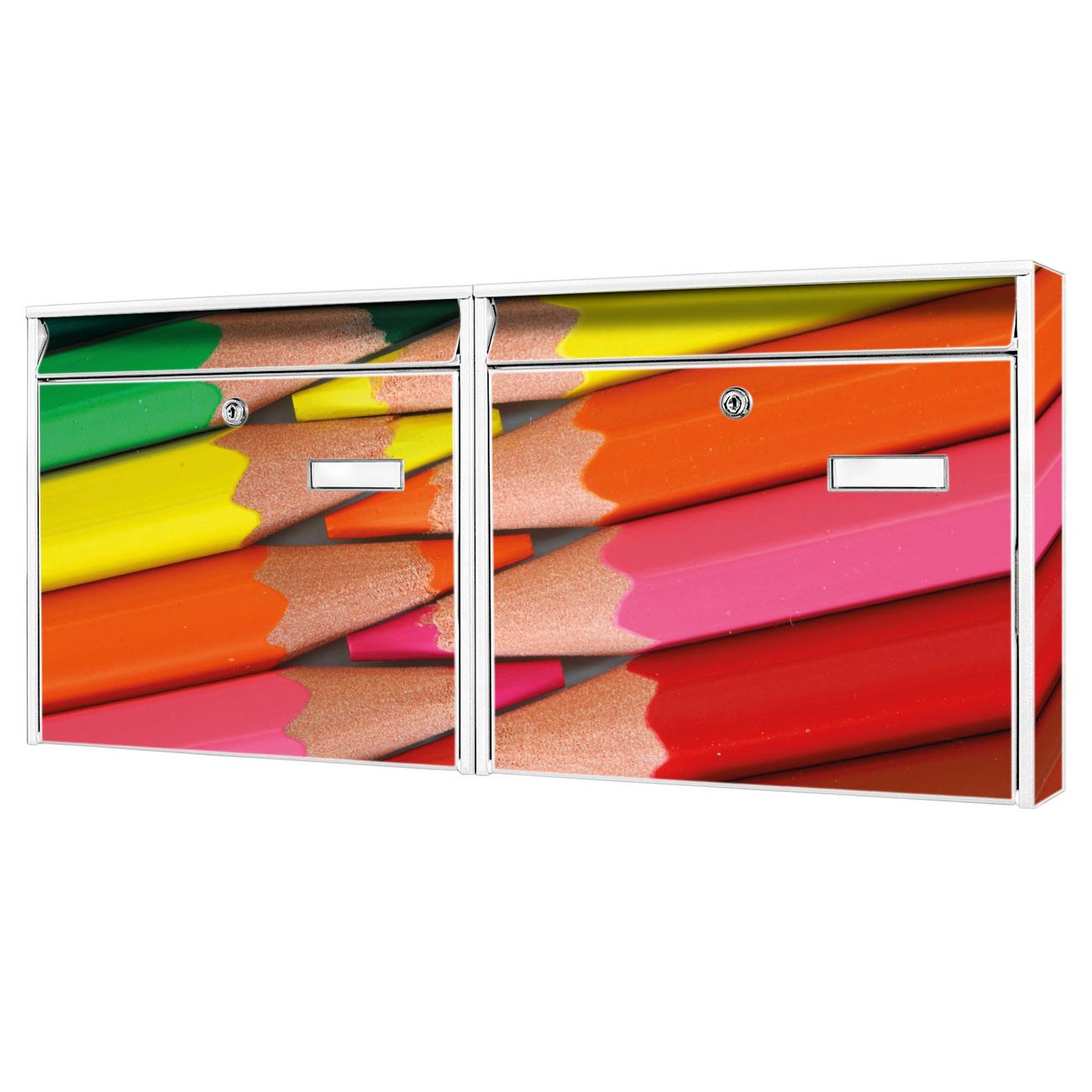 FUNKTION: Die Burg Wächter doppel Briefkastenanlage mit Motiv Malstifte bietet Ihnen ein großes Fassungsvermögen, sodass auch A4 Sendungen eingeworfen werden können. Das Namensschild lässt sich individuell beschriften. DESIGN: Die 2 Briefkästen mit Malstifte Motiv haben ein sehr ansprechendes und zeitloses Design. Heben Sie Sich von der tristen grauen Masse ab, ohne auf Funktionalität zu verzichten. Sie erhalten 2 Schlüssel sowie das Montagematerial. DETAILS: Der Doppelbriefkasten besteht aus verzinktem Stahl weiß. Er ist 72,5cm x 32,2cm x 10cm groß. Das Motiv besteht aus einer wetter- und UV-festen Folie, die Ihren Briefkasten zusätzlich vor Kratzern schützt. NUTZEN: Die stabile Bauart sowie die Wetterfestigkeit machen diese doppel Briefkästen zu einem zuverlässigen Begleiter im Alltag. Effektvoll in Reihe gehangen schmückt die Anlage jede Hauswand. BANJADO: Ihr Briefkasten wird in Sachsen in einer kleinen Manufaktur von Hand veredelt. Die Motivfolie ist lösungsmittelfrei und schutzlaminiert für einen langen Halt. Wir legen großen Wert auf die Verbindung von Funktionalität und Design. Sie erhalten Handarbeit aus Sachsen.
