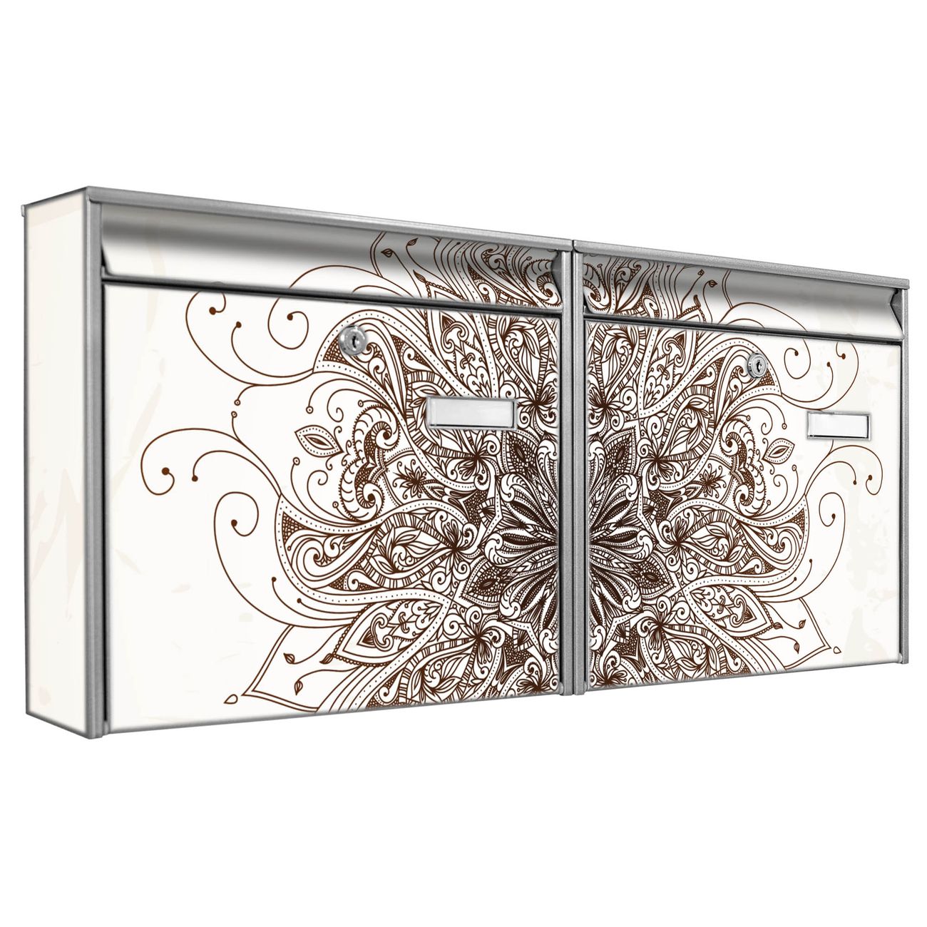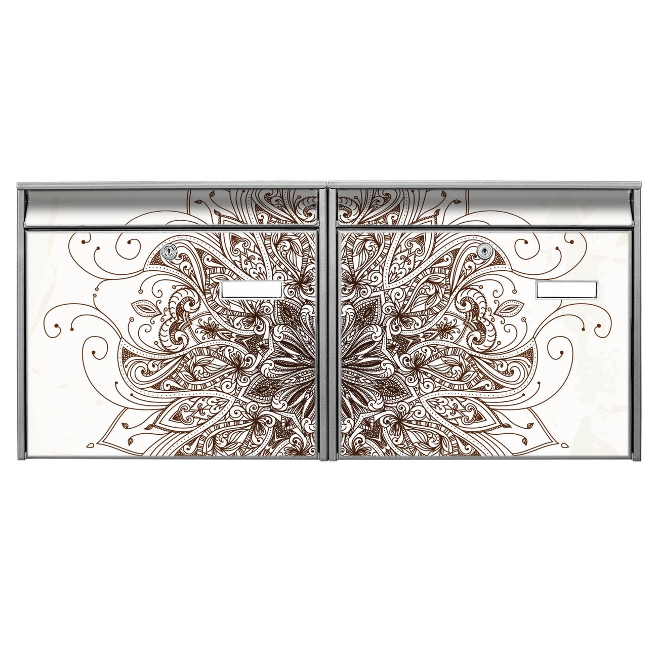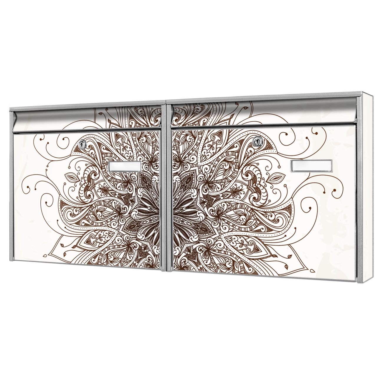 FUNKTION: Die Burg Wächter doppel Briefkastenanlage mit Motiv Mehendi bietet Ihnen ein großes Fassungsvermögen, sodass auch A4 Sendungen eingeworfen werden können. Das Namensschild lässt sich individuell beschriften. DESIGN: Die 2 Briefkästen mit Mehendi Motiv haben ein sehr ansprechendes und zeitloses Design. Heben Sie Sich von der tristen grauen Masse ab, ohne auf Funktionalität zu verzichten. Sie erhalten 2 Schlüssel sowie das Montagematerial. DETAILS: Der Doppelbriefkasten besteht aus verzinktem Stahl weiß. Er ist 72,5cm x 32,2cm x 10cm groß. Das Motiv besteht aus einer wetter- und UV-festen Folie, die Ihren Briefkasten zusätzlich vor Kratzern schützt. NUTZEN: Die stabile Bauart sowie die Wetterfestigkeit machen diese doppel Briefkästen zu einem zuverlässigen Begleiter im Alltag. Effektvoll in Reihe gehangen schmückt die Anlage jede Hauswand. BANJADO: Ihr Briefkasten wird in Sachsen in einer kleinen Manufaktur von Hand veredelt. Die Motivfolie ist lösungsmittelfrei und schutzlaminiert für einen langen Halt. Wir legen großen Wert auf die Verbindung von Funktionalität und Design. Sie erhalten Handarbeit aus Sachsen.