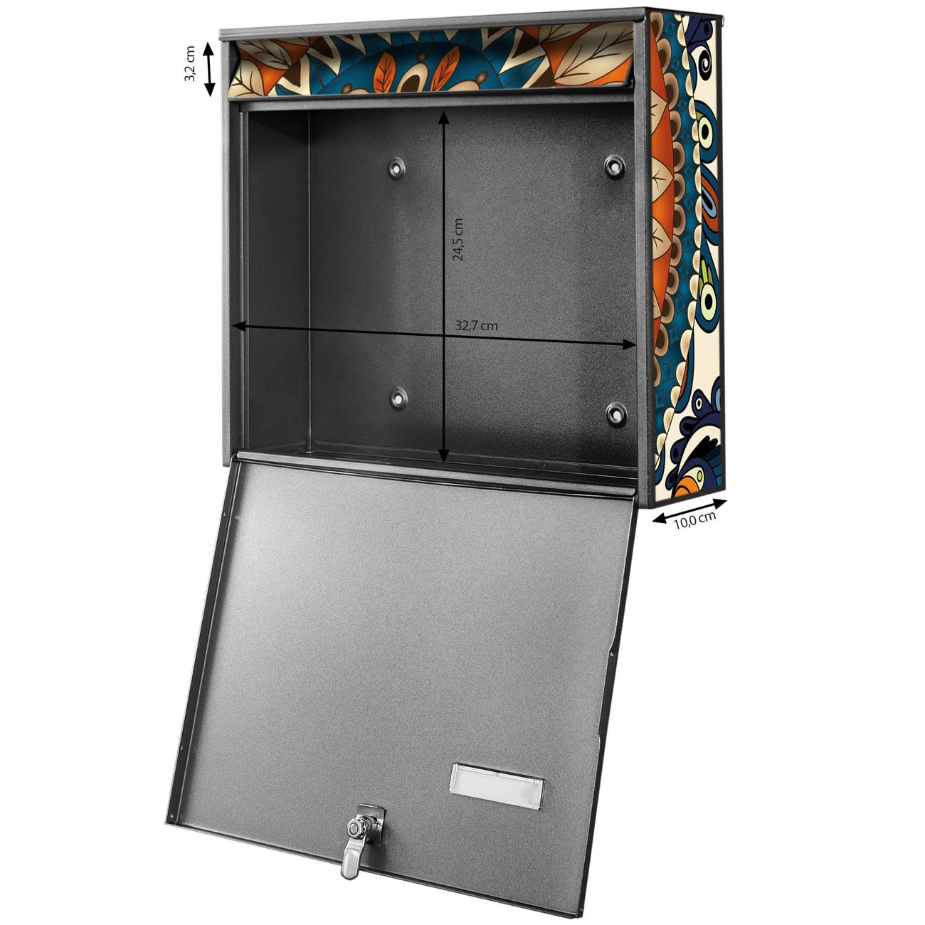 FUNKTION: Die Burg Wächter doppel Briefkastenanlage mit Motiv Modernes Mandala bietet Ihnen ein großes Fassungsvermögen, sodass auch A4 Sendungen eingeworfen werden können. Das Namensschild lässt sich individuell beschriften. DESIGN: Die 2 Briefkästen mit Modernes Mandala Motiv haben ein sehr ansprechendes und zeitloses Design. Heben Sie Sich von der tristen grauen Masse ab, ohne auf Funktionalität zu verzichten. Sie erhalten 2 Schlüssel sowie das Montagematerial. DETAILS: Der Doppelbriefkasten besteht aus verzinktem Stahl weiß. Er ist 72,5cm x 32,2cm x 10cm groß. Das Motiv besteht aus einer wetter- und UV-festen Folie, die Ihren Briefkasten zusätzlich vor Kratzern schützt. NUTZEN: Die stabile Bauart sowie die Wetterfestigkeit machen diese doppel Briefkästen zu einem zuverlässigen Begleiter im Alltag. Effektvoll in Reihe gehangen schmückt die Anlage jede Hauswand. BANJADO: Ihr Briefkasten wird in Sachsen in einer kleinen Manufaktur von Hand veredelt. Die Motivfolie ist lösungsmittelfrei und schutzlaminiert für einen langen Halt. Wir legen großen Wert auf die Verbindung von Funktionalität und Design. Sie erhalten Handarbeit aus Sachsen.