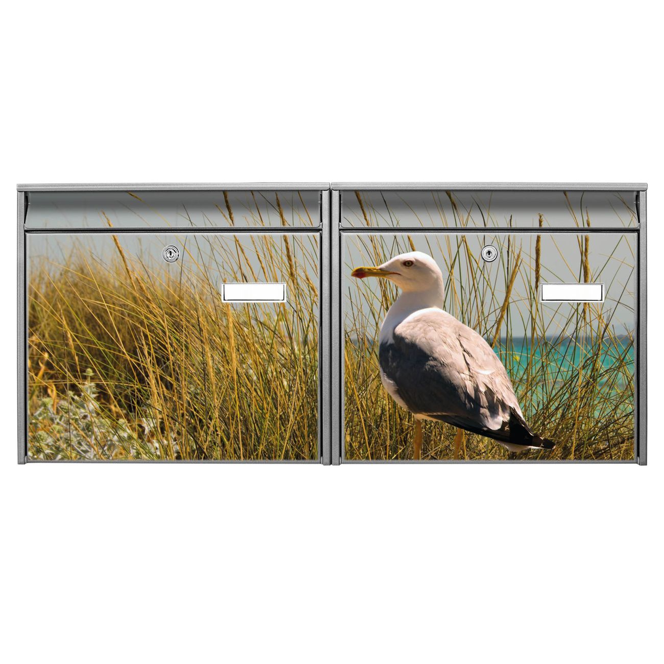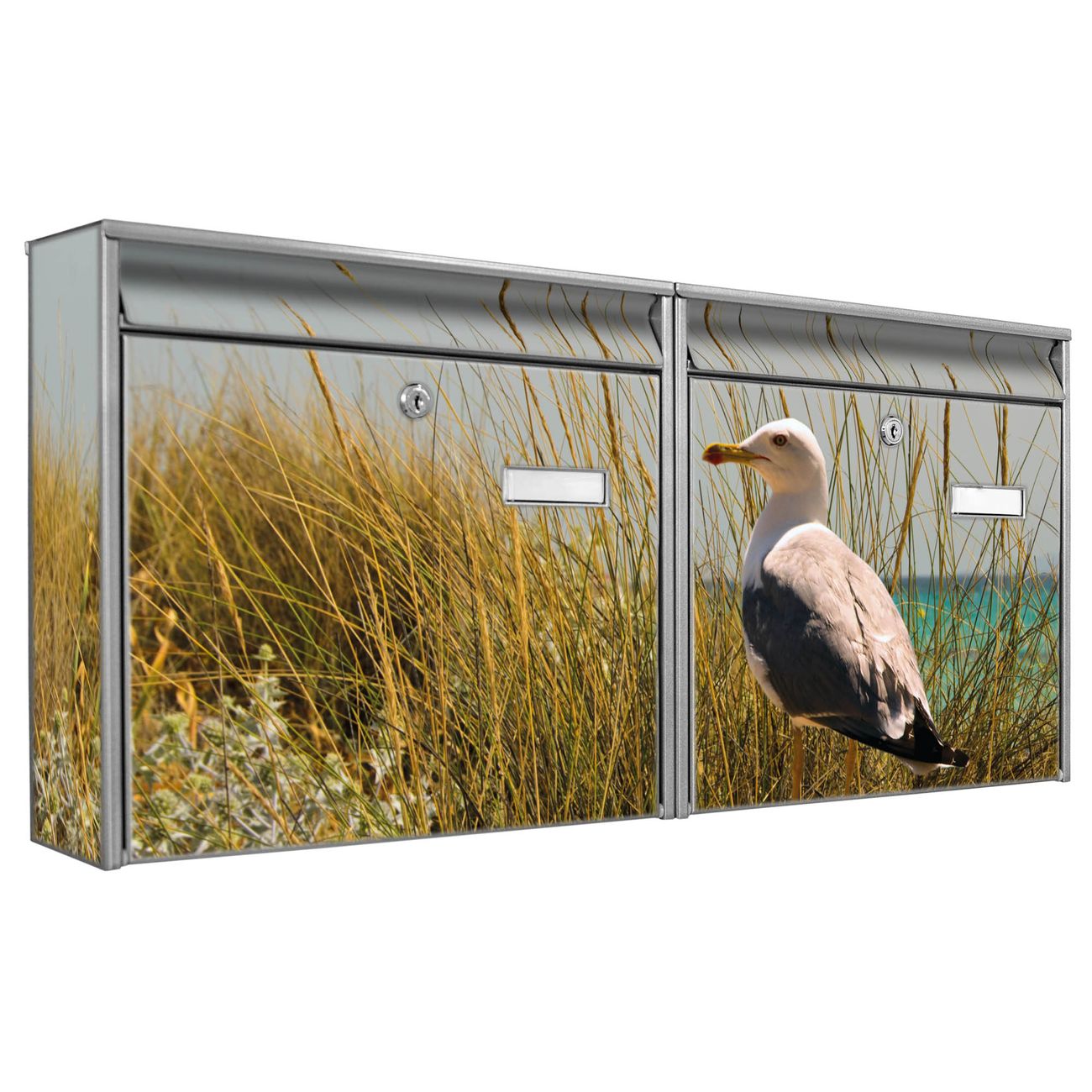 FUNKTION: Die Burg Wächter doppel Briefkastenanlage mit Motiv Möwen bietet Ihnen ein großes Fassungsvermögen, sodass auch A4 Sendungen eingeworfen werden können. Das Namensschild lässt sich individuell beschriften. DESIGN: Die 2 Briefkästen mit Möwen Motiv haben ein sehr ansprechendes und zeitloses Design. Heben Sie Sich von der tristen grauen Masse ab, ohne auf Funktionalität zu verzichten. Sie erhalten 2 Schlüssel sowie das Montagematerial. DETAILS: Der Doppelbriefkasten besteht aus verzinktem Stahl weiß. Er ist 72,5cm x 32,2cm x 10cm groß. Das Motiv besteht aus einer wetter- und UV-festen Folie, die Ihren Briefkasten zusätzlich vor Kratzern schützt. NUTZEN: Die stabile Bauart sowie die Wetterfestigkeit machen diese doppel Briefkästen zu einem zuverlässigen Begleiter im Alltag. Effektvoll in Reihe gehangen schmückt die Anlage jede Hauswand. BANJADO: Ihr Briefkasten wird in Sachsen in einer kleinen Manufaktur von Hand veredelt. Die Motivfolie ist lösungsmittelfrei und schutzlaminiert für einen langen Halt. Wir legen großen Wert auf die Verbindung von Funktionalität und Design. Sie erhalten Handarbeit aus Sachsen.
