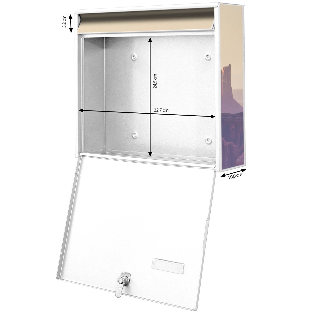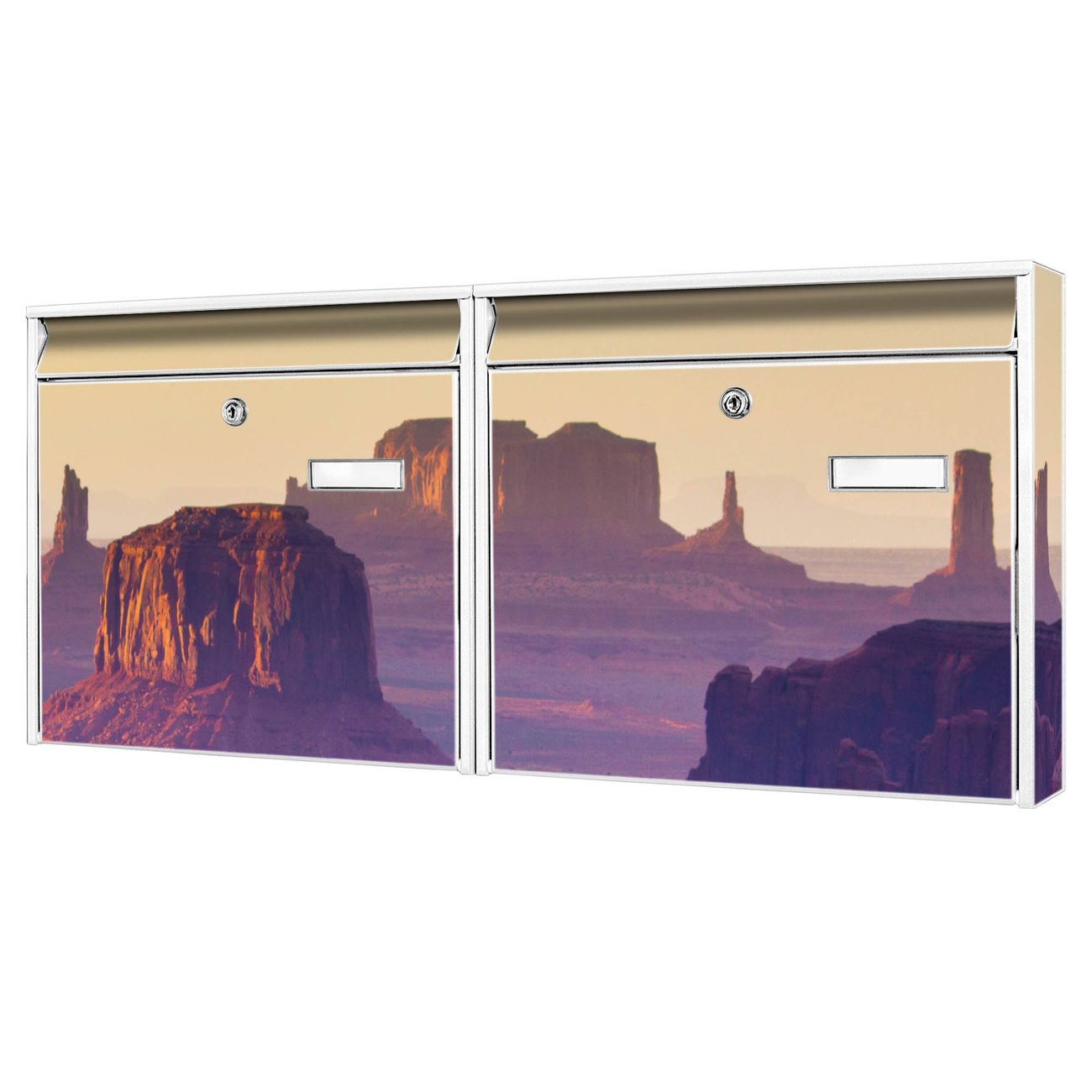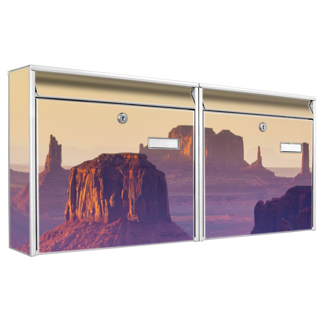 FUNKTION: Die Burg Wächter doppel Briefkastenanlage mit Motiv Monument Valley bietet Ihnen ein großes Fassungsvermögen, sodass auch A4 Sendungen eingeworfen werden können. Das Namensschild lässt sich individuell beschriften. DESIGN: Die 2 Briefkästen mit Monument Valley Motiv haben ein sehr ansprechendes und zeitloses Design. Heben Sie Sich von der tristen grauen Masse ab, ohne auf Funktionalität zu verzichten. Sie erhalten 2 Schlüssel sowie das Montagematerial. DETAILS: Der Doppelbriefkasten besteht aus verzinktem Stahl weiß. Er ist 72,5cm x 32,2cm x 10cm groß. Das Motiv besteht aus einer wetter- und UV-festen Folie, die Ihren Briefkasten zusätzlich vor Kratzern schützt. NUTZEN: Die stabile Bauart sowie die Wetterfestigkeit machen diese doppel Briefkästen zu einem zuverlässigen Begleiter im Alltag. Effektvoll in Reihe gehangen schmückt die Anlage jede Hauswand. BANJADO: Ihr Briefkasten wird in Sachsen in einer kleinen Manufaktur von Hand veredelt. Die Motivfolie ist lösungsmittelfrei und schutzlaminiert für einen langen Halt. Wir legen großen Wert auf die Verbindung von Funktionalität und Design. Sie erhalten Handarbeit aus Sachsen.