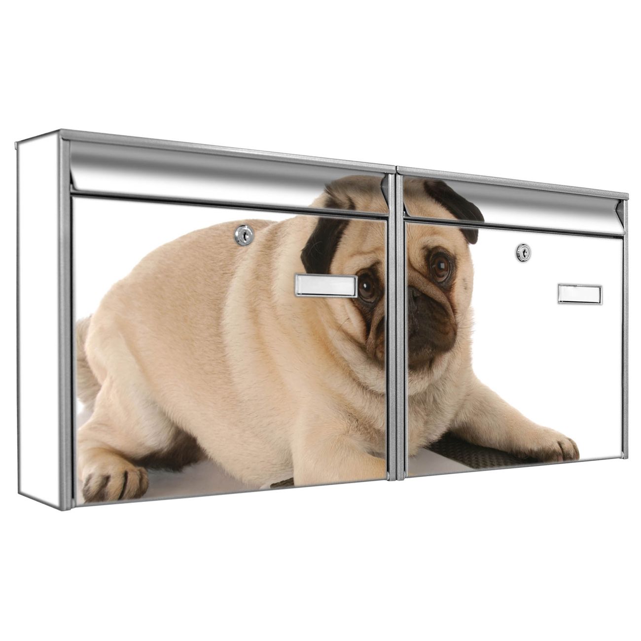 FUNKTION: Die Burg Wächter doppel Briefkastenanlage mit Motiv Mops bietet Ihnen ein großes Fassungsvermögen, sodass auch A4 Sendungen eingeworfen werden können. Das Namensschild lässt sich individuell beschriften. DESIGN: Die 2 Briefkästen mit Mops Motiv haben ein sehr ansprechendes und zeitloses Design. Heben Sie Sich von der tristen grauen Masse ab, ohne auf Funktionalität zu verzichten. Sie erhalten 2 Schlüssel sowie das Montagematerial. DETAILS: Der Doppelbriefkasten besteht aus verzinktem Stahl weiß. Er ist 72,5cm x 32,2cm x 10cm groß. Das Motiv besteht aus einer wetter- und UV-festen Folie, die Ihren Briefkasten zusätzlich vor Kratzern schützt. NUTZEN: Die stabile Bauart sowie die Wetterfestigkeit machen diese doppel Briefkästen zu einem zuverlässigen Begleiter im Alltag. Effektvoll in Reihe gehangen schmückt die Anlage jede Hauswand. BANJADO: Ihr Briefkasten wird in Sachsen in einer kleinen Manufaktur von Hand veredelt. Die Motivfolie ist lösungsmittelfrei und schutzlaminiert für einen langen Halt. Wir legen großen Wert auf die Verbindung von Funktionalität und Design. Sie erhalten Handarbeit aus Sachsen.