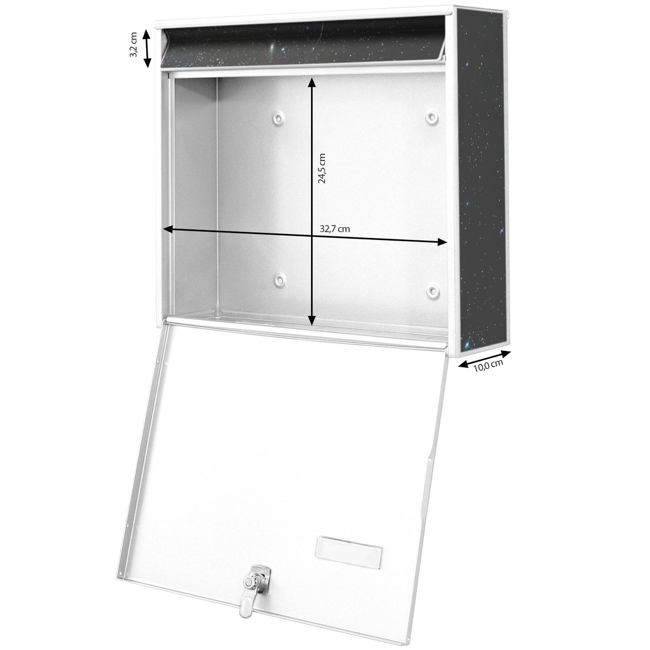 FUNKTION: Die Burg Wächter doppel Briefkastenanlage mit Motiv Nachthimmel bietet Ihnen ein großes Fassungsvermögen, sodass auch A4 Sendungen eingeworfen werden können. Das Namensschild lässt sich individuell beschriften. DESIGN: Die 2 Briefkästen mit Nachthimmel Motiv haben ein sehr ansprechendes und zeitloses Design. Heben Sie Sich von der tristen grauen Masse ab, ohne auf Funktionalität zu verzichten. Sie erhalten 2 Schlüssel sowie das Montagematerial. DETAILS: Der Doppelbriefkasten besteht aus verzinktem Stahl weiß. Er ist 72,5cm x 32,2cm x 10cm groß. Das Motiv besteht aus einer wetter- und UV-festen Folie, die Ihren Briefkasten zusätzlich vor Kratzern schützt. NUTZEN: Die stabile Bauart sowie die Wetterfestigkeit machen diese doppel Briefkästen zu einem zuverlässigen Begleiter im Alltag. Effektvoll in Reihe gehangen schmückt die Anlage jede Hauswand. BANJADO: Ihr Briefkasten wird in Sachsen in einer kleinen Manufaktur von Hand veredelt. Die Motivfolie ist lösungsmittelfrei und schutzlaminiert für einen langen Halt. Wir legen großen Wert auf die Verbindung von Funktionalität und Design. Sie erhalten Handarbeit aus Sachsen.
