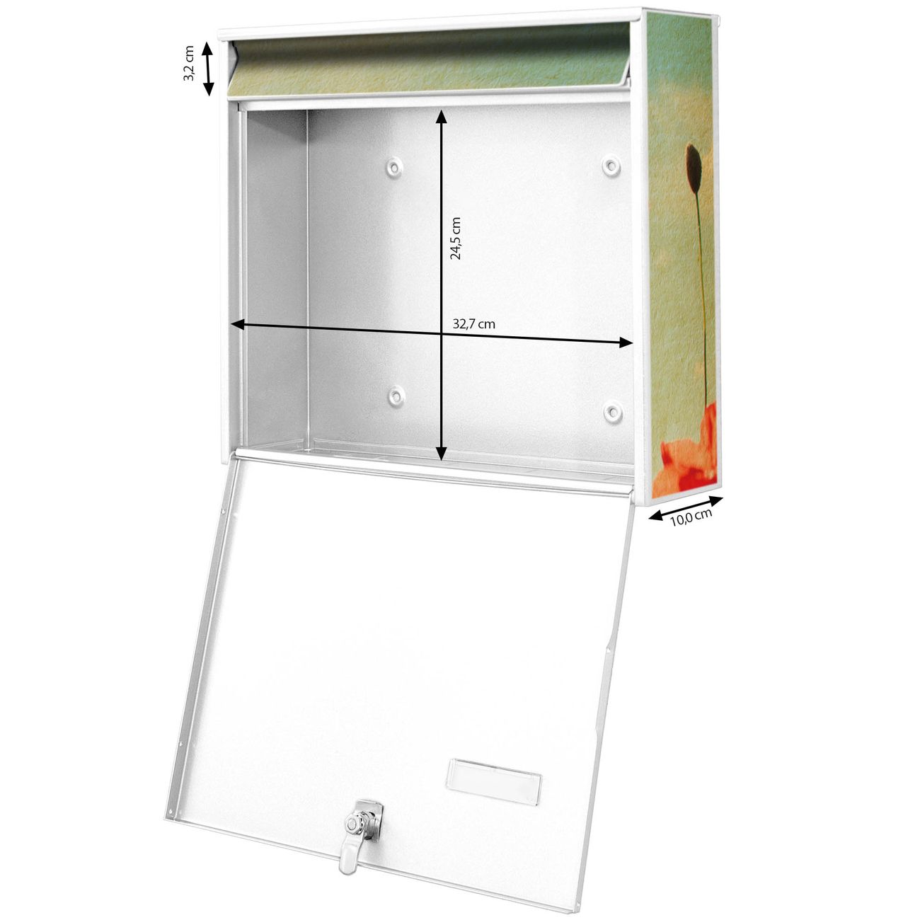 FUNKTION: Die Burg Wächter doppel Briefkastenanlage mit Motiv Oktobermohn bietet Ihnen ein großes Fassungsvermögen, sodass auch A4 Sendungen eingeworfen werden können. Das Namensschild lässt sich individuell beschriften. DESIGN: Die 2 Briefkästen mit Oktobermohn Motiv haben ein sehr ansprechendes und zeitloses Design. Heben Sie Sich von der tristen grauen Masse ab, ohne auf Funktionalität zu verzichten. Sie erhalten 2 Schlüssel sowie das Montagematerial. DETAILS: Der Doppelbriefkasten besteht aus verzinktem Stahl weiß. Er ist 72,5cm x 32,2cm x 10cm groß. Das Motiv besteht aus einer wetter- und UV-festen Folie, die Ihren Briefkasten zusätzlich vor Kratzern schützt. NUTZEN: Die stabile Bauart sowie die Wetterfestigkeit machen diese doppel Briefkästen zu einem zuverlässigen Begleiter im Alltag. Effektvoll in Reihe gehangen schmückt die Anlage jede Hauswand. BANJADO: Ihr Briefkasten wird in Sachsen in einer kleinen Manufaktur von Hand veredelt. Die Motivfolie ist lösungsmittelfrei und schutzlaminiert für einen langen Halt. Wir legen großen Wert auf die Verbindung von Funktionalität und Design. Sie erhalten Handarbeit aus Sachsen.