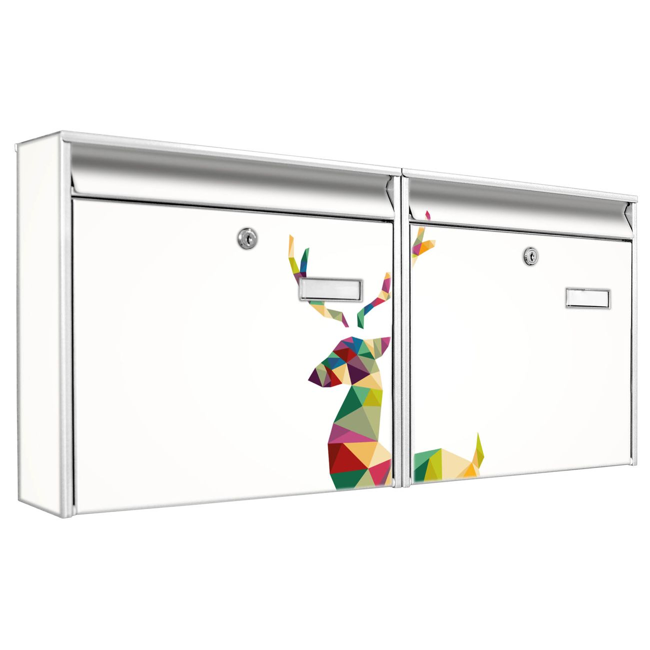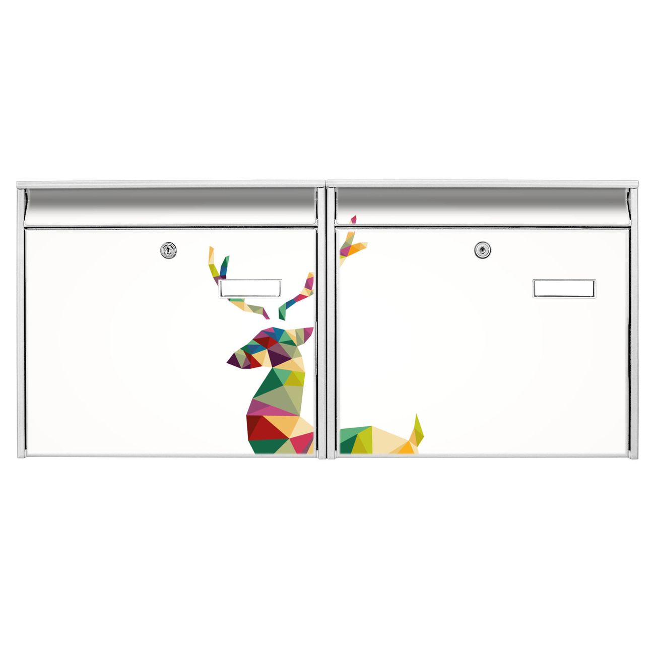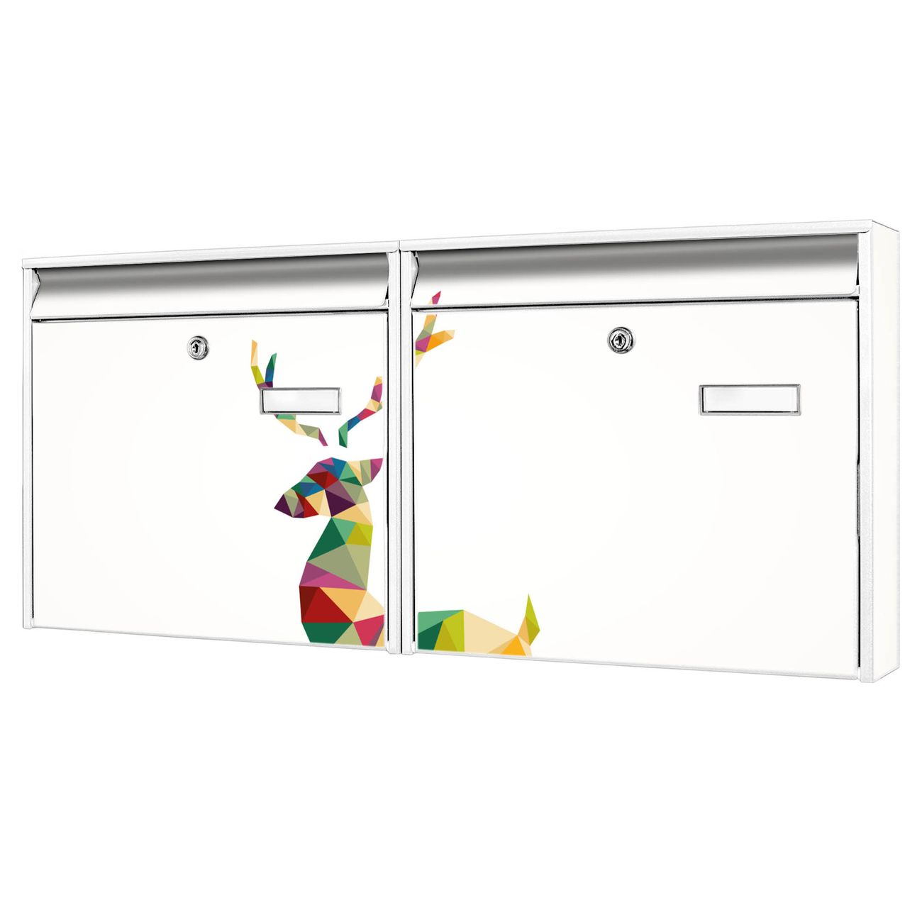 FUNKTION: Die Burg Wächter doppel Briefkastenanlage mit Motiv Origami Hirsch bietet Ihnen ein großes Fassungsvermögen, sodass auch A4 Sendungen eingeworfen werden können. Das Namensschild lässt sich individuell beschriften. DESIGN: Die 2 Briefkästen mit Origami Hirsch Motiv haben ein sehr ansprechendes und zeitloses Design. Heben Sie Sich von der tristen grauen Masse ab, ohne auf Funktionalität zu verzichten. Sie erhalten 2 Schlüssel sowie das Montagematerial. DETAILS: Der Doppelbriefkasten besteht aus verzinktem Stahl weiß. Er ist 72,5cm x 32,2cm x 10cm groß. Das Motiv besteht aus einer wetter- und UV-festen Folie, die Ihren Briefkasten zusätzlich vor Kratzern schützt. NUTZEN: Die stabile Bauart sowie die Wetterfestigkeit machen diese doppel Briefkästen zu einem zuverlässigen Begleiter im Alltag. Effektvoll in Reihe gehangen schmückt die Anlage jede Hauswand. BANJADO: Ihr Briefkasten wird in Sachsen in einer kleinen Manufaktur von Hand veredelt. Die Motivfolie ist lösungsmittelfrei und schutzlaminiert für einen langen Halt. Wir legen großen Wert auf die Verbindung von Funktionalität und Design. Sie erhalten Handarbeit aus Sachsen.