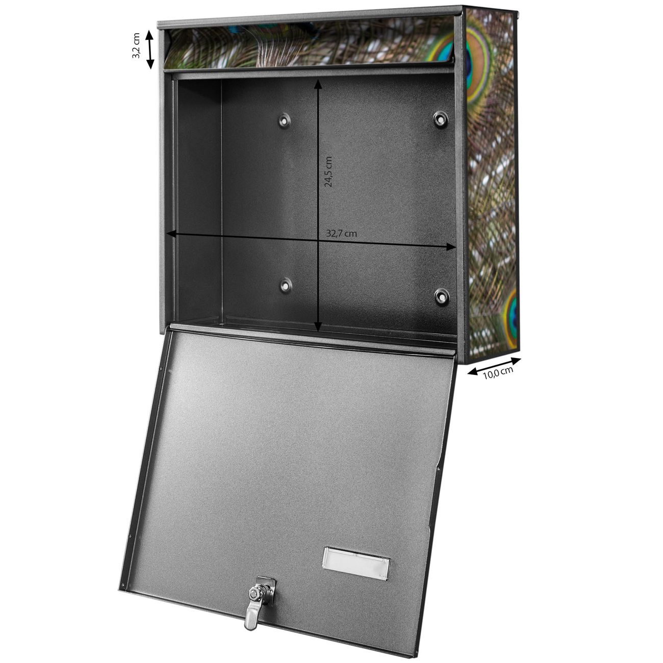 FUNKTION: Die Burg Wächter doppel Briefkastenanlage mit Motiv Pfau bietet Ihnen ein großes Fassungsvermögen, sodass auch A4 Sendungen eingeworfen werden können. Das Namensschild lässt sich individuell beschriften. DESIGN: Die 2 Briefkästen mit Pfau Motiv haben ein sehr ansprechendes und zeitloses Design. Heben Sie Sich von der tristen grauen Masse ab, ohne auf Funktionalität zu verzichten. Sie erhalten 2 Schlüssel sowie das Montagematerial. DETAILS: Der Doppelbriefkasten besteht aus verzinktem Stahl weiß. Er ist 72,5cm x 32,2cm x 10cm groß. Das Motiv besteht aus einer wetter- und UV-festen Folie, die Ihren Briefkasten zusätzlich vor Kratzern schützt. NUTZEN: Die stabile Bauart sowie die Wetterfestigkeit machen diese doppel Briefkästen zu einem zuverlässigen Begleiter im Alltag. Effektvoll in Reihe gehangen schmückt die Anlage jede Hauswand. BANJADO: Ihr Briefkasten wird in Sachsen in einer kleinen Manufaktur von Hand veredelt. Die Motivfolie ist lösungsmittelfrei und schutzlaminiert für einen langen Halt. Wir legen großen Wert auf die Verbindung von Funktionalität und Design. Sie erhalten Handarbeit aus Sachsen.