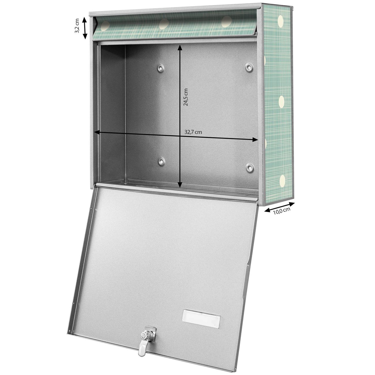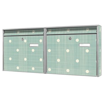 FUNKTION: Die Burg Wächter doppel Briefkastenanlage mit Motiv Punkte Lindgrün bietet Ihnen ein großes Fassungsvermögen, sodass auch A4 Sendungen eingeworfen werden können. Das Namensschild lässt sich individuell beschriften. DESIGN: Die 2 Briefkästen mit Punkte Lindgrün Motiv haben ein sehr ansprechendes und zeitloses Design. Heben Sie Sich von der tristen grauen Masse ab, ohne auf Funktionalität zu verzichten. Sie erhalten 2 Schlüssel sowie das Montagematerial. DETAILS: Der Doppelbriefkasten besteht aus verzinktem Stahl weiß. Er ist 72,5cm x 32,2cm x 10cm groß. Das Motiv besteht aus einer wetter- und UV-festen Folie, die Ihren Briefkasten zusätzlich vor Kratzern schützt. NUTZEN: Die stabile Bauart sowie die Wetterfestigkeit machen diese doppel Briefkästen zu einem zuverlässigen Begleiter im Alltag. Effektvoll in Reihe gehangen schmückt die Anlage jede Hauswand. BANJADO: Ihr Briefkasten wird in Sachsen in einer kleinen Manufaktur von Hand veredelt. Die Motivfolie ist lösungsmittelfrei und schutzlaminiert für einen langen Halt. Wir legen großen Wert auf die Verbindung von Funktionalität und Design. Sie erhalten Handarbeit aus Sachsen.