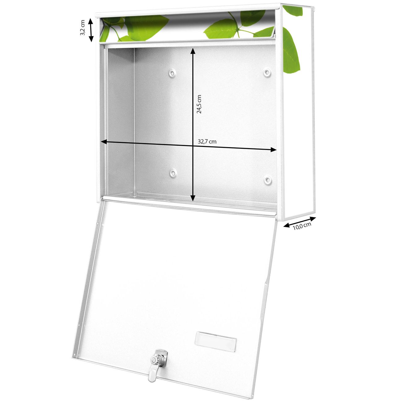 FUNKTION: Die Burg Wächter doppel Briefkastenanlage mit Motiv Rahmen Blätter bietet Ihnen ein großes Fassungsvermögen, sodass auch A4 Sendungen eingeworfen werden können. Das Namensschild lässt sich individuell beschriften. DESIGN: Die 2 Briefkästen mit Rahmen Blätter Motiv haben ein sehr ansprechendes und zeitloses Design. Heben Sie Sich von der tristen grauen Masse ab, ohne auf Funktionalität zu verzichten. Sie erhalten 2 Schlüssel sowie das Montagematerial. DETAILS: Der Doppelbriefkasten besteht aus verzinktem Stahl weiß. Er ist 72,5cm x 32,2cm x 10cm groß. Das Motiv besteht aus einer wetter- und UV-festen Folie, die Ihren Briefkasten zusätzlich vor Kratzern schützt. NUTZEN: Die stabile Bauart sowie die Wetterfestigkeit machen diese doppel Briefkästen zu einem zuverlässigen Begleiter im Alltag. Effektvoll in Reihe gehangen schmückt die Anlage jede Hauswand. BANJADO: Ihr Briefkasten wird in Sachsen in einer kleinen Manufaktur von Hand veredelt. Die Motivfolie ist lösungsmittelfrei und schutzlaminiert für einen langen Halt. Wir legen großen Wert auf die Verbindung von Funktionalität und Design. Sie erhalten Handarbeit aus Sachsen.