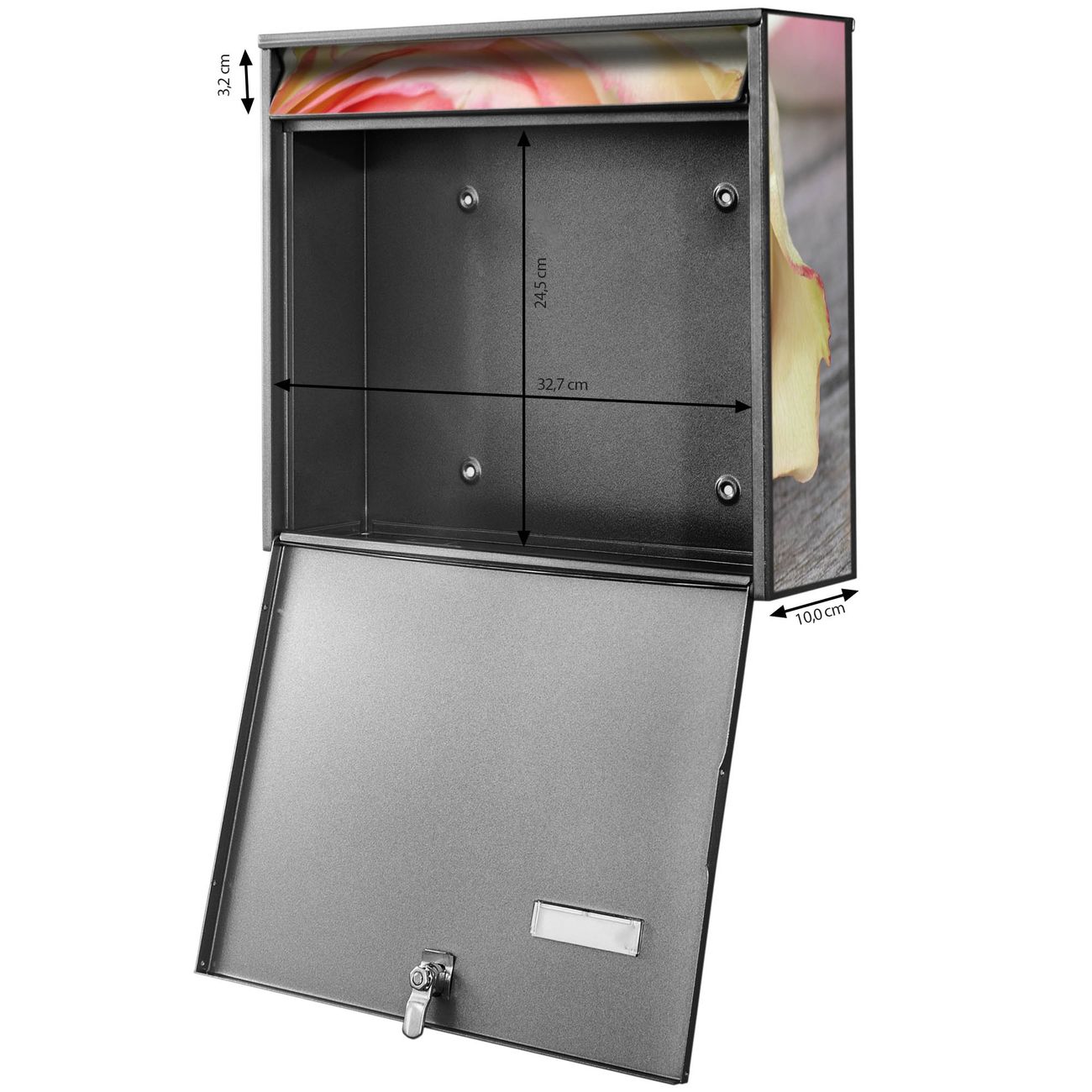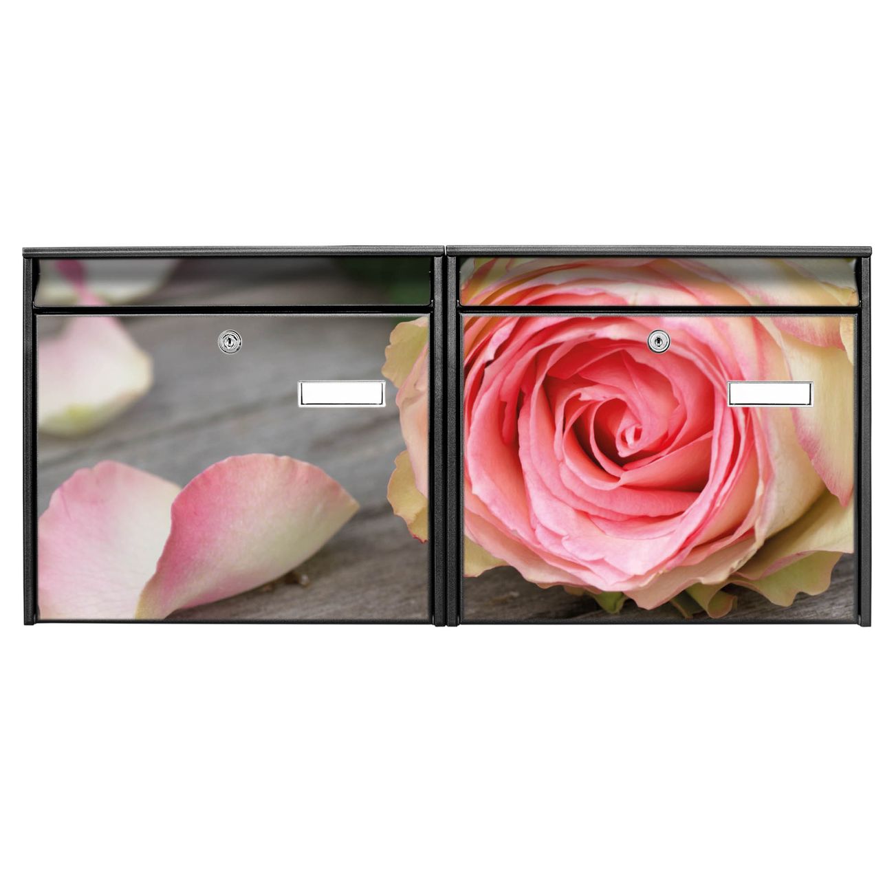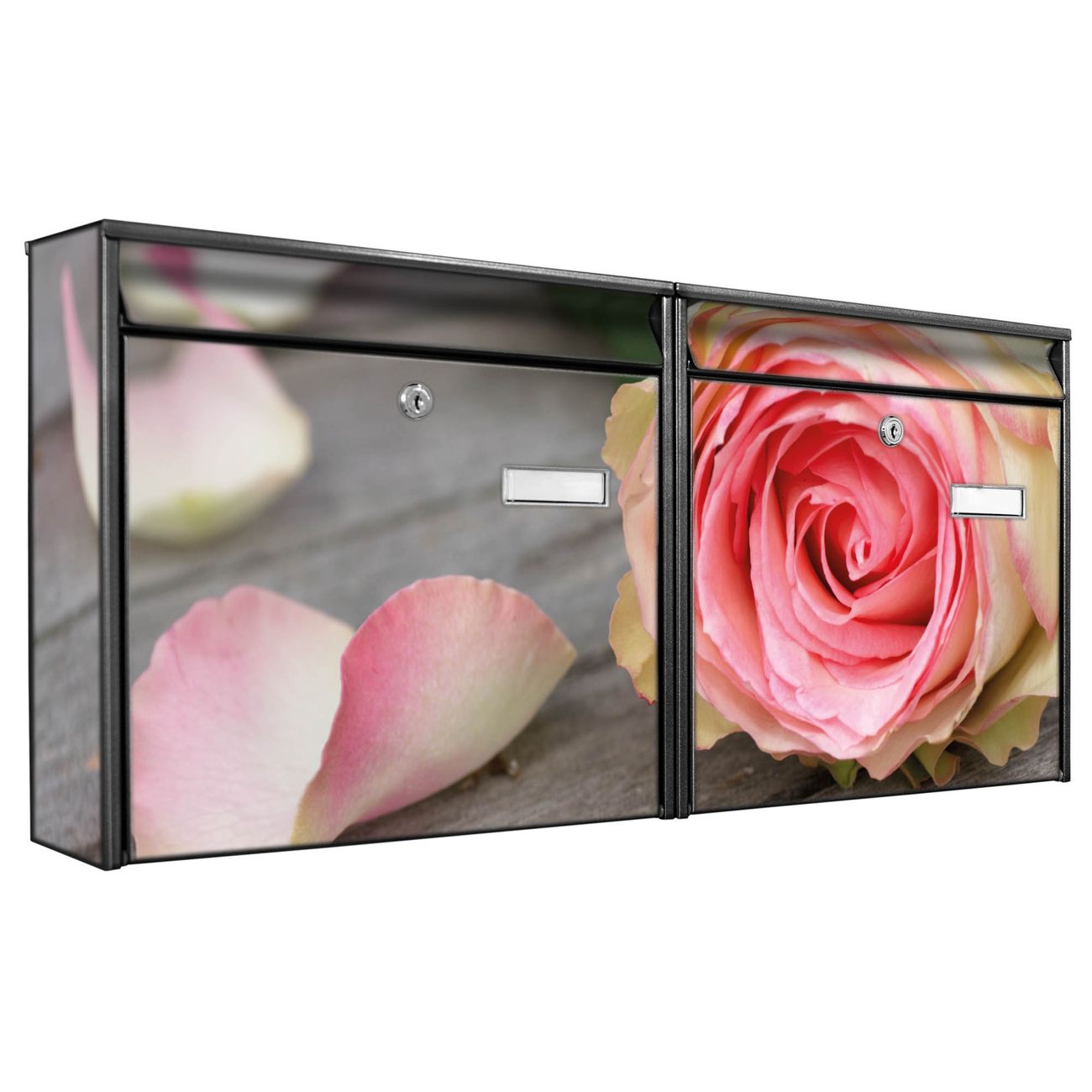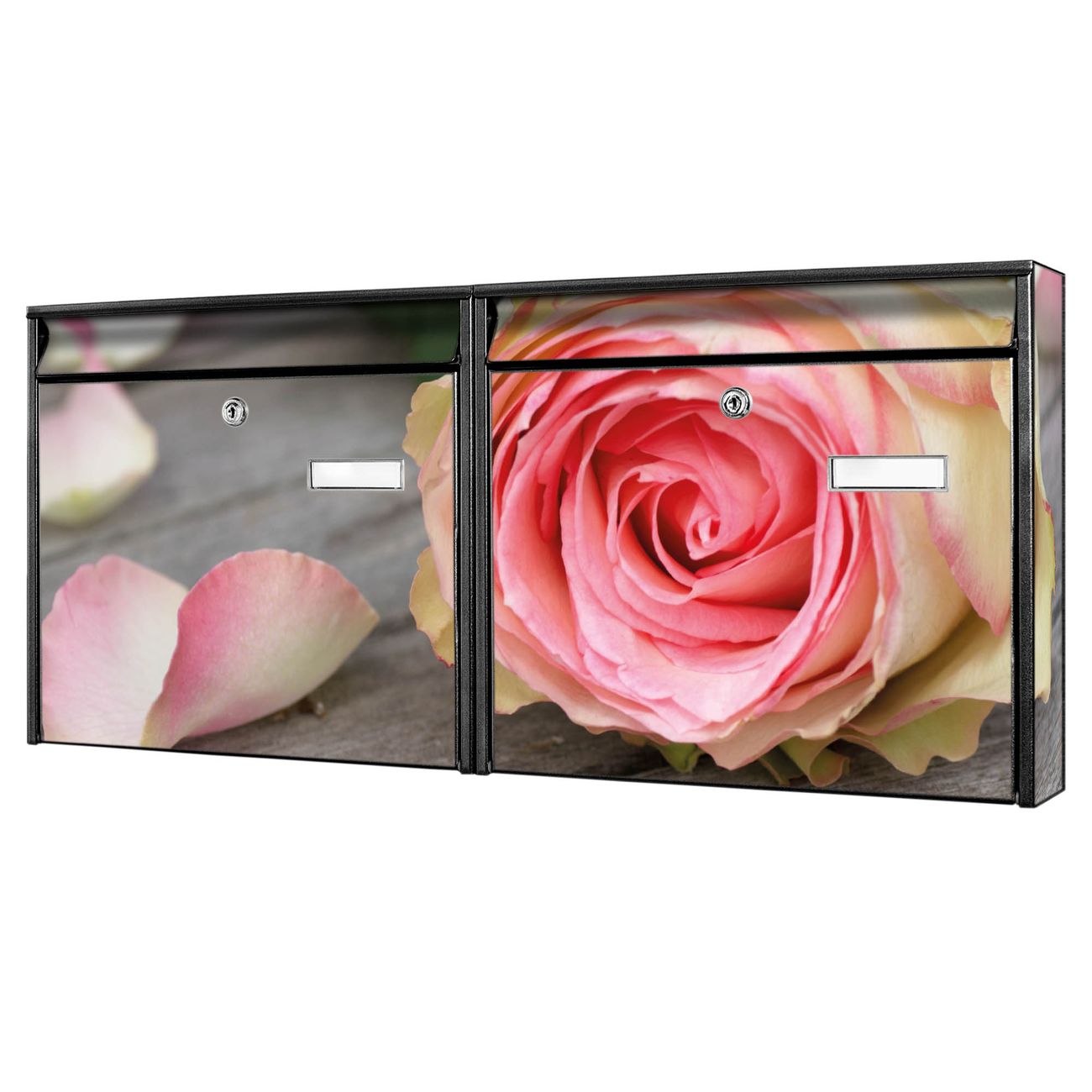 FUNKTION: Die Burg Wächter doppel Briefkastenanlage mit Motiv Rosa Rose bietet Ihnen ein großes Fassungsvermögen, sodass auch A4 Sendungen eingeworfen werden können. Das Namensschild lässt sich individuell beschriften. DESIGN: Die 2 Briefkästen mit Rosa Rose Motiv haben ein sehr ansprechendes und zeitloses Design. Heben Sie Sich von der tristen grauen Masse ab, ohne auf Funktionalität zu verzichten. Sie erhalten 2 Schlüssel sowie das Montagematerial. DETAILS: Der Doppelbriefkasten besteht aus verzinktem Stahl weiß. Er ist 72,5cm x 32,2cm x 10cm groß. Das Motiv besteht aus einer wetter- und UV-festen Folie, die Ihren Briefkasten zusätzlich vor Kratzern schützt. NUTZEN: Die stabile Bauart sowie die Wetterfestigkeit machen diese doppel Briefkästen zu einem zuverlässigen Begleiter im Alltag. Effektvoll in Reihe gehangen schmückt die Anlage jede Hauswand. BANJADO: Ihr Briefkasten wird in Sachsen in einer kleinen Manufaktur von Hand veredelt. Die Motivfolie ist lösungsmittelfrei und schutzlaminiert für einen langen Halt. Wir legen großen Wert auf die Verbindung von Funktionalität und Design. Sie erhalten Handarbeit aus Sachsen.