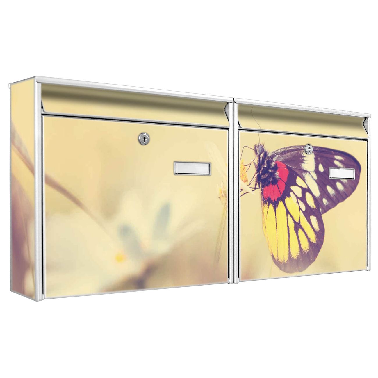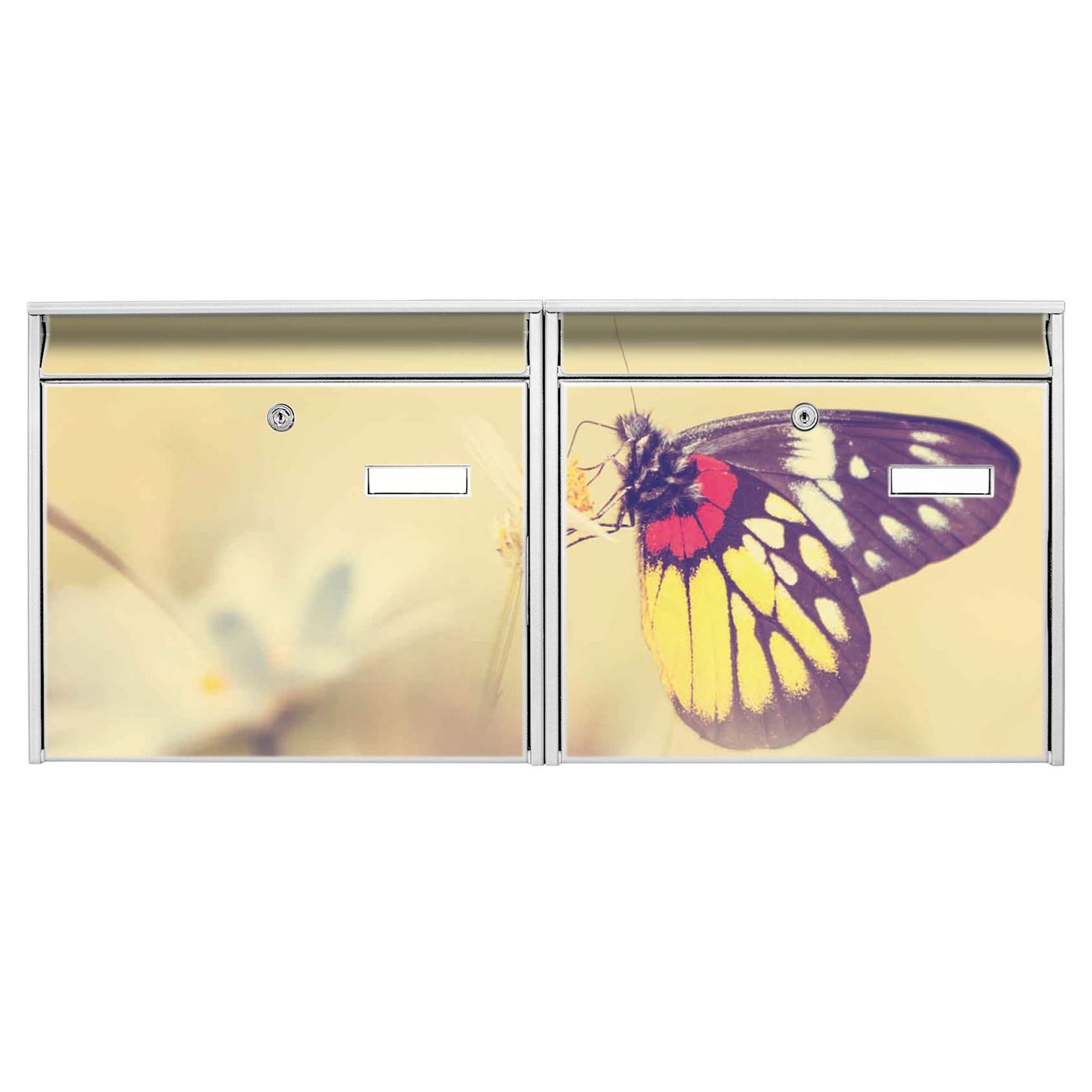 FUNKTION: Die Burg Wächter doppel Briefkastenanlage mit Motiv Rotgelber Falter bietet Ihnen ein großes Fassungsvermögen, sodass auch A4 Sendungen eingeworfen werden können. Das Namensschild lässt sich individuell beschriften. DESIGN: Die 2 Briefkästen mit Rotgelber Falter Motiv haben ein sehr ansprechendes und zeitloses Design. Heben Sie Sich von der tristen grauen Masse ab, ohne auf Funktionalität zu verzichten. Sie erhalten 2 Schlüssel sowie das Montagematerial. DETAILS: Der Doppelbriefkasten besteht aus verzinktem Stahl weiß. Er ist 72,5cm x 32,2cm x 10cm groß. Das Motiv besteht aus einer wetter- und UV-festen Folie, die Ihren Briefkasten zusätzlich vor Kratzern schützt. NUTZEN: Die stabile Bauart sowie die Wetterfestigkeit machen diese doppel Briefkästen zu einem zuverlässigen Begleiter im Alltag. Effektvoll in Reihe gehangen schmückt die Anlage jede Hauswand. BANJADO: Ihr Briefkasten wird in Sachsen in einer kleinen Manufaktur von Hand veredelt. Die Motivfolie ist lösungsmittelfrei und schutzlaminiert für einen langen Halt. Wir legen großen Wert auf die Verbindung von Funktionalität und Design. Sie erhalten Handarbeit aus Sachsen.