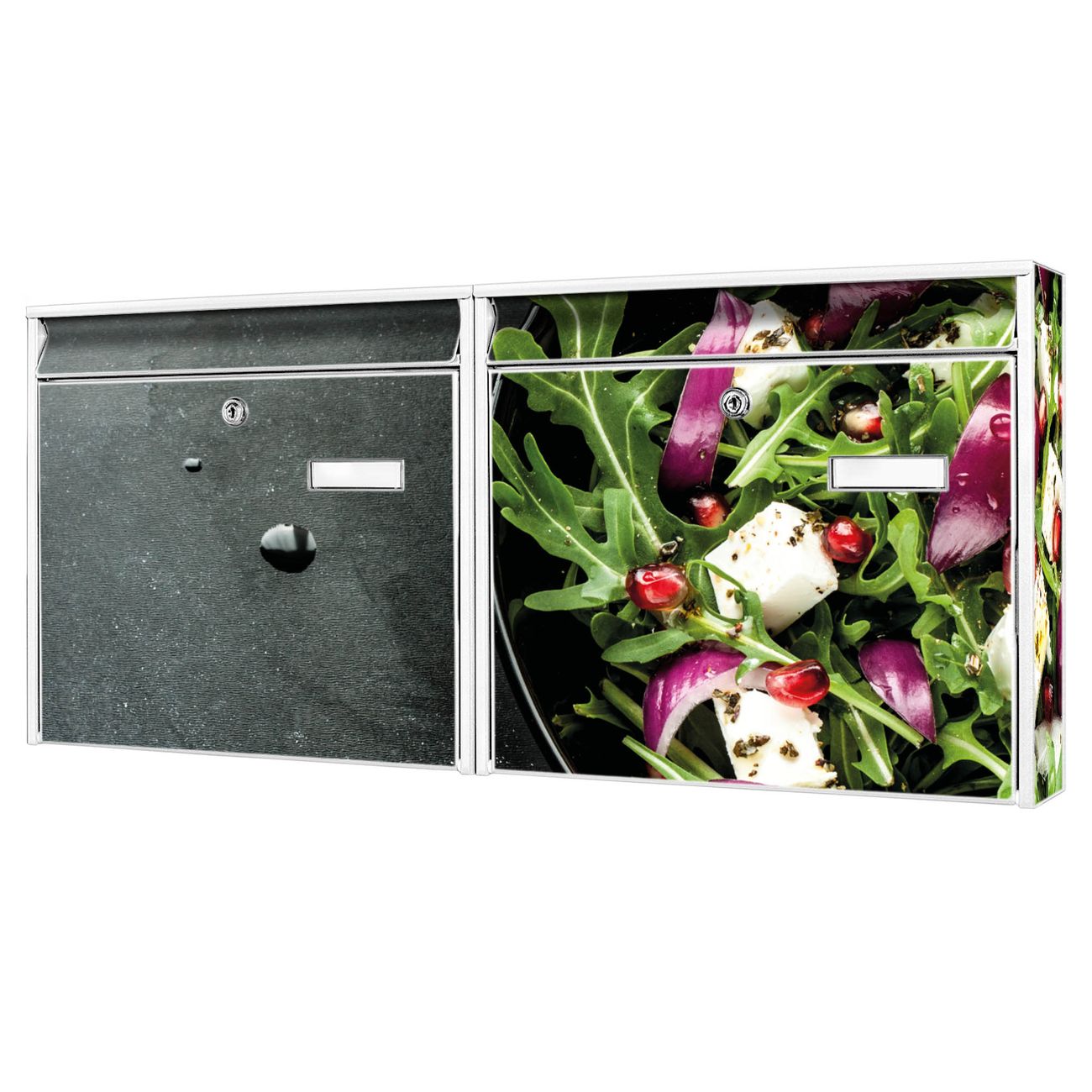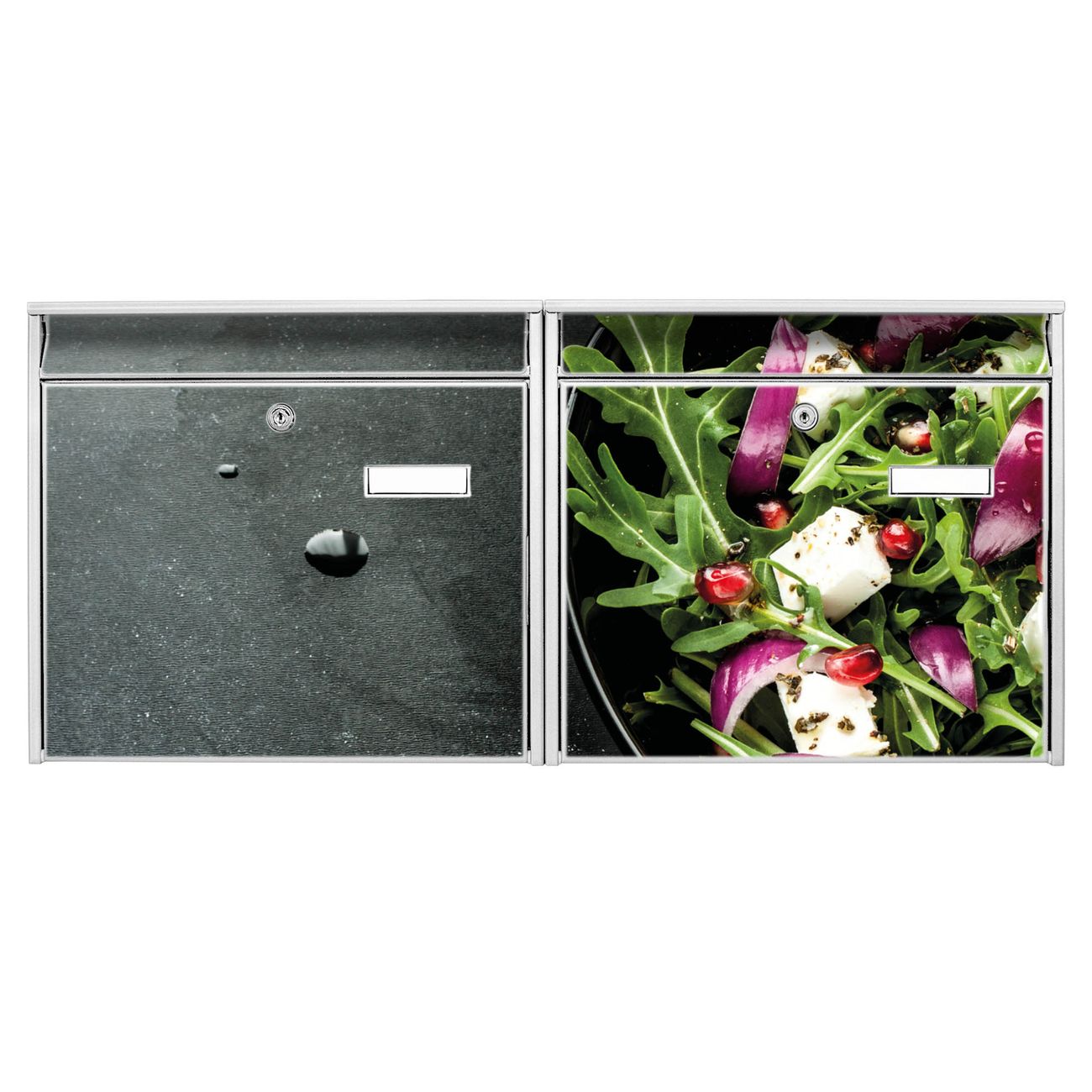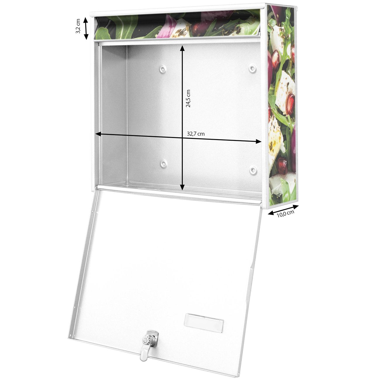 FUNKTION: Die Burg Wächter doppel Briefkastenanlage mit Motiv Salat bietet Ihnen ein großes Fassungsvermögen, sodass auch A4 Sendungen eingeworfen werden können. Das Namensschild lässt sich individuell beschriften. DESIGN: Die 2 Briefkästen mit Salat Motiv haben ein sehr ansprechendes und zeitloses Design. Heben Sie Sich von der tristen grauen Masse ab, ohne auf Funktionalität zu verzichten. Sie erhalten 2 Schlüssel sowie das Montagematerial. DETAILS: Der Doppelbriefkasten besteht aus verzinktem Stahl weiß. Er ist 72,5cm x 32,2cm x 10cm groß. Das Motiv besteht aus einer wetter- und UV-festen Folie, die Ihren Briefkasten zusätzlich vor Kratzern schützt. NUTZEN: Die stabile Bauart sowie die Wetterfestigkeit machen diese doppel Briefkästen zu einem zuverlässigen Begleiter im Alltag. Effektvoll in Reihe gehangen schmückt die Anlage jede Hauswand. BANJADO: Ihr Briefkasten wird in Sachsen in einer kleinen Manufaktur von Hand veredelt. Die Motivfolie ist lösungsmittelfrei und schutzlaminiert für einen langen Halt. Wir legen großen Wert auf die Verbindung von Funktionalität und Design. Sie erhalten Handarbeit aus Sachsen.