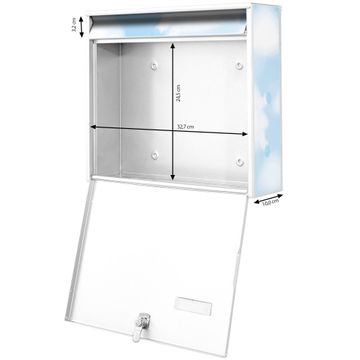 FUNKTION: Die Burg Wächter doppel Briefkastenanlage mit Motiv Schäfchenwolken bietet Ihnen ein großes Fassungsvermögen, sodass auch A4 Sendungen eingeworfen werden können. Das Namensschild lässt sich individuell beschriften. DESIGN: Die 2 Briefkästen mit Schäfchenwolken Motiv haben ein sehr ansprechendes und zeitloses Design. Heben Sie Sich von der tristen grauen Masse ab, ohne auf Funktionalität zu verzichten. Sie erhalten 2 Schlüssel sowie das Montagematerial. DETAILS: Der Doppelbriefkasten besteht aus verzinktem Stahl weiß. Er ist 72,5cm x 32,2cm x 10cm groß. Das Motiv besteht aus einer wetter- und UV-festen Folie, die Ihren Briefkasten zusätzlich vor Kratzern schützt. NUTZEN: Die stabile Bauart sowie die Wetterfestigkeit machen diese doppel Briefkästen zu einem zuverlässigen Begleiter im Alltag. Effektvoll in Reihe gehangen schmückt die Anlage jede Hauswand. BANJADO: Ihr Briefkasten wird in Sachsen in einer kleinen Manufaktur von Hand veredelt. Die Motivfolie ist lösungsmittelfrei und schutzlaminiert für einen langen Halt. Wir legen großen Wert auf die Verbindung von Funktionalität und Design. Sie erhalten Handarbeit aus Sachsen.
