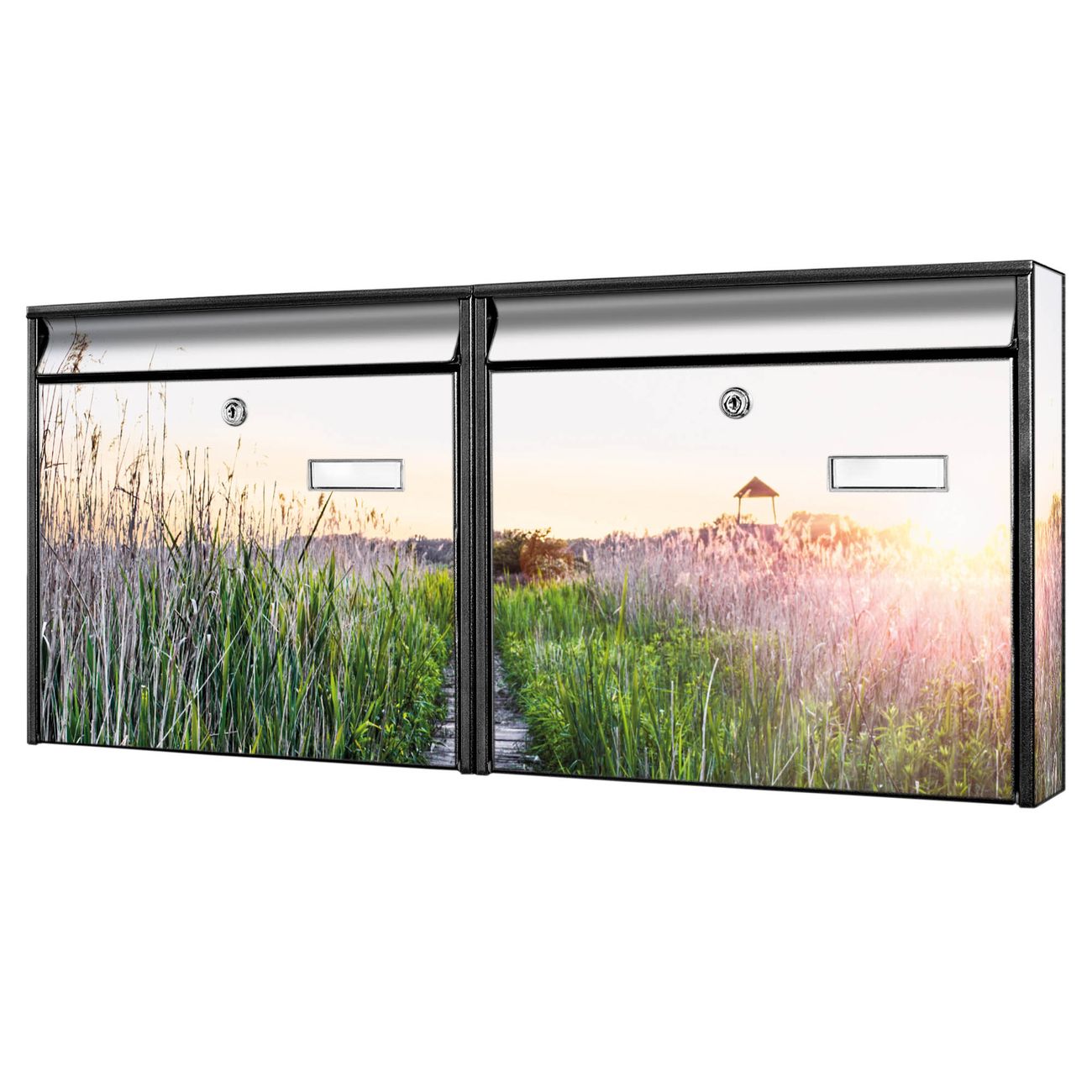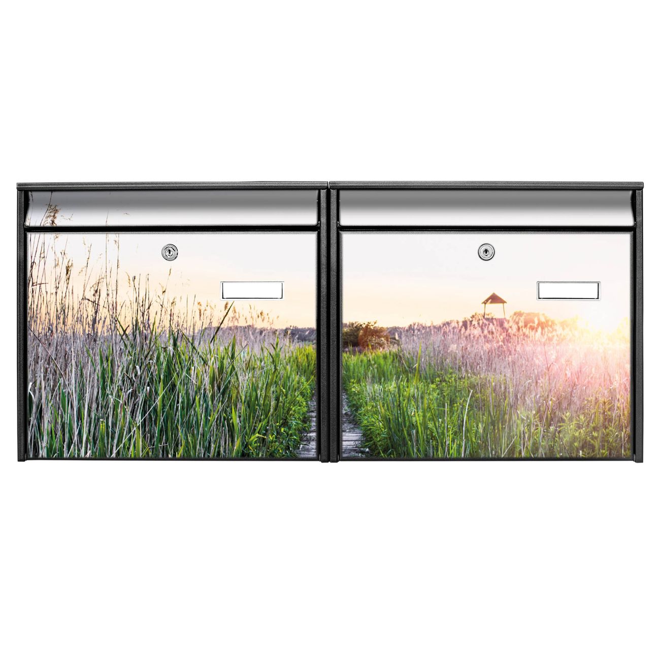 FUNKTION: Die Burg Wächter doppel Briefkastenanlage mit Motiv Steg Durchs Schilf bietet Ihnen ein großes Fassungsvermögen, sodass auch A4 Sendungen eingeworfen werden können. Das Namensschild lässt sich individuell beschriften. DESIGN: Die 2 Briefkästen mit Steg Durchs Schilf Motiv haben ein sehr ansprechendes und zeitloses Design. Heben Sie Sich von der tristen grauen Masse ab, ohne auf Funktionalität zu verzichten. Sie erhalten 2 Schlüssel sowie das Montagematerial. DETAILS: Der Doppelbriefkasten besteht aus verzinktem Stahl weiß. Er ist 72,5cm x 32,2cm x 10cm groß. Das Motiv besteht aus einer wetter- und UV-festen Folie, die Ihren Briefkasten zusätzlich vor Kratzern schützt. NUTZEN: Die stabile Bauart sowie die Wetterfestigkeit machen diese doppel Briefkästen zu einem zuverlässigen Begleiter im Alltag. Effektvoll in Reihe gehangen schmückt die Anlage jede Hauswand. BANJADO: Ihr Briefkasten wird in Sachsen in einer kleinen Manufaktur von Hand veredelt. Die Motivfolie ist lösungsmittelfrei und schutzlaminiert für einen langen Halt. Wir legen großen Wert auf die Verbindung von Funktionalität und Design. Sie erhalten Handarbeit aus Sachsen.