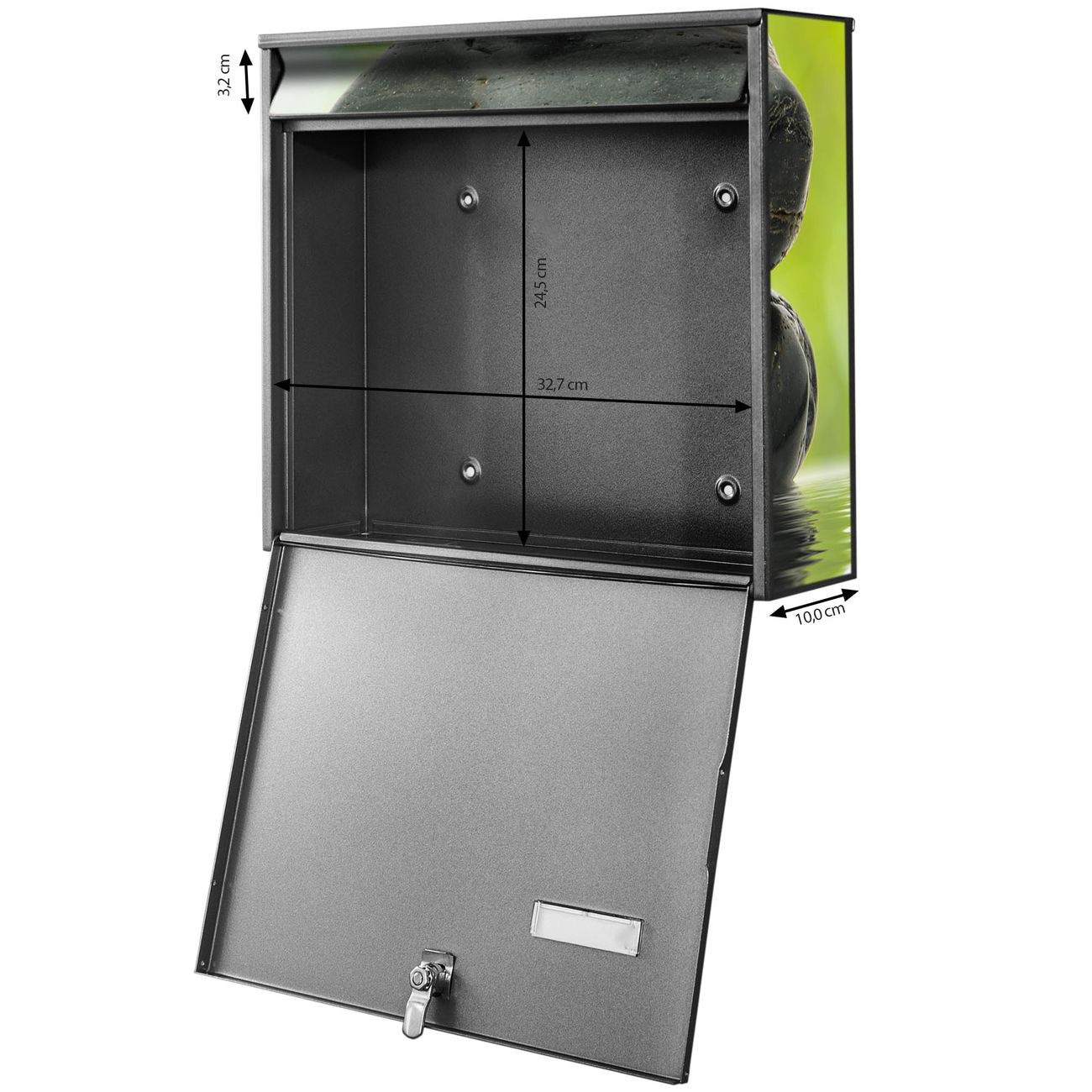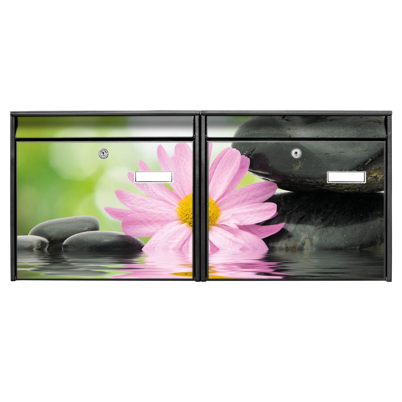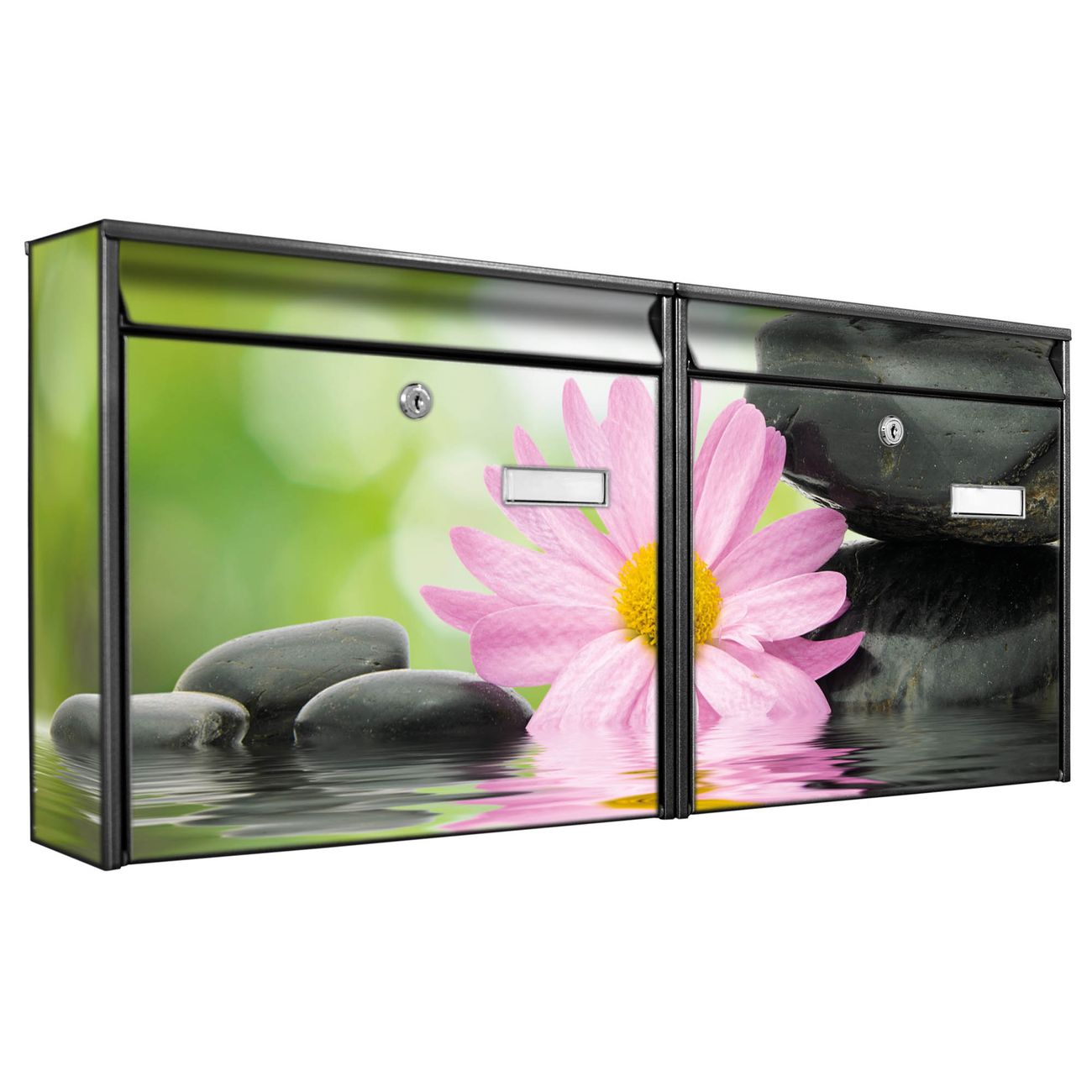 FUNKTION: Die Burg Wächter doppel Briefkastenanlage mit Motiv Steine & Relax 2 bietet Ihnen ein großes Fassungsvermögen, sodass auch A4 Sendungen eingeworfen werden können. Das Namensschild lässt sich individuell beschriften. DESIGN: Die 2 Briefkästen mit Steine & Relax 2 Motiv haben ein sehr ansprechendes und zeitloses Design. Heben Sie Sich von der tristen grauen Masse ab, ohne auf Funktionalität zu verzichten. Sie erhalten 2 Schlüssel sowie das Montagematerial. DETAILS: Der Doppelbriefkasten besteht aus verzinktem Stahl weiß. Er ist 72,5cm x 32,2cm x 10cm groß. Das Motiv besteht aus einer wetter- und UV-festen Folie, die Ihren Briefkasten zusätzlich vor Kratzern schützt. NUTZEN: Die stabile Bauart sowie die Wetterfestigkeit machen diese doppel Briefkästen zu einem zuverlässigen Begleiter im Alltag. Effektvoll in Reihe gehangen schmückt die Anlage jede Hauswand. BANJADO: Ihr Briefkasten wird in Sachsen in einer kleinen Manufaktur von Hand veredelt. Die Motivfolie ist lösungsmittelfrei und schutzlaminiert für einen langen Halt. Wir legen großen Wert auf die Verbindung von Funktionalität und Design. Sie erhalten Handarbeit aus Sachsen.