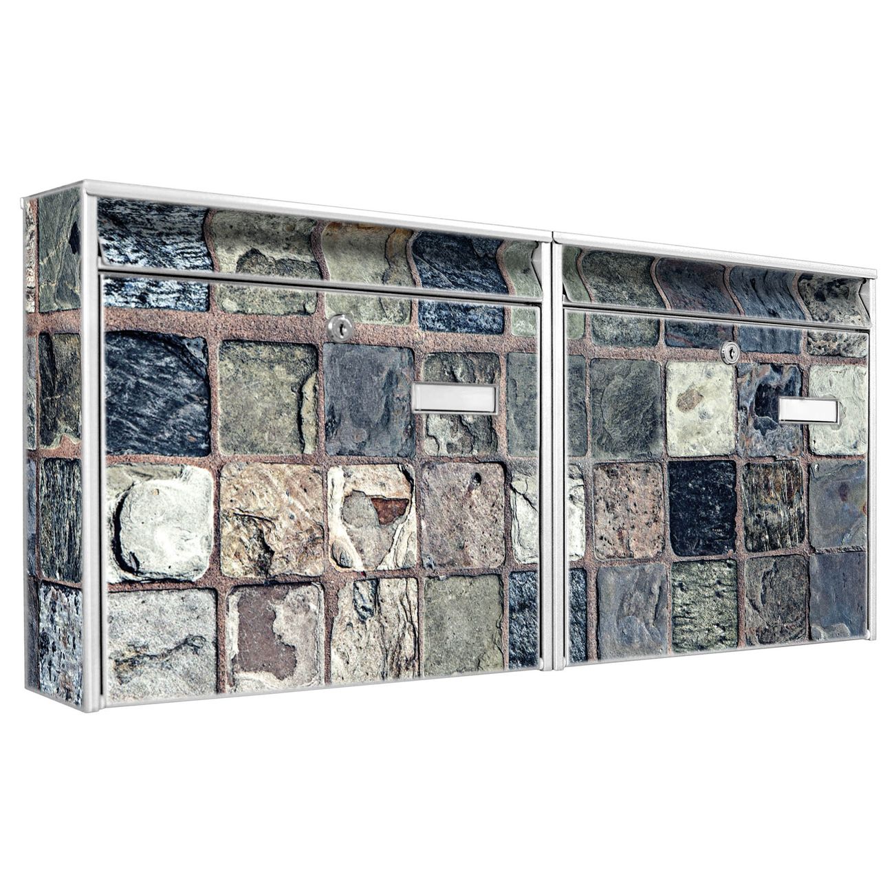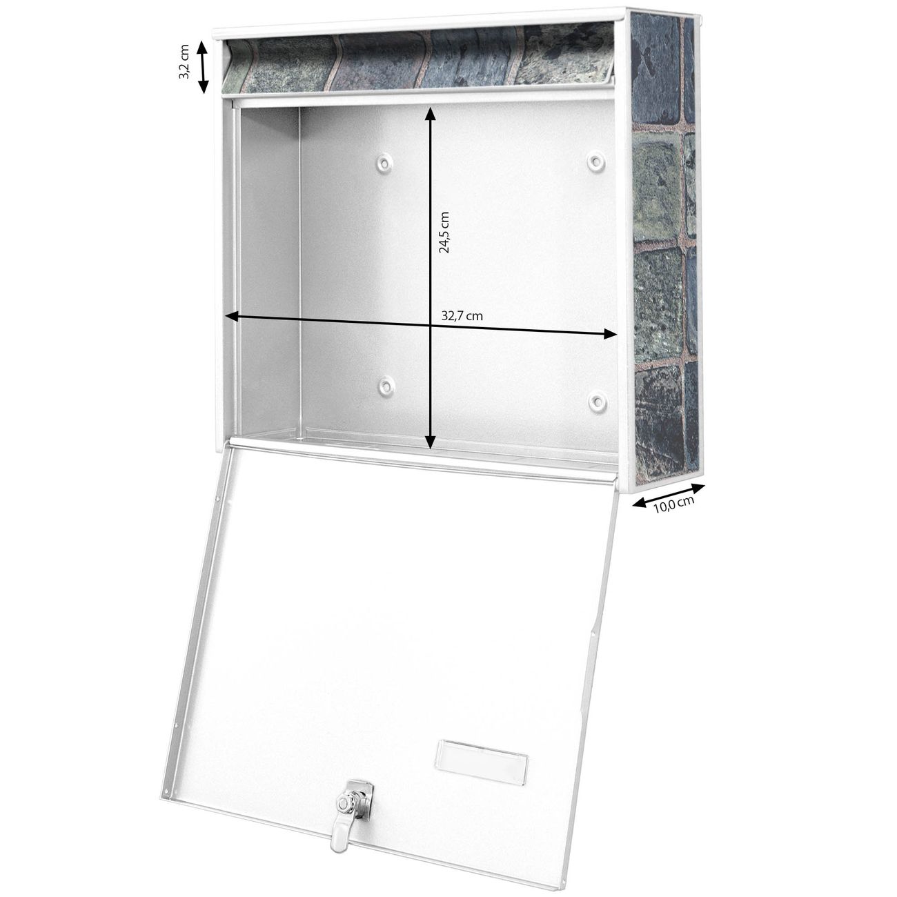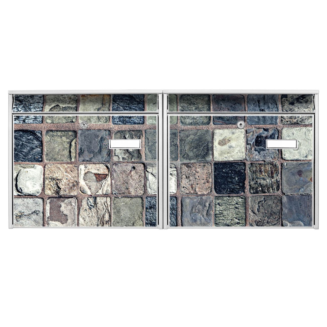 FUNKTION: Die Burg Wächter doppel Briefkastenanlage mit Motiv Steinfliesen bietet Ihnen ein großes Fassungsvermögen, sodass auch A4 Sendungen eingeworfen werden können. Das Namensschild lässt sich individuell beschriften. DESIGN: Die 2 Briefkästen mit Steinfliesen Motiv haben ein sehr ansprechendes und zeitloses Design. Heben Sie Sich von der tristen grauen Masse ab, ohne auf Funktionalität zu verzichten. Sie erhalten 2 Schlüssel sowie das Montagematerial. DETAILS: Der Doppelbriefkasten besteht aus verzinktem Stahl weiß. Er ist 72,5cm x 32,2cm x 10cm groß. Das Motiv besteht aus einer wetter- und UV-festen Folie, die Ihren Briefkasten zusätzlich vor Kratzern schützt. NUTZEN: Die stabile Bauart sowie die Wetterfestigkeit machen diese doppel Briefkästen zu einem zuverlässigen Begleiter im Alltag. Effektvoll in Reihe gehangen schmückt die Anlage jede Hauswand. BANJADO: Ihr Briefkasten wird in Sachsen in einer kleinen Manufaktur von Hand veredelt. Die Motivfolie ist lösungsmittelfrei und schutzlaminiert für einen langen Halt. Wir legen großen Wert auf die Verbindung von Funktionalität und Design. Sie erhalten Handarbeit aus Sachsen.