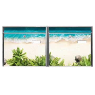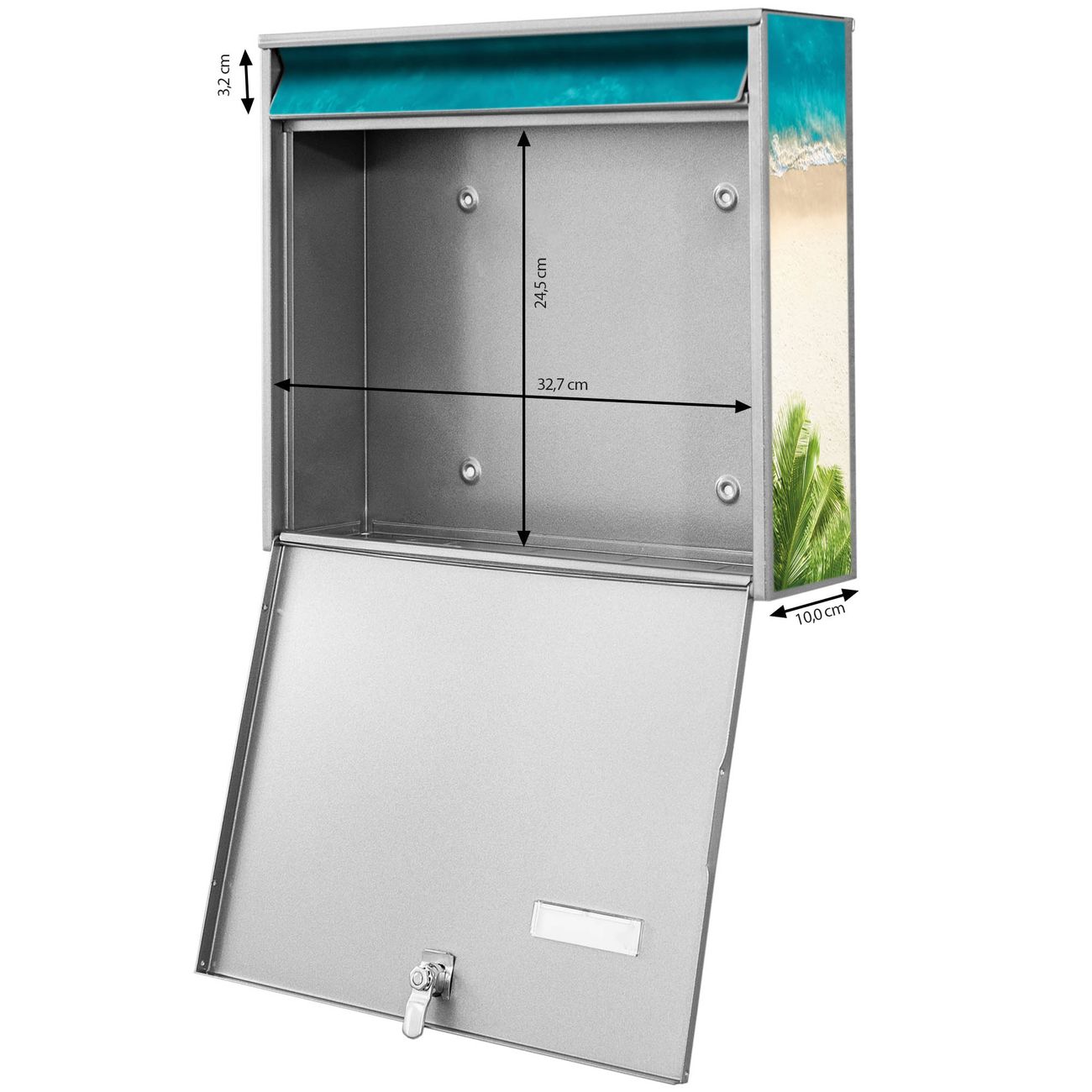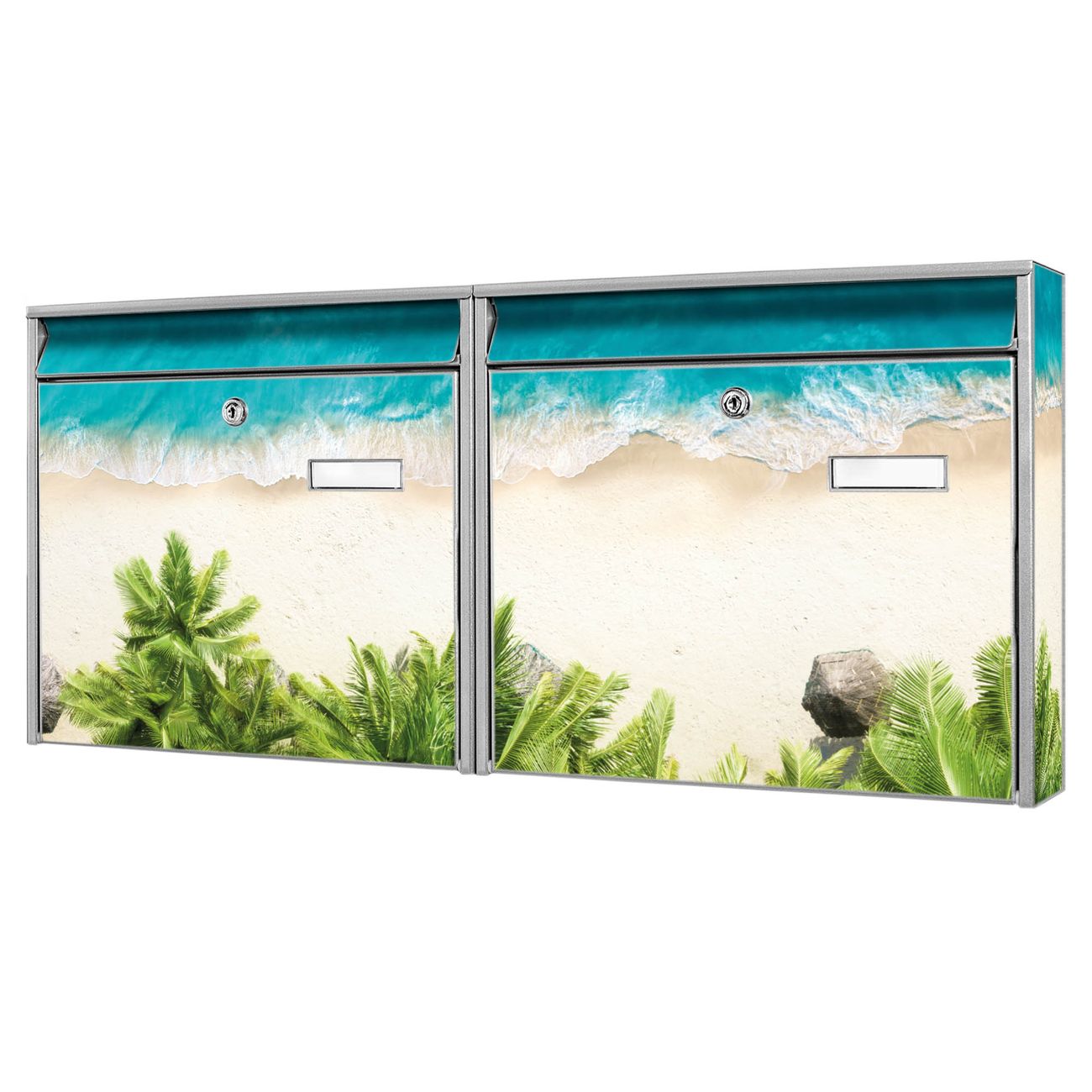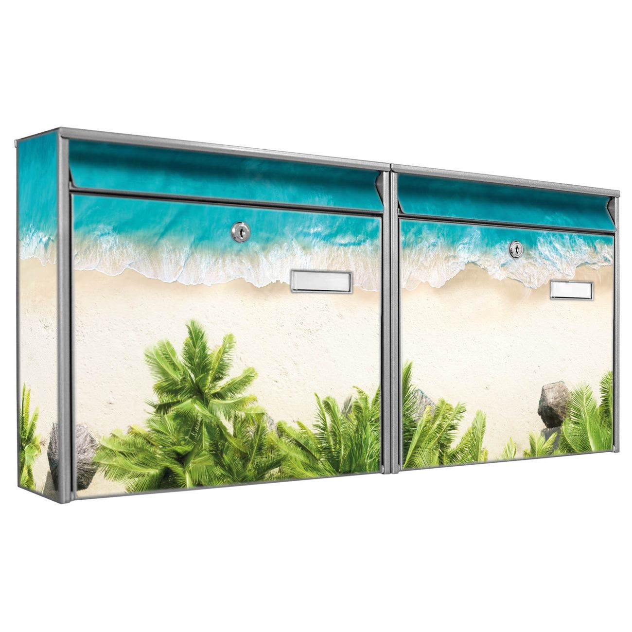 FUNKTION: Die Burg Wächter doppel Briefkastenanlage mit Motiv Strandtag bietet Ihnen ein großes Fassungsvermögen, sodass auch A4 Sendungen eingeworfen werden können. Das Namensschild lässt sich individuell beschriften. DESIGN: Die 2 Briefkästen mit Strandtag Motiv haben ein sehr ansprechendes und zeitloses Design. Heben Sie Sich von der tristen grauen Masse ab, ohne auf Funktionalität zu verzichten. Sie erhalten 2 Schlüssel sowie das Montagematerial. DETAILS: Der Doppelbriefkasten besteht aus verzinktem Stahl weiß. Er ist 72,5cm x 32,2cm x 10cm groß. Das Motiv besteht aus einer wetter- und UV-festen Folie, die Ihren Briefkasten zusätzlich vor Kratzern schützt. NUTZEN: Die stabile Bauart sowie die Wetterfestigkeit machen diese doppel Briefkästen zu einem zuverlässigen Begleiter im Alltag. Effektvoll in Reihe gehangen schmückt die Anlage jede Hauswand. BANJADO: Ihr Briefkasten wird in Sachsen in einer kleinen Manufaktur von Hand veredelt. Die Motivfolie ist lösungsmittelfrei und schutzlaminiert für einen langen Halt. Wir legen großen Wert auf die Verbindung von Funktionalität und Design. Sie erhalten Handarbeit aus Sachsen.