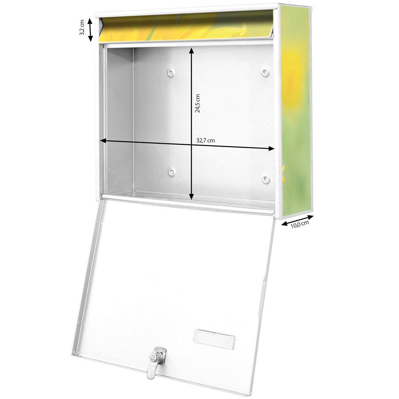 FUNKTION: Die Burg Wächter doppel Briefkastenanlage mit Motiv Sunny bietet Ihnen ein großes Fassungsvermögen, sodass auch A4 Sendungen eingeworfen werden können. Das Namensschild lässt sich individuell beschriften. DESIGN: Die 2 Briefkästen mit Sunny Motiv haben ein sehr ansprechendes und zeitloses Design. Heben Sie Sich von der tristen grauen Masse ab, ohne auf Funktionalität zu verzichten. Sie erhalten 2 Schlüssel sowie das Montagematerial. DETAILS: Der Doppelbriefkasten besteht aus verzinktem Stahl weiß. Er ist 72,5cm x 32,2cm x 10cm groß. Das Motiv besteht aus einer wetter- und UV-festen Folie, die Ihren Briefkasten zusätzlich vor Kratzern schützt. NUTZEN: Die stabile Bauart sowie die Wetterfestigkeit machen diese doppel Briefkästen zu einem zuverlässigen Begleiter im Alltag. Effektvoll in Reihe gehangen schmückt die Anlage jede Hauswand. BANJADO: Ihr Briefkasten wird in Sachsen in einer kleinen Manufaktur von Hand veredelt. Die Motivfolie ist lösungsmittelfrei und schutzlaminiert für einen langen Halt. Wir legen großen Wert auf die Verbindung von Funktionalität und Design. Sie erhalten Handarbeit aus Sachsen.