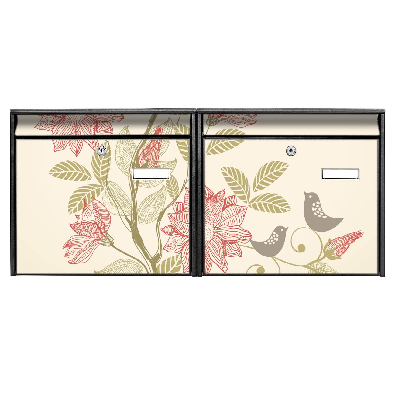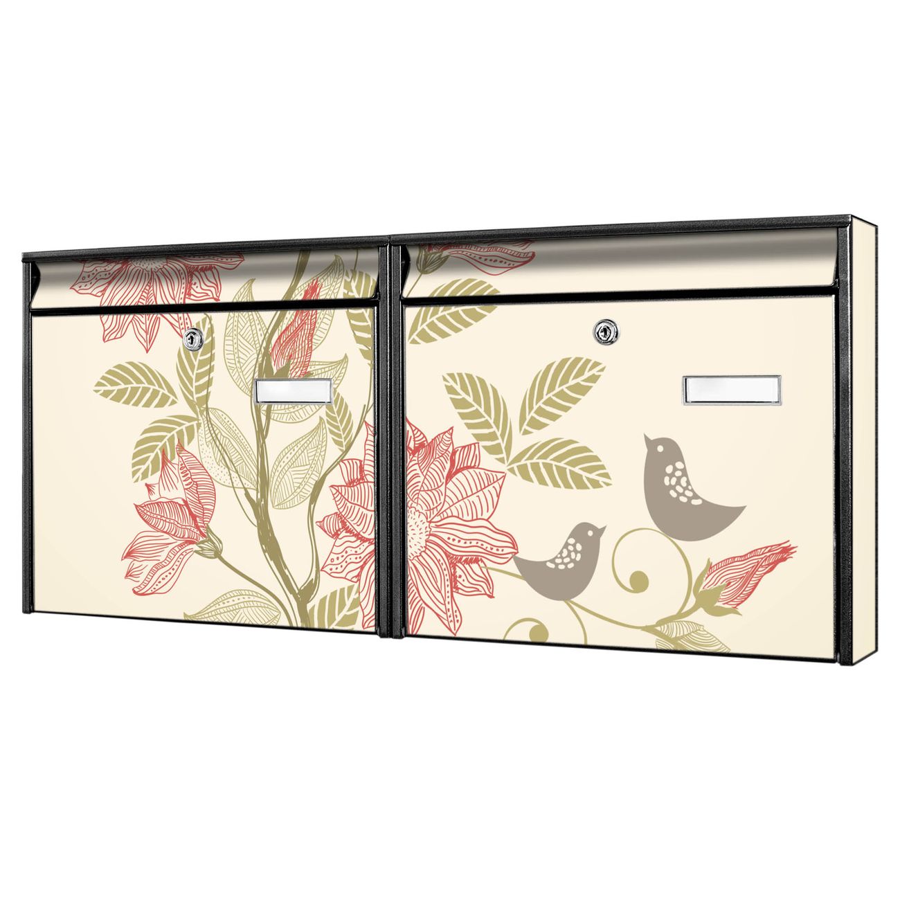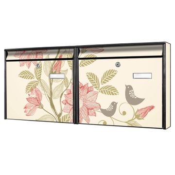 FUNKTION: Die Burg Wächter doppel Briefkastenanlage mit Motiv Vogelpaar bietet Ihnen ein großes Fassungsvermögen, sodass auch A4 Sendungen eingeworfen werden können. Das Namensschild lässt sich individuell beschriften. DESIGN: Die 2 Briefkästen mit Vogelpaar Motiv haben ein sehr ansprechendes und zeitloses Design. Heben Sie Sich von der tristen grauen Masse ab, ohne auf Funktionalität zu verzichten. Sie erhalten 2 Schlüssel sowie das Montagematerial. DETAILS: Der Doppelbriefkasten besteht aus verzinktem Stahl weiß. Er ist 72,5cm x 32,2cm x 10cm groß. Das Motiv besteht aus einer wetter- und UV-festen Folie, die Ihren Briefkasten zusätzlich vor Kratzern schützt. NUTZEN: Die stabile Bauart sowie die Wetterfestigkeit machen diese doppel Briefkästen zu einem zuverlässigen Begleiter im Alltag. Effektvoll in Reihe gehangen schmückt die Anlage jede Hauswand. BANJADO: Ihr Briefkasten wird in Sachsen in einer kleinen Manufaktur von Hand veredelt. Die Motivfolie ist lösungsmittelfrei und schutzlaminiert für einen langen Halt. Wir legen großen Wert auf die Verbindung von Funktionalität und Design. Sie erhalten Handarbeit aus Sachsen.