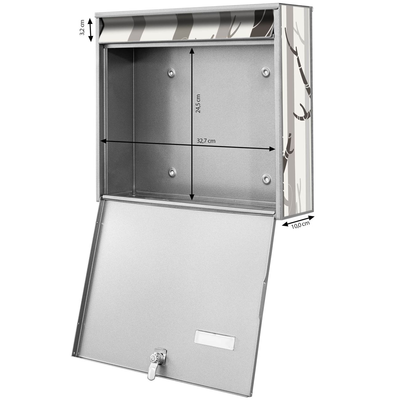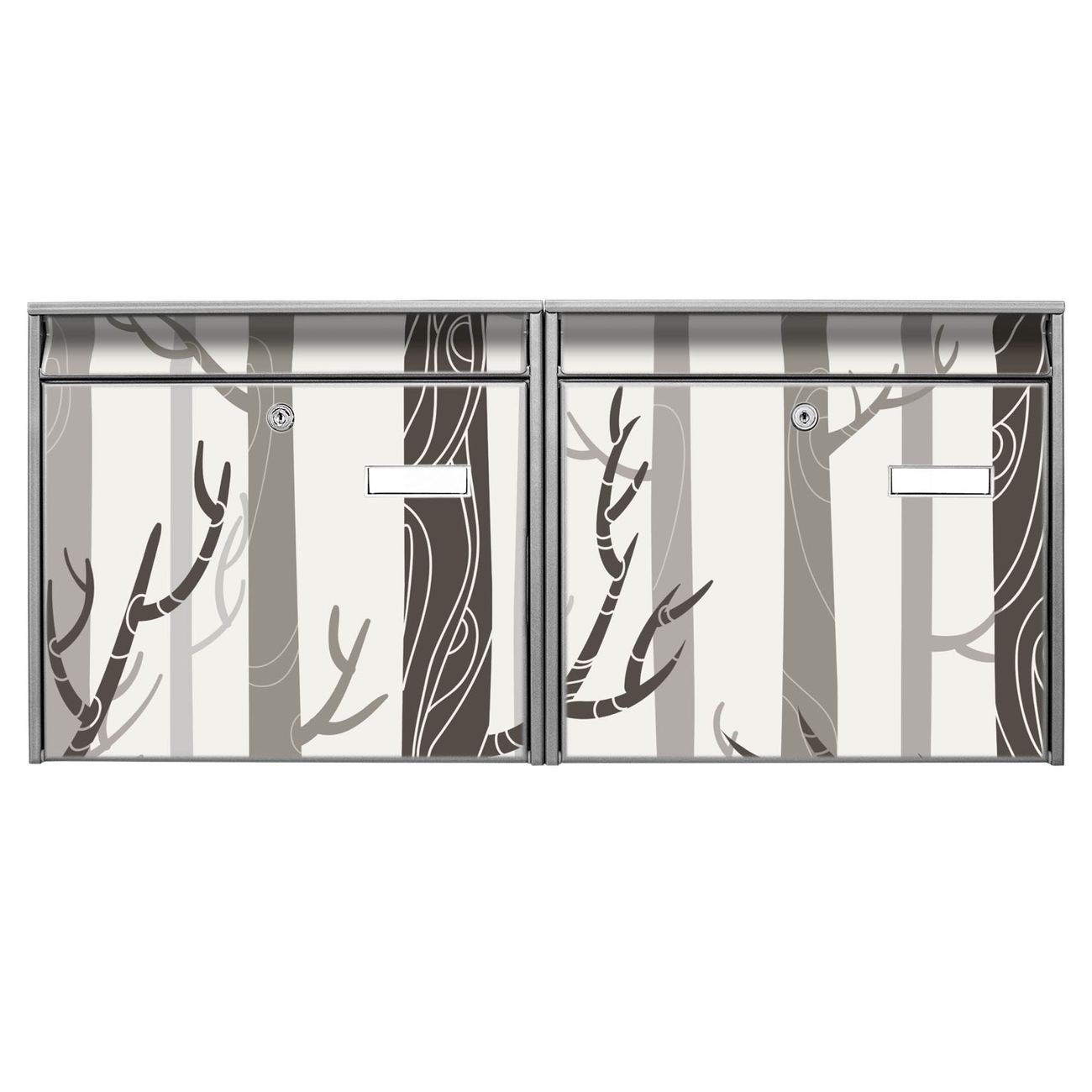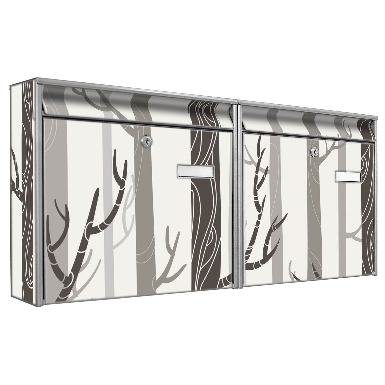 FUNKTION: Die Burg Wächter doppel Briefkastenanlage mit Motiv Wald bietet Ihnen ein großes Fassungsvermögen, sodass auch A4 Sendungen eingeworfen werden können. Das Namensschild lässt sich individuell beschriften. DESIGN: Die 2 Briefkästen mit Wald Motiv haben ein sehr ansprechendes und zeitloses Design. Heben Sie Sich von der tristen grauen Masse ab, ohne auf Funktionalität zu verzichten. Sie erhalten 2 Schlüssel sowie das Montagematerial. DETAILS: Der Doppelbriefkasten besteht aus verzinktem Stahl weiß. Er ist 72,5cm x 32,2cm x 10cm groß. Das Motiv besteht aus einer wetter- und UV-festen Folie, die Ihren Briefkasten zusätzlich vor Kratzern schützt. NUTZEN: Die stabile Bauart sowie die Wetterfestigkeit machen diese doppel Briefkästen zu einem zuverlässigen Begleiter im Alltag. Effektvoll in Reihe gehangen schmückt die Anlage jede Hauswand. BANJADO: Ihr Briefkasten wird in Sachsen in einer kleinen Manufaktur von Hand veredelt. Die Motivfolie ist lösungsmittelfrei und schutzlaminiert für einen langen Halt. Wir legen großen Wert auf die Verbindung von Funktionalität und Design. Sie erhalten Handarbeit aus Sachsen.