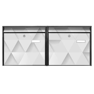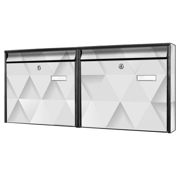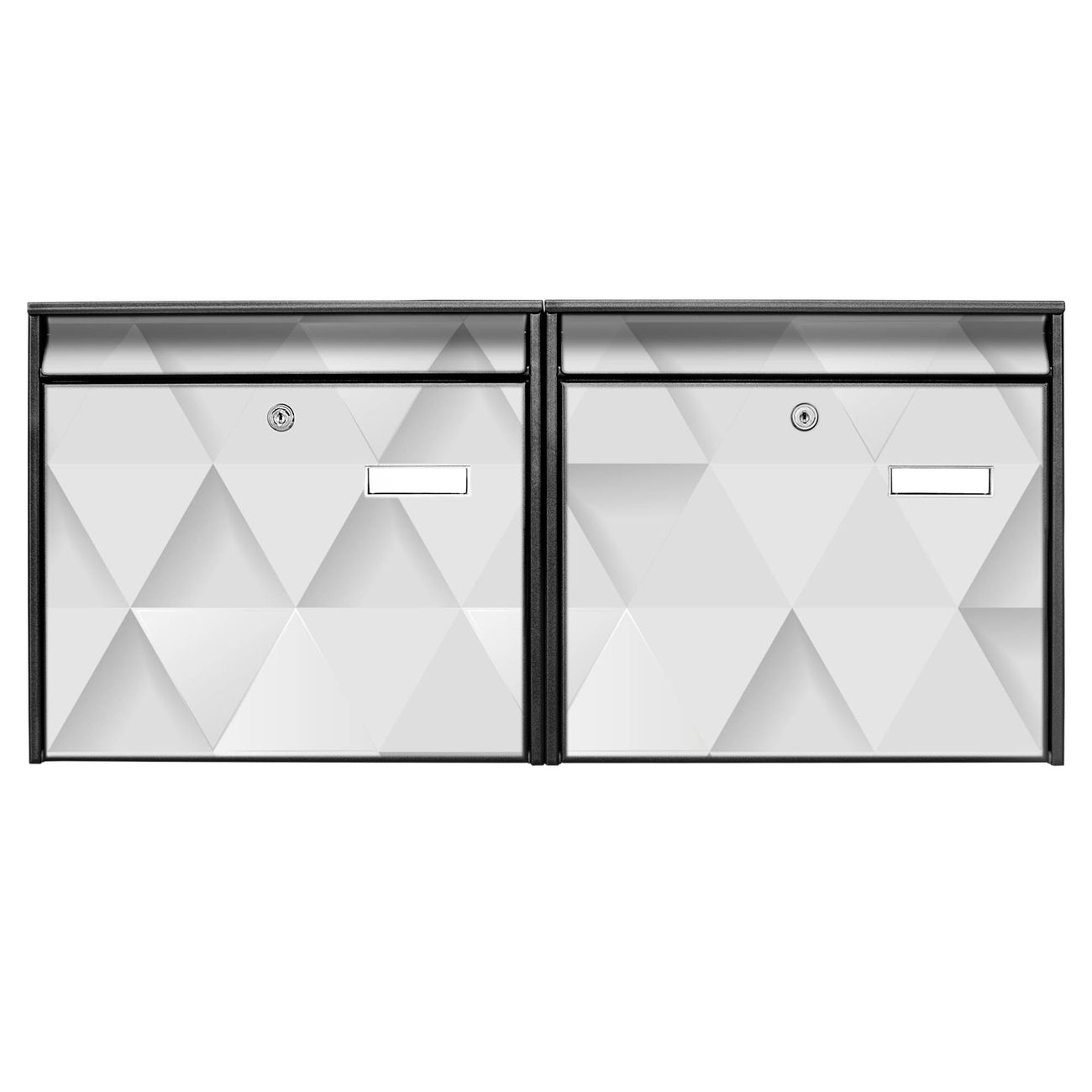 FUNKTION: Die Burg Wächter doppel Briefkastenanlage mit Motiv Weisse Dreiecke bietet Ihnen ein großes Fassungsvermögen, sodass auch A4 Sendungen eingeworfen werden können. Das Namensschild lässt sich individuell beschriften. DESIGN: Die 2 Briefkästen mit Weisse Dreiecke Motiv haben ein sehr ansprechendes und zeitloses Design. Heben Sie Sich von der tristen grauen Masse ab, ohne auf Funktionalität zu verzichten. Sie erhalten 2 Schlüssel sowie das Montagematerial. DETAILS: Der Doppelbriefkasten besteht aus verzinktem Stahl weiß. Er ist 72,5cm x 32,2cm x 10cm groß. Das Motiv besteht aus einer wetter- und UV-festen Folie, die Ihren Briefkasten zusätzlich vor Kratzern schützt. NUTZEN: Die stabile Bauart sowie die Wetterfestigkeit machen diese doppel Briefkästen zu einem zuverlässigen Begleiter im Alltag. Effektvoll in Reihe gehangen schmückt die Anlage jede Hauswand. BANJADO: Ihr Briefkasten wird in Sachsen in einer kleinen Manufaktur von Hand veredelt. Die Motivfolie ist lösungsmittelfrei und schutzlaminiert für einen langen Halt. Wir legen großen Wert auf die Verbindung von Funktionalität und Design. Sie erhalten Handarbeit aus Sachsen.