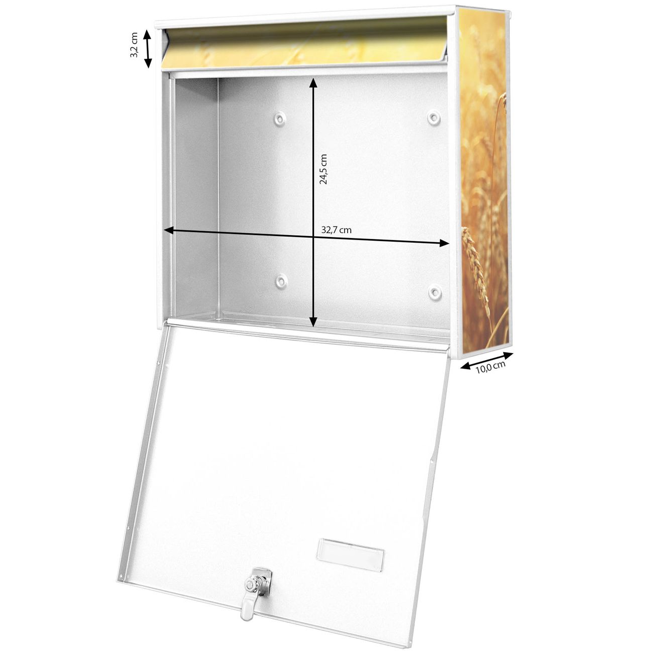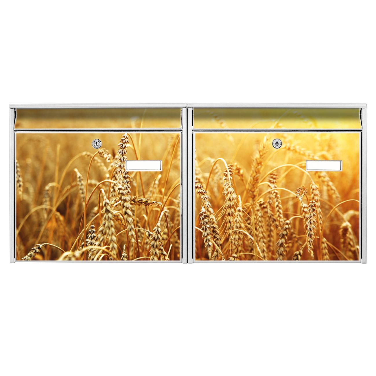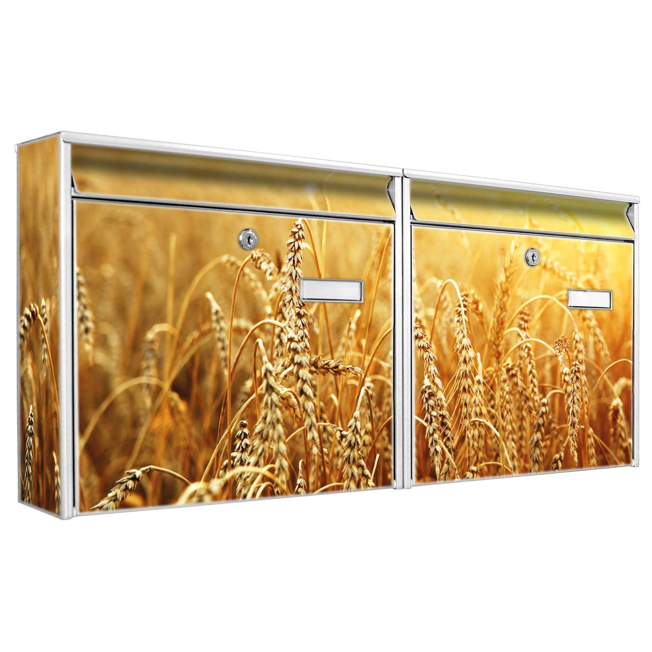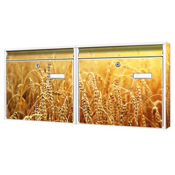 FUNKTION: Die Burg Wächter doppel Briefkastenanlage mit Motiv Weizenfeld bietet Ihnen ein großes Fassungsvermögen, sodass auch A4 Sendungen eingeworfen werden können. Das Namensschild lässt sich individuell beschriften. DESIGN: Die 2 Briefkästen mit Weizenfeld Motiv haben ein sehr ansprechendes und zeitloses Design. Heben Sie Sich von der tristen grauen Masse ab, ohne auf Funktionalität zu verzichten. Sie erhalten 2 Schlüssel sowie das Montagematerial. DETAILS: Der Doppelbriefkasten besteht aus verzinktem Stahl weiß. Er ist 72,5cm x 32,2cm x 10cm groß. Das Motiv besteht aus einer wetter- und UV-festen Folie, die Ihren Briefkasten zusätzlich vor Kratzern schützt. NUTZEN: Die stabile Bauart sowie die Wetterfestigkeit machen diese doppel Briefkästen zu einem zuverlässigen Begleiter im Alltag. Effektvoll in Reihe gehangen schmückt die Anlage jede Hauswand. BANJADO: Ihr Briefkasten wird in Sachsen in einer kleinen Manufaktur von Hand veredelt. Die Motivfolie ist lösungsmittelfrei und schutzlaminiert für einen langen Halt. Wir legen großen Wert auf die Verbindung von Funktionalität und Design. Sie erhalten Handarbeit aus Sachsen.