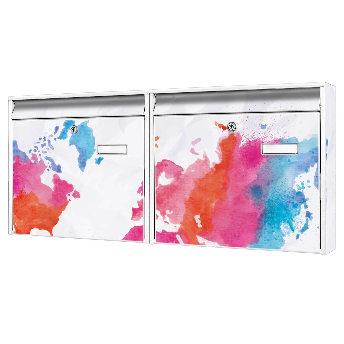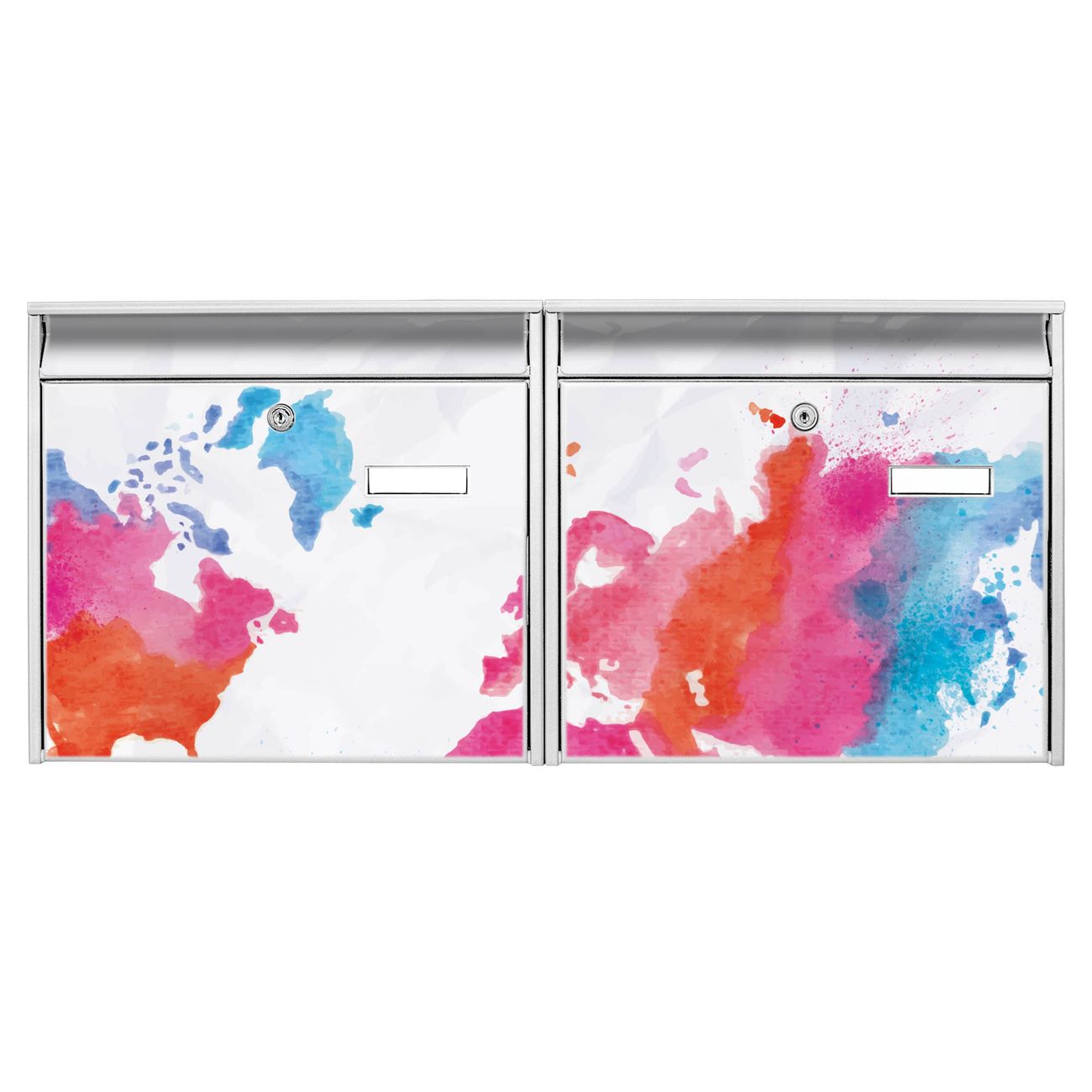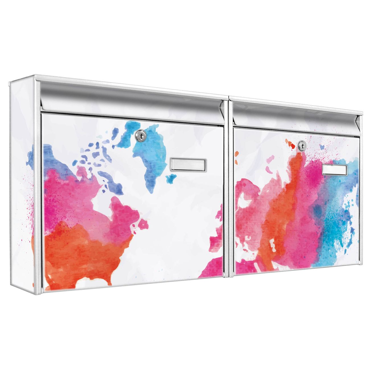 FUNKTION: Die Burg Wächter doppel Briefkastenanlage mit Motiv Weltkarte pastell bietet Ihnen ein großes Fassungsvermögen, sodass auch A4 Sendungen eingeworfen werden können. Das Namensschild lässt sich individuell beschriften. DESIGN: Die 2 Briefkästen mit Weltkarte pastell Motiv haben ein sehr ansprechendes und zeitloses Design. Heben Sie Sich von der tristen grauen Masse ab, ohne auf Funktionalität zu verzichten. Sie erhalten 2 Schlüssel sowie das Montagematerial. DETAILS: Der Doppelbriefkasten besteht aus verzinktem Stahl weiß. Er ist 72,5cm x 32,2cm x 10cm groß. Das Motiv besteht aus einer wetter- und UV-festen Folie, die Ihren Briefkasten zusätzlich vor Kratzern schützt. NUTZEN: Die stabile Bauart sowie die Wetterfestigkeit machen diese doppel Briefkästen zu einem zuverlässigen Begleiter im Alltag. Effektvoll in Reihe gehangen schmückt die Anlage jede Hauswand. BANJADO: Ihr Briefkasten wird in Sachsen in einer kleinen Manufaktur von Hand veredelt. Die Motivfolie ist lösungsmittelfrei und schutzlaminiert für einen langen Halt. Wir legen großen Wert auf die Verbindung von Funktionalität und Design. Sie erhalten Handarbeit aus Sachsen.
