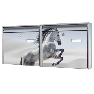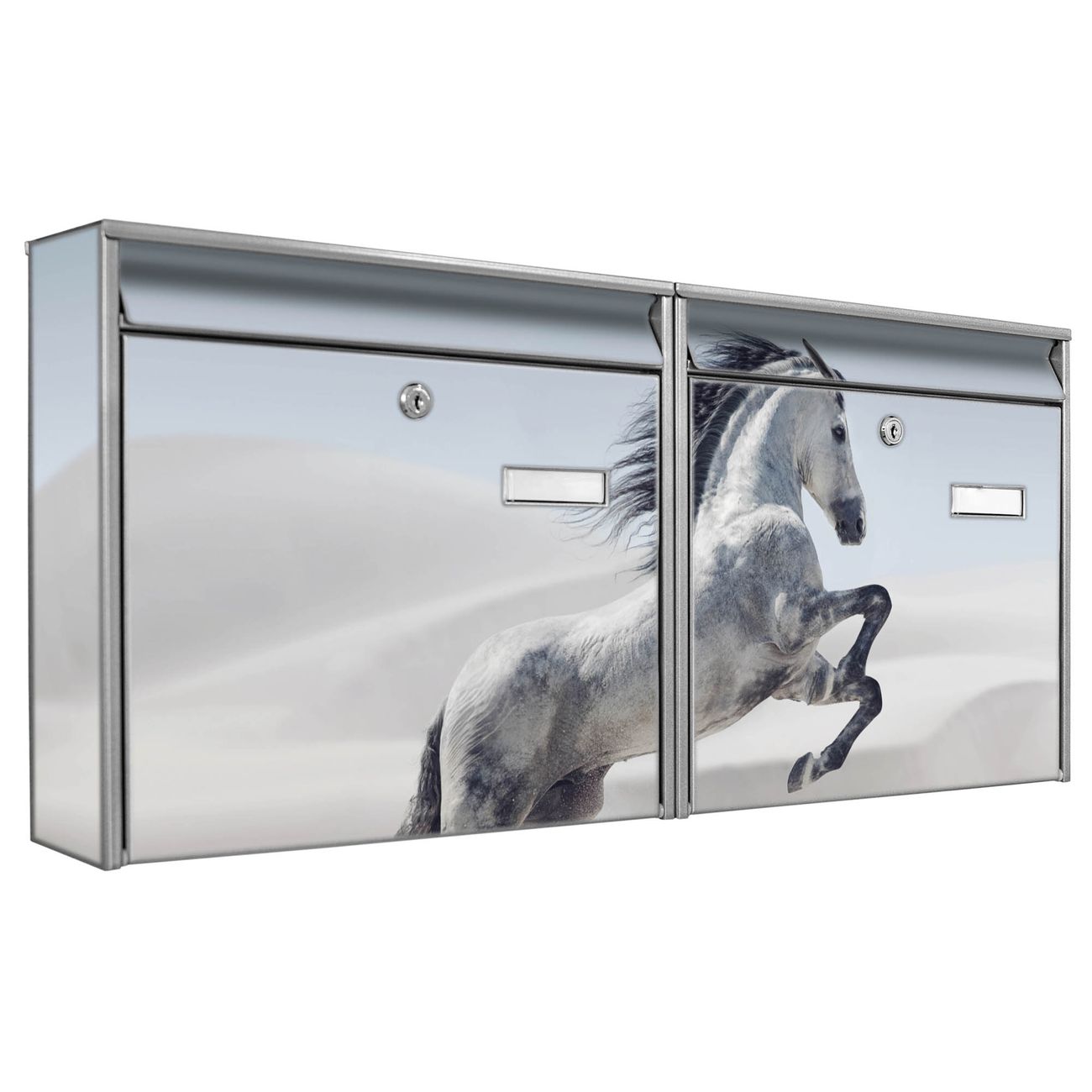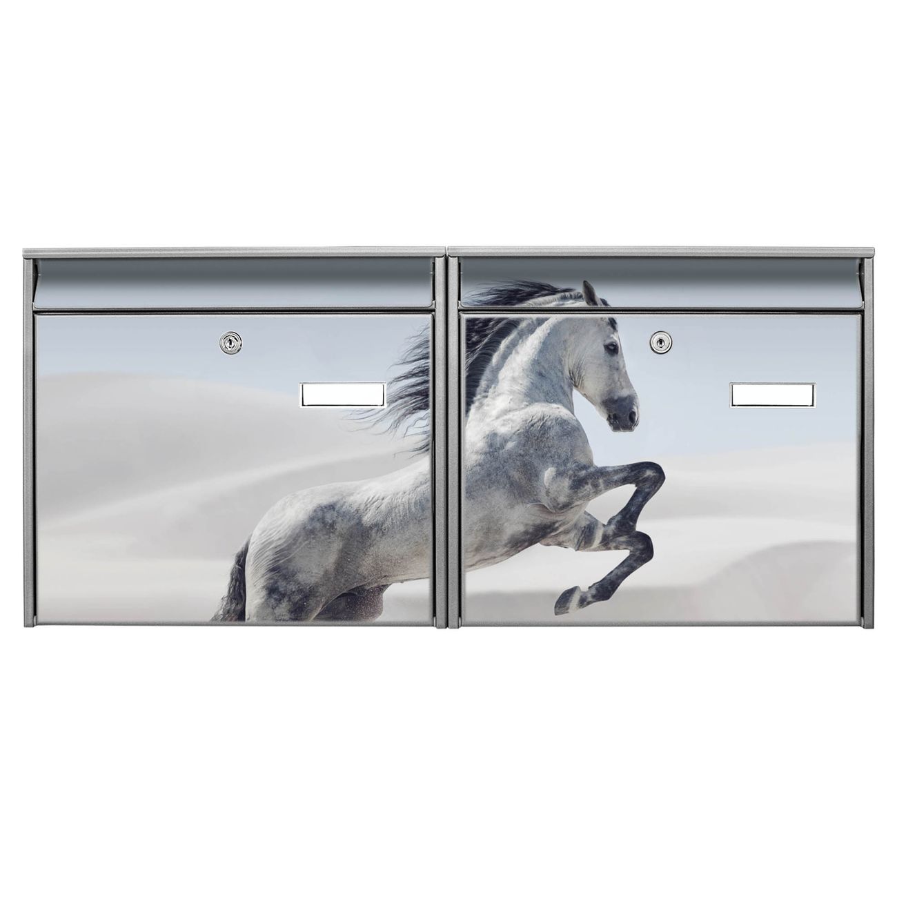 FUNKTION: Die Burg Wächter doppel Briefkastenanlage mit Motiv Wildes Pferd bietet Ihnen ein großes Fassungsvermögen, sodass auch A4 Sendungen eingeworfen werden können. Das Namensschild lässt sich individuell beschriften. DESIGN: Die 2 Briefkästen mit Wildes Pferd Motiv haben ein sehr ansprechendes und zeitloses Design. Heben Sie Sich von der tristen grauen Masse ab, ohne auf Funktionalität zu verzichten. Sie erhalten 2 Schlüssel sowie das Montagematerial. DETAILS: Der Doppelbriefkasten besteht aus verzinktem Stahl weiß. Er ist 72,5cm x 32,2cm x 10cm groß. Das Motiv besteht aus einer wetter- und UV-festen Folie, die Ihren Briefkasten zusätzlich vor Kratzern schützt. NUTZEN: Die stabile Bauart sowie die Wetterfestigkeit machen diese doppel Briefkästen zu einem zuverlässigen Begleiter im Alltag. Effektvoll in Reihe gehangen schmückt die Anlage jede Hauswand. BANJADO: Ihr Briefkasten wird in Sachsen in einer kleinen Manufaktur von Hand veredelt. Die Motivfolie ist lösungsmittelfrei und schutzlaminiert für einen langen Halt. Wir legen großen Wert auf die Verbindung von Funktionalität und Design. Sie erhalten Handarbeit aus Sachsen.