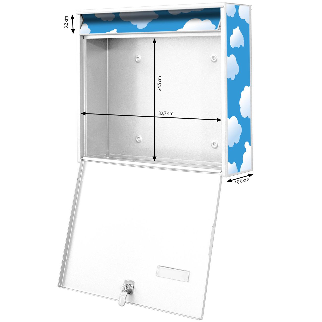 FUNKTION: Die Burg Wächter doppel Briefkastenanlage mit Motiv Wölkchen bietet Ihnen ein großes Fassungsvermögen, sodass auch A4 Sendungen eingeworfen werden können. Das Namensschild lässt sich individuell beschriften. DESIGN: Die 2 Briefkästen mit Wölkchen Motiv haben ein sehr ansprechendes und zeitloses Design. Heben Sie Sich von der tristen grauen Masse ab, ohne auf Funktionalität zu verzichten. Sie erhalten 2 Schlüssel sowie das Montagematerial. DETAILS: Der Doppelbriefkasten besteht aus verzinktem Stahl weiß. Er ist 72,5cm x 32,2cm x 10cm groß. Das Motiv besteht aus einer wetter- und UV-festen Folie, die Ihren Briefkasten zusätzlich vor Kratzern schützt. NUTZEN: Die stabile Bauart sowie die Wetterfestigkeit machen diese doppel Briefkästen zu einem zuverlässigen Begleiter im Alltag. Effektvoll in Reihe gehangen schmückt die Anlage jede Hauswand. BANJADO: Ihr Briefkasten wird in Sachsen in einer kleinen Manufaktur von Hand veredelt. Die Motivfolie ist lösungsmittelfrei und schutzlaminiert für einen langen Halt. Wir legen großen Wert auf die Verbindung von Funktionalität und Design. Sie erhalten Handarbeit aus Sachsen.
