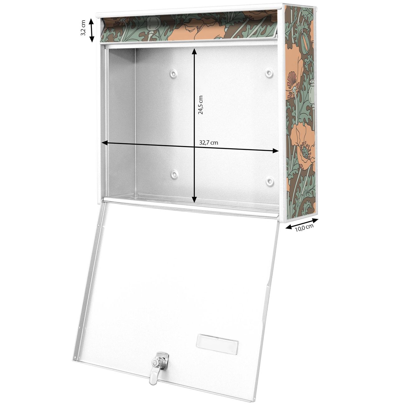 FUNKTION: Die Burg Wächter doppel Briefkastenanlage mit Motiv Zeichnung Mohn bietet Ihnen ein großes Fassungsvermögen, sodass auch A4 Sendungen eingeworfen werden können. Das Namensschild lässt sich individuell beschriften. DESIGN: Die 2 Briefkästen mit Zeichnung Mohn Motiv haben ein sehr ansprechendes und zeitloses Design. Heben Sie Sich von der tristen grauen Masse ab, ohne auf Funktionalität zu verzichten. Sie erhalten 2 Schlüssel sowie das Montagematerial. DETAILS: Der Doppelbriefkasten besteht aus verzinktem Stahl weiß. Er ist 72,5cm x 32,2cm x 10cm groß. Das Motiv besteht aus einer wetter- und UV-festen Folie, die Ihren Briefkasten zusätzlich vor Kratzern schützt. NUTZEN: Die stabile Bauart sowie die Wetterfestigkeit machen diese doppel Briefkästen zu einem zuverlässigen Begleiter im Alltag. Effektvoll in Reihe gehangen schmückt die Anlage jede Hauswand. BANJADO: Ihr Briefkasten wird in Sachsen in einer kleinen Manufaktur von Hand veredelt. Die Motivfolie ist lösungsmittelfrei und schutzlaminiert für einen langen Halt. Wir legen großen Wert auf die Verbindung von Funktionalität und Design. Sie erhalten Handarbeit aus Sachsen.