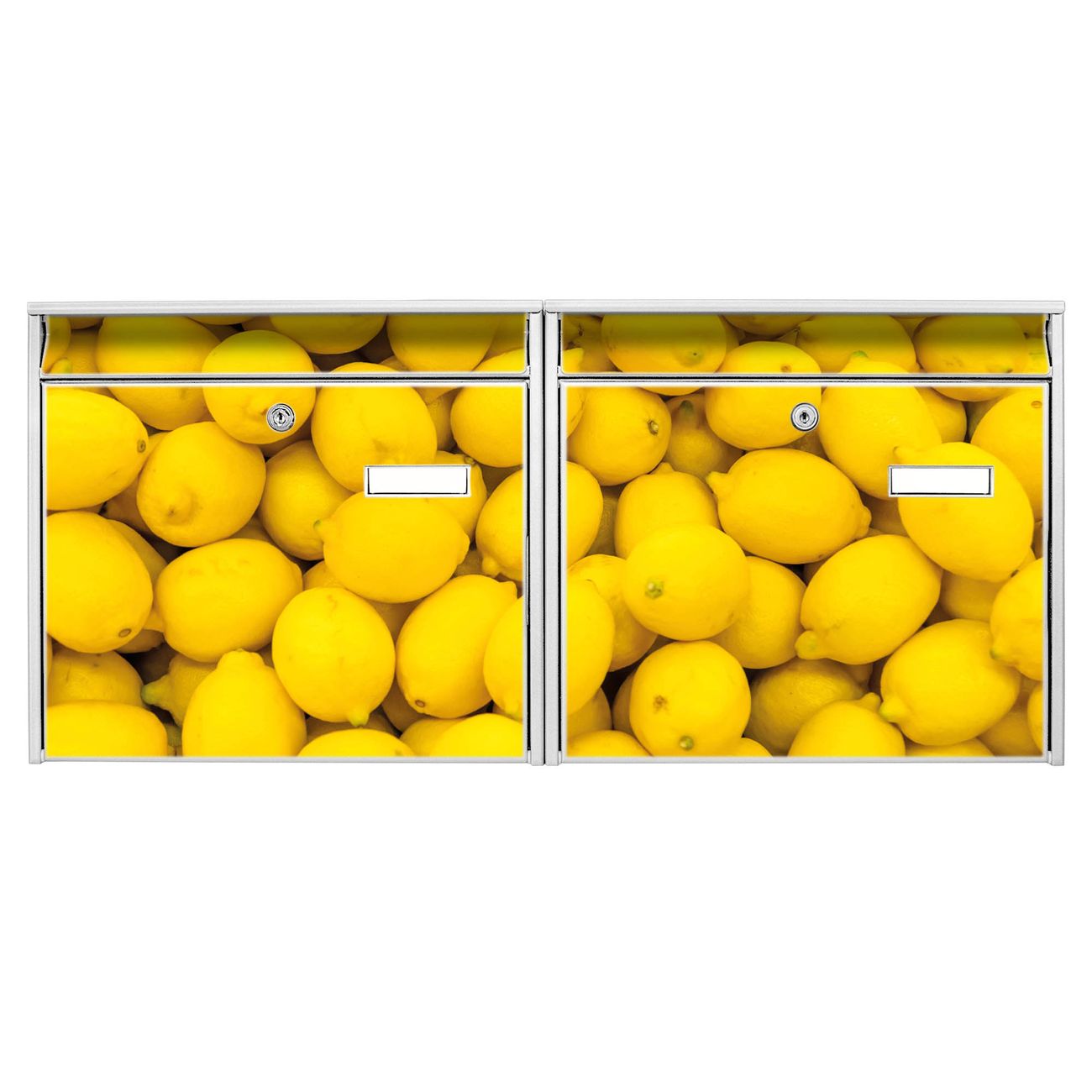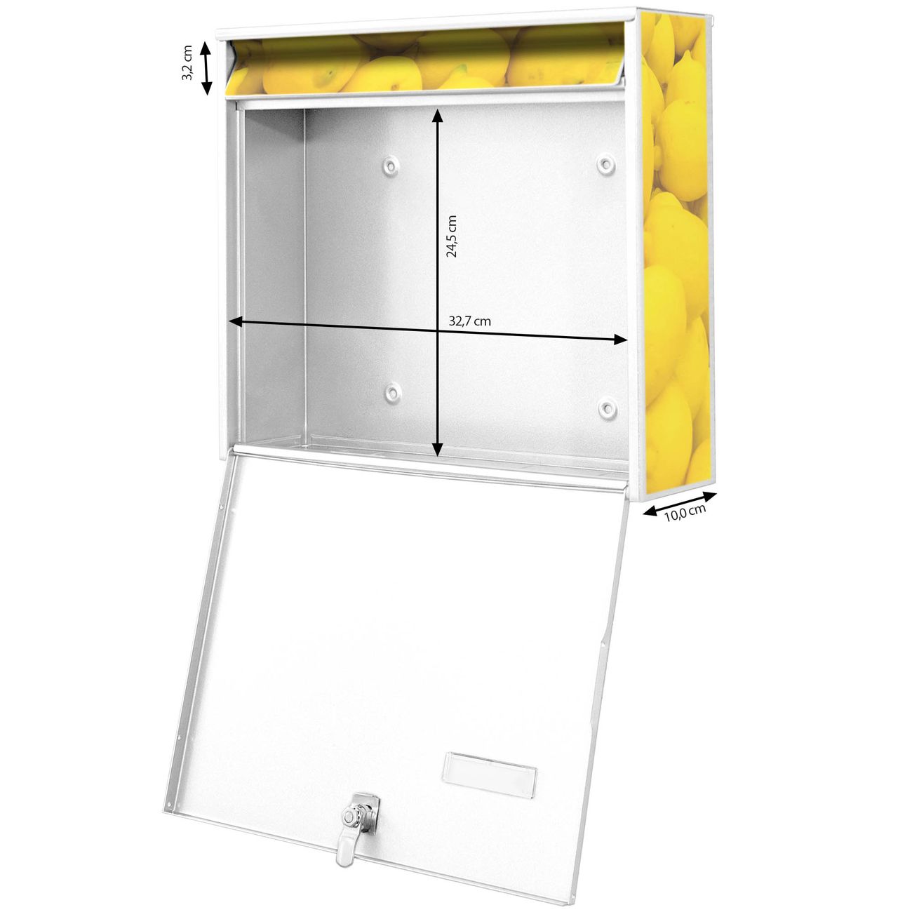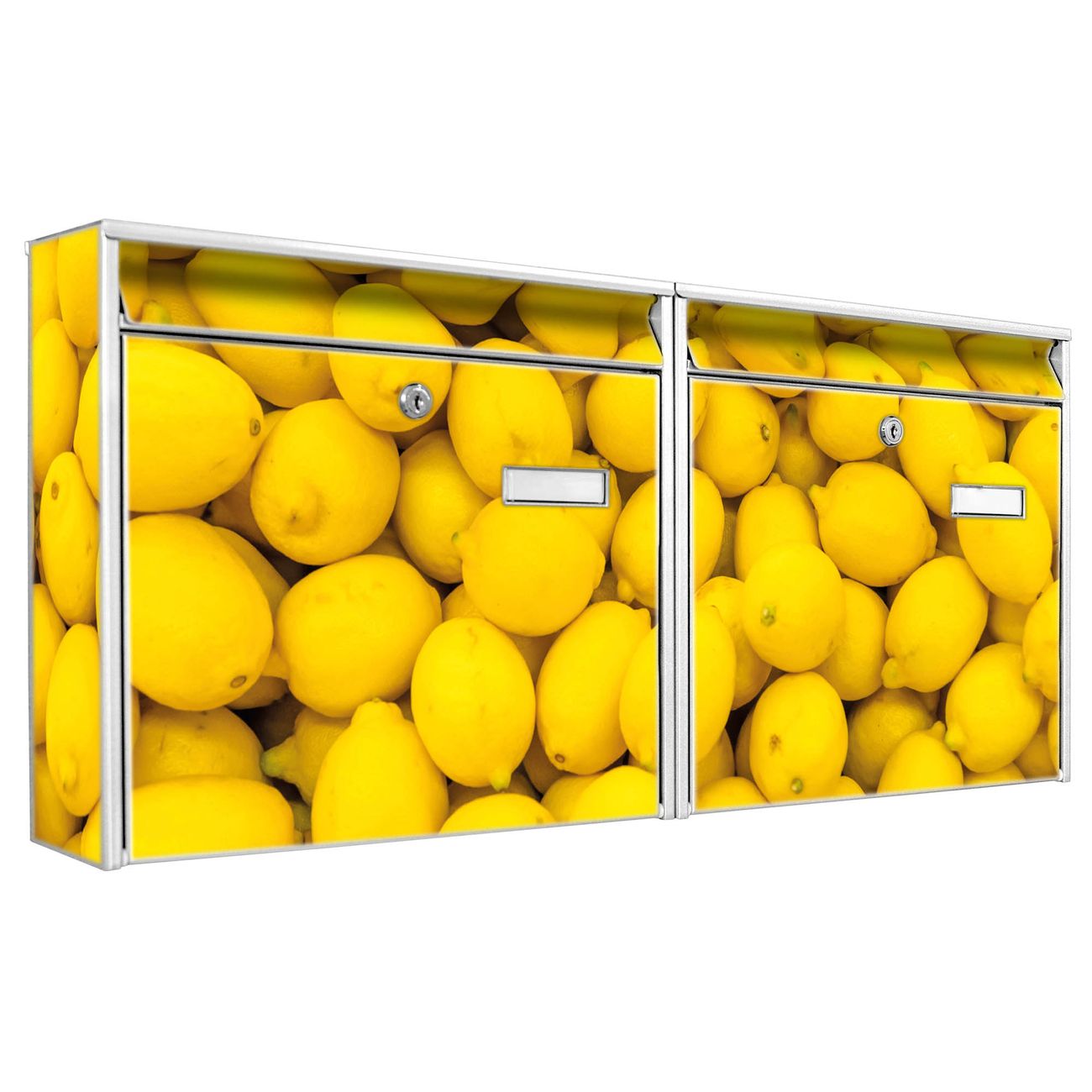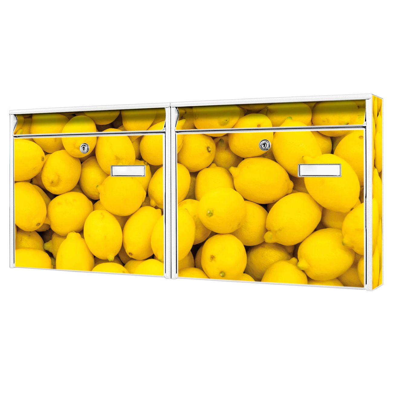 FUNKTION: Die Burg Wächter doppel Briefkastenanlage mit Motiv Zitronen bietet Ihnen ein großes Fassungsvermögen, sodass auch A4 Sendungen eingeworfen werden können. Das Namensschild lässt sich individuell beschriften. DESIGN: Die 2 Briefkästen mit Zitronen Motiv haben ein sehr ansprechendes und zeitloses Design. Heben Sie Sich von der tristen grauen Masse ab, ohne auf Funktionalität zu verzichten. Sie erhalten 2 Schlüssel sowie das Montagematerial. DETAILS: Der Doppelbriefkasten besteht aus verzinktem Stahl weiß. Er ist 72,5cm x 32,2cm x 10cm groß. Das Motiv besteht aus einer wetter- und UV-festen Folie, die Ihren Briefkasten zusätzlich vor Kratzern schützt. NUTZEN: Die stabile Bauart sowie die Wetterfestigkeit machen diese doppel Briefkästen zu einem zuverlässigen Begleiter im Alltag. Effektvoll in Reihe gehangen schmückt die Anlage jede Hauswand. BANJADO: Ihr Briefkasten wird in Sachsen in einer kleinen Manufaktur von Hand veredelt. Die Motivfolie ist lösungsmittelfrei und schutzlaminiert für einen langen Halt. Wir legen großen Wert auf die Verbindung von Funktionalität und Design. Sie erhalten Handarbeit aus Sachsen.
