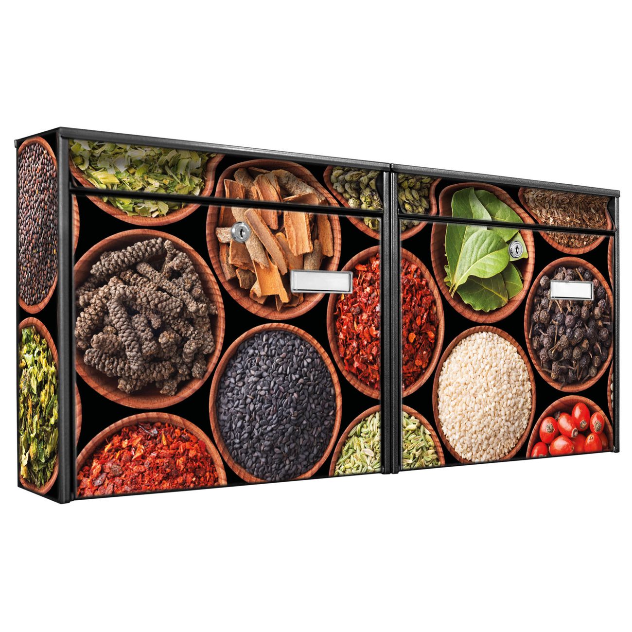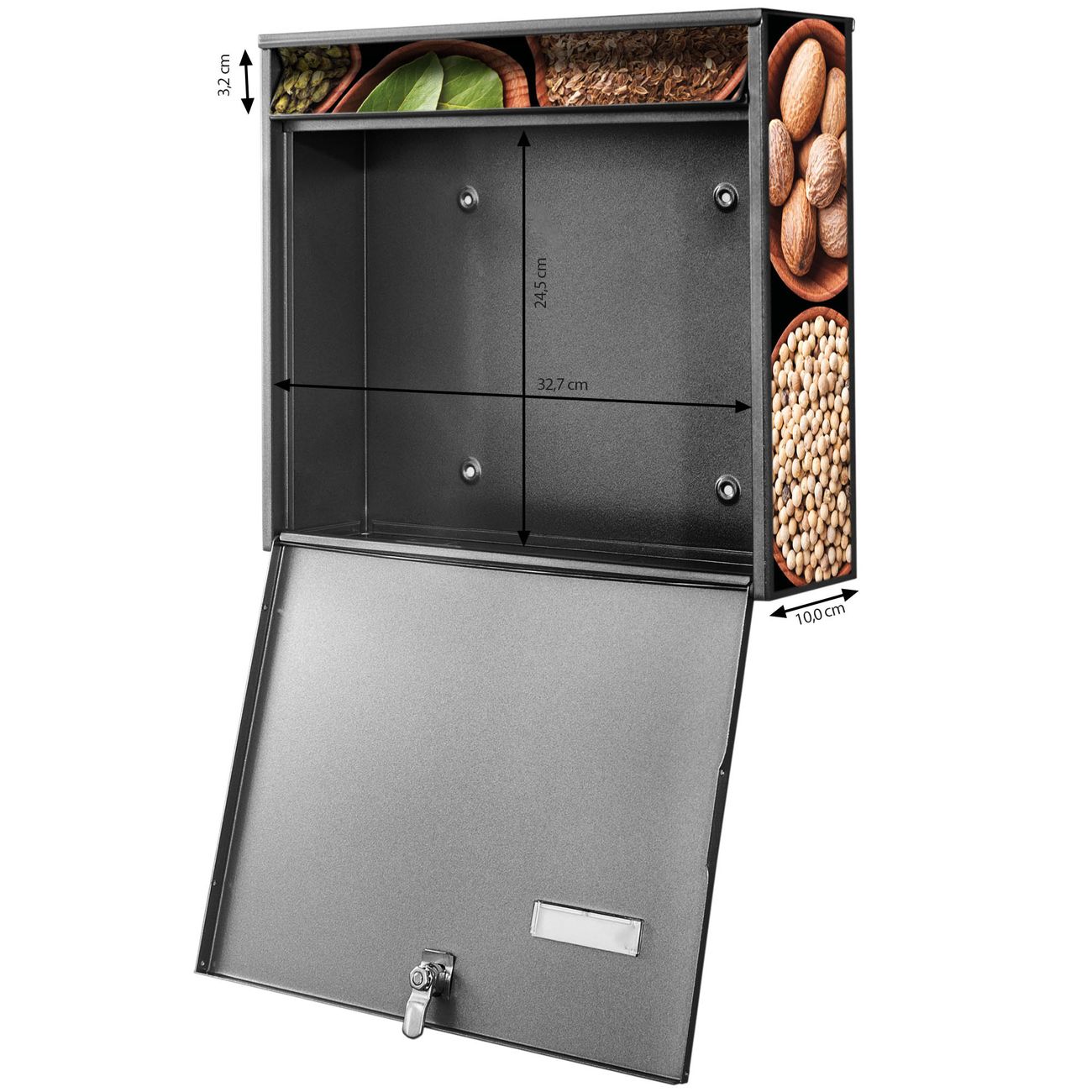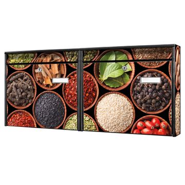 FUNKTION: Die Burg Wächter doppel Briefkastenanlage mit Motiv Zutaten bietet Ihnen ein großes Fassungsvermögen, sodass auch A4 Sendungen eingeworfen werden können. Das Namensschild lässt sich individuell beschriften. DESIGN: Die 2 Briefkästen mit Zutaten Motiv haben ein sehr ansprechendes und zeitloses Design. Heben Sie Sich von der tristen grauen Masse ab, ohne auf Funktionalität zu verzichten. Sie erhalten 2 Schlüssel sowie das Montagematerial. DETAILS: Der Doppelbriefkasten besteht aus verzinktem Stahl weiß. Er ist 72,5cm x 32,2cm x 10cm groß. Das Motiv besteht aus einer wetter- und UV-festen Folie, die Ihren Briefkasten zusätzlich vor Kratzern schützt. NUTZEN: Die stabile Bauart sowie die Wetterfestigkeit machen diese doppel Briefkästen zu einem zuverlässigen Begleiter im Alltag. Effektvoll in Reihe gehangen schmückt die Anlage jede Hauswand. BANJADO: Ihr Briefkasten wird in Sachsen in einer kleinen Manufaktur von Hand veredelt. Die Motivfolie ist lösungsmittelfrei und schutzlaminiert für einen langen Halt. Wir legen großen Wert auf die Verbindung von Funktionalität und Design. Sie erhalten Handarbeit aus Sachsen.
