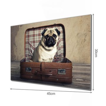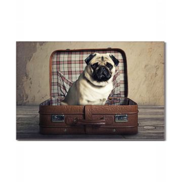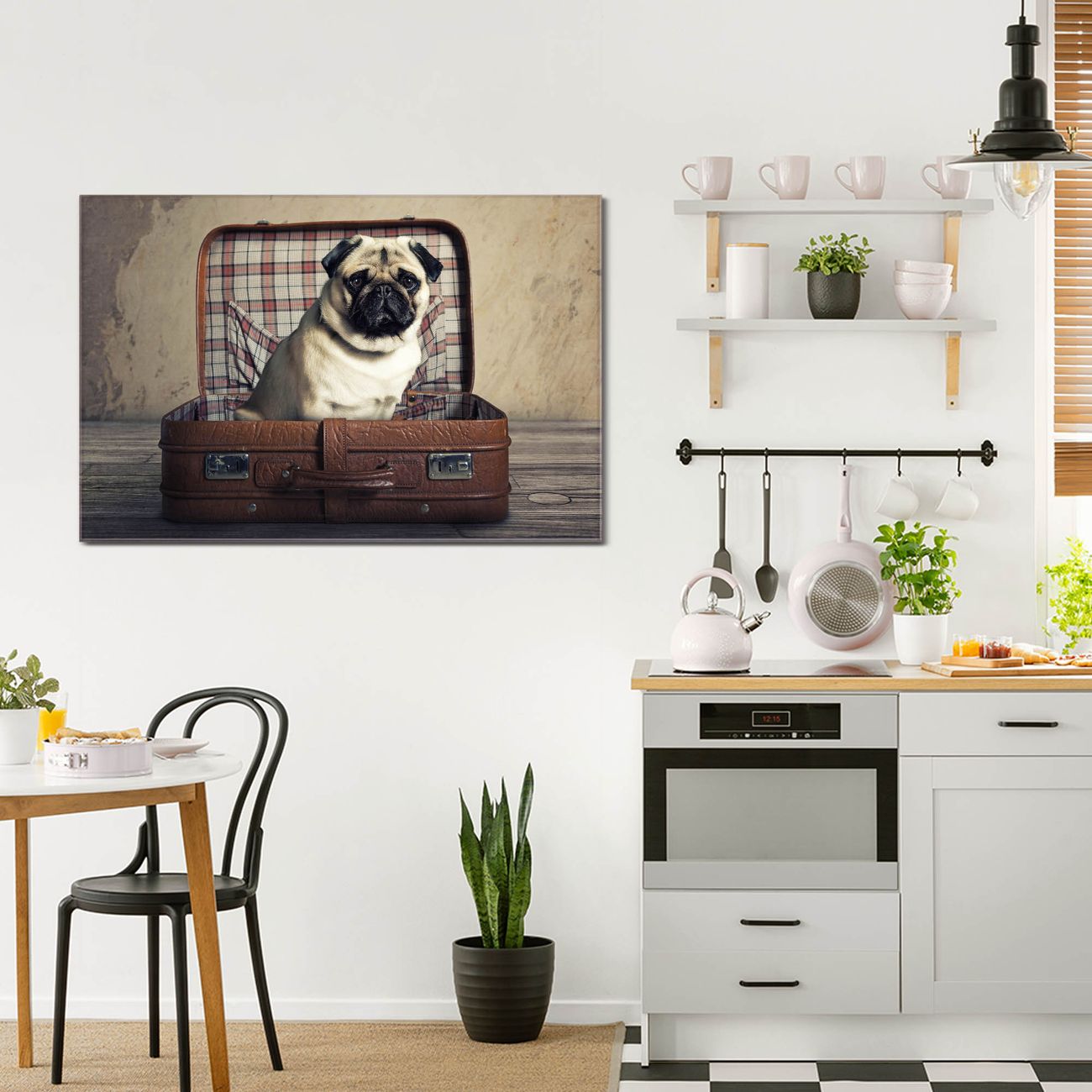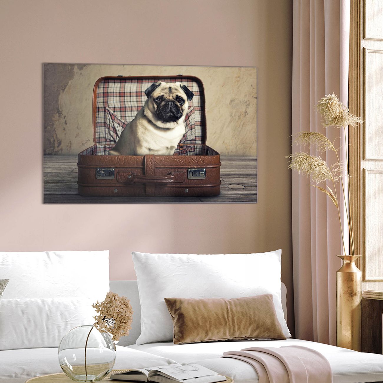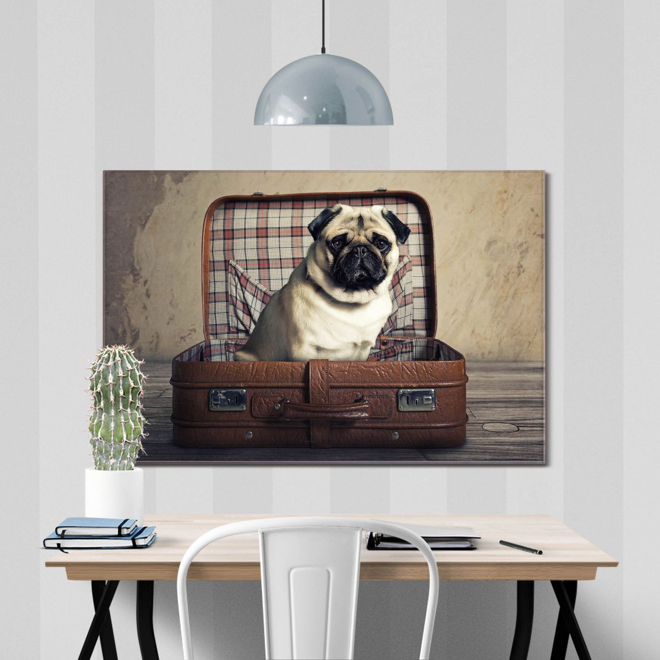 Einzigartiges Wandbild im Querformat Mops im Koffer