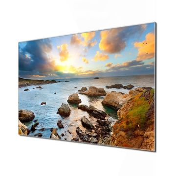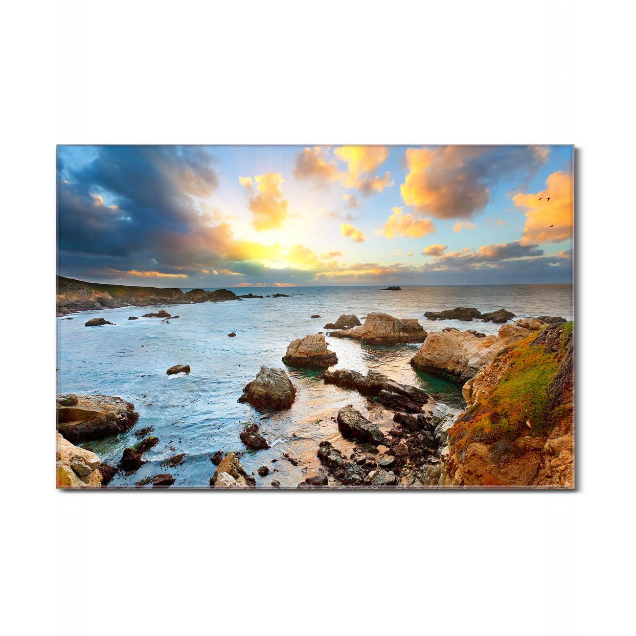 Unsere einzigartigen Glasbilder im Querformat von banjado mit Motiv Sonnenaufgang am Meer sind der absolute Hingucker! Unsere Banjado Glasbilder sind sehr begehrt, weil sie top verarbeitet sind und sich ganz leicht montieren lassen. Schon mit wenigen Handgriffen hängen sie an der Wand und strahlen mit höchster brillianz. Durch die Ramenlose Herstellung schwebt das Echtglasbild förmlich an der Wand. Das Motiv erscheint besonders ausdrucksstark und hochwertig und ist hinter dem Echtglas geschützt.