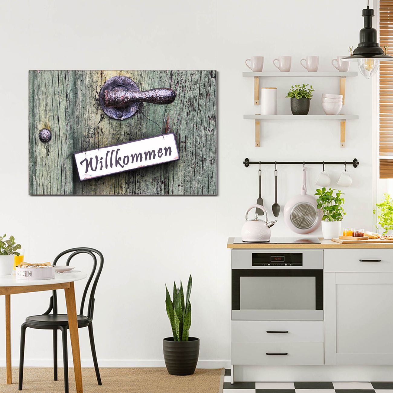 Unsere einzigartigen Glasbilder im Querformat von banjado mit Motiv Willkommen sind der absolute Hingucker! Unsere Banjado Glasbilder sind sehr begehrt, weil sie top verarbeitet sind und sich ganz leicht montieren lassen. Schon mit wenigen Handgriffen hängen sie an der Wand und strahlen mit höchster brillianz. Durch die Ramenlose Herstellung schwebt das Echtglasbild förmlich an der Wand. Das Motiv erscheint besonders ausdrucksstark und hochwertig und ist hinter dem Echtglas geschützt.