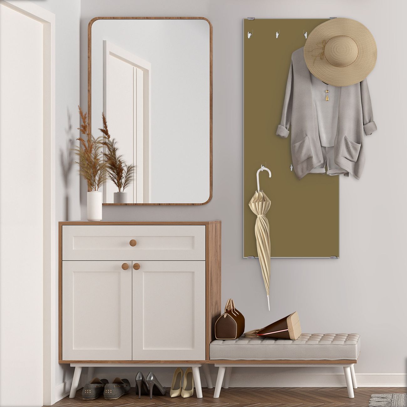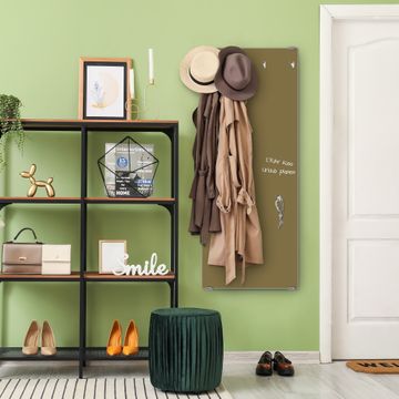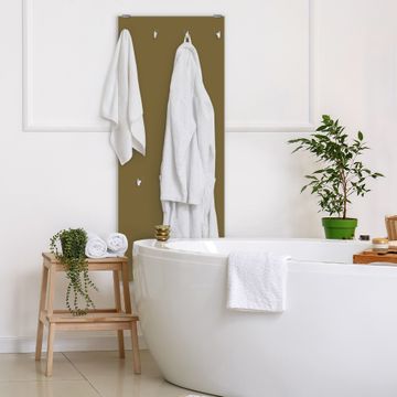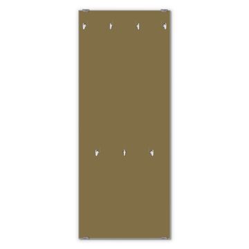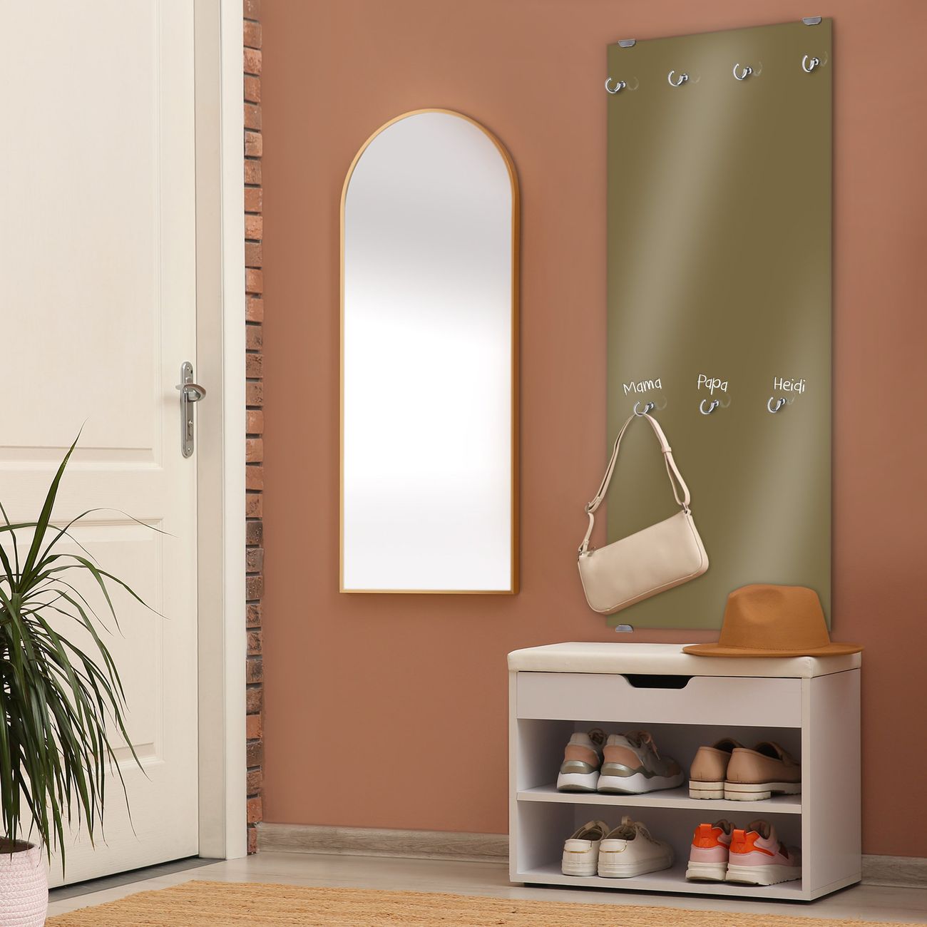 FUNKTION: Die banjado Wandgarderobe mit Farbe Gold Metallic ist Ihr täglicher Begleiter. Zuverlässig hängen hier Ihre Jacken und Mäntel griffbereit. Das Echtglas ist Ihr Paneel auch beschreibbar und wieder abwischbar. DESIGN: Sie erhalten eine Garderobenleiste aus elegantem Echtglas mit dem Farbbrillanten Farbe Gold Metallic hinterklebt. Das Design ist zeitlos klassisch, ohne dabei auf Funktionalität zu verzichten. Suchen Sie aus einer Vielzahl von Farbeen das für Ihre Einrichtung Passende aus. DETAILS: Die Flurgarderobe besteht aus 4mm gehärtetem Sicherheitsglas. Sie ist 50cm breit, 125cm hoch und 6cm tief. Die Garderobenhaken zur Selbstmontage präsentieren sich in Edelstahl-Optik, ebenso die Abstandshalter für die Wandmontage. Ihre neue Garderobe ist sofort einsatzbereit. NUTZEN: Ihre neue Garderobe hält nicht nur zuverlässig Ihre Kleidung, sie ist auch optisch ein Blickfang. Durch das Glas können Sie an der Garderobe mit wasserlöslichen Kreidestiften oder Whiteboard-Markern auch Nachrichten hinterlassen. BANJADO: Wir sind ein kleines kreatives Team aus Sachsen und entwickeln Produkte die Design und Funktionalität verbinden sollen. Viel Freude mit Ihrer neuen Garderobe wünscht das banjado-Team!