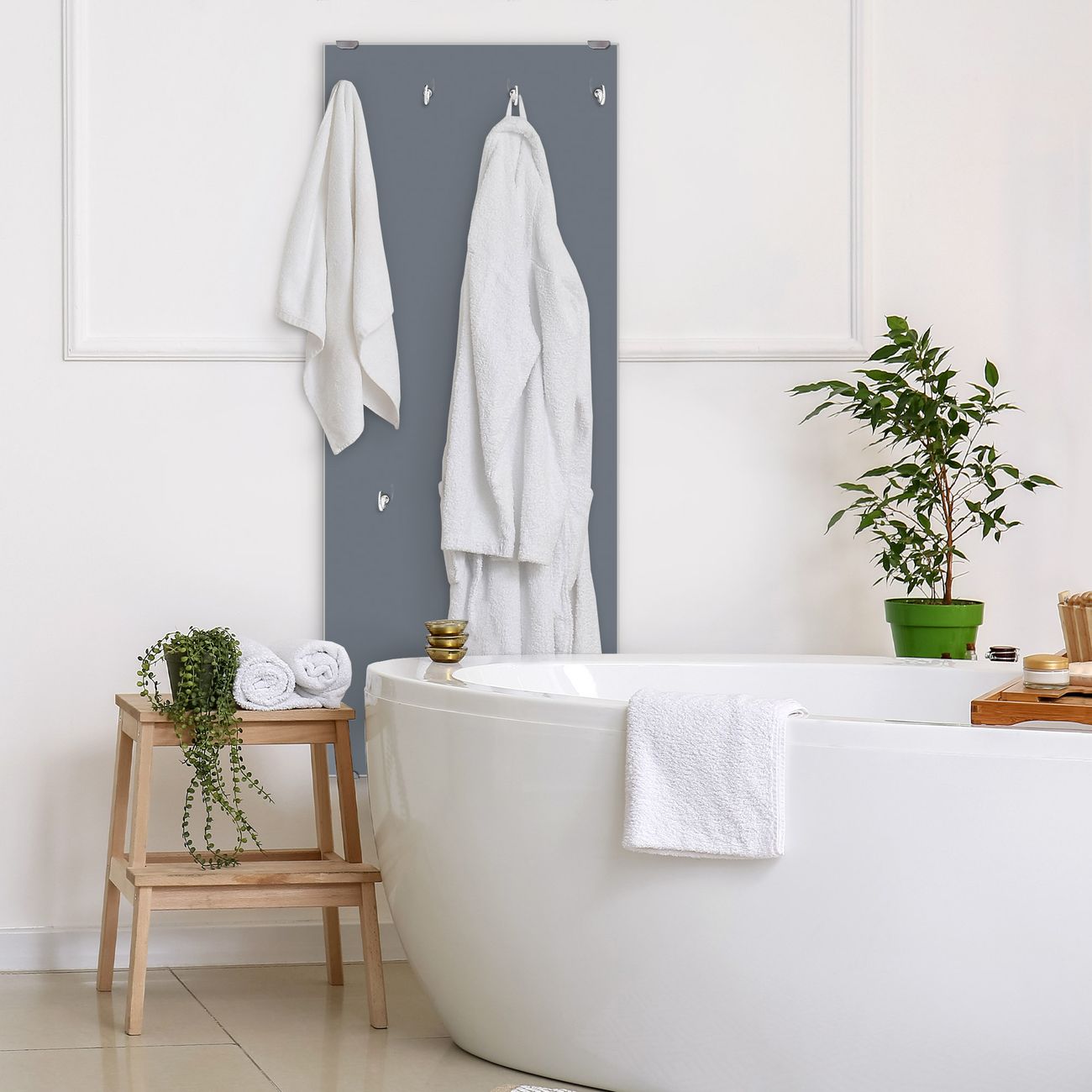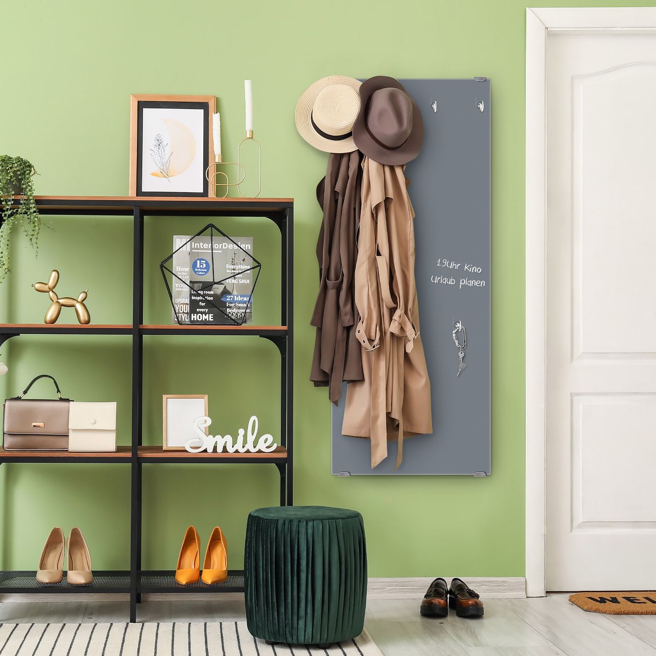 FUNKTION: Die banjado Wandgarderobe mit Farbe Silber Metallic ist Ihr täglicher Begleiter. Zuverlässig hängen hier Ihre Jacken und Mäntel griffbereit. Das Echtglas ist Ihr Paneel auch beschreibbar und wieder abwischbar. DESIGN: Sie erhalten eine Garderobenleiste aus elegantem Echtglas mit dem Farbbrillanten Farbe Silber Metallic hinterklebt. Das Design ist zeitlos klassisch, ohne dabei auf Funktionalität zu verzichten. Suchen Sie aus einer Vielzahl von Farbeen das für Ihre Einrichtung Passende aus. DETAILS: Die Flurgarderobe besteht aus 4mm gehärtetem Sicherheitsglas. Sie ist 50cm breit, 125cm hoch und 6cm tief. Die Garderobenhaken zur Selbstmontage präsentieren sich in Edelstahl-Optik, ebenso die Abstandshalter für die Wandmontage. Ihre neue Garderobe ist sofort einsatzbereit. NUTZEN: Ihre neue Garderobe hält nicht nur zuverlässig Ihre Kleidung, sie ist auch optisch ein Blickfang. Durch das Glas können Sie an der Garderobe mit wasserlöslichen Kreidestiften oder Whiteboard-Markern auch Nachrichten hinterlassen. BANJADO: Wir sind ein kleines kreatives Team aus Sachsen und entwickeln Produkte die Design und Funktionalität verbinden sollen. Viel Freude mit Ihrer neuen Garderobe wünscht das banjado-Team!