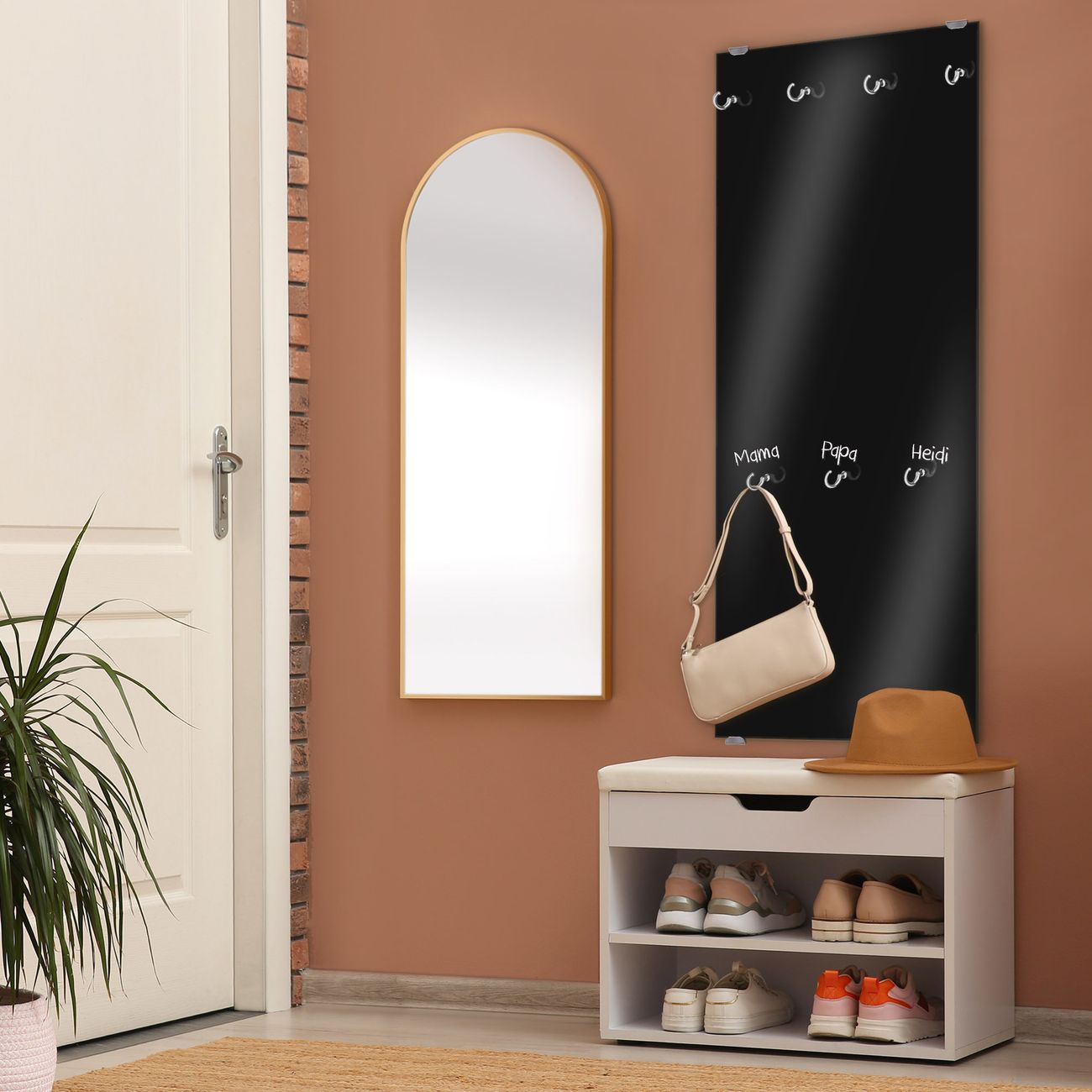 FUNKTION: Die banjado Wandgarderobe mit Farbe Tiefschwarz ist Ihr täglicher Begleiter. Zuverlässig hängen hier Ihre Jacken und Mäntel griffbereit. Das Echtglas ist Ihr Paneel auch beschreibbar und wieder abwischbar. DESIGN: Sie erhalten eine Garderobenleiste aus elegantem Echtglas mit dem Farbbrillanten Farbe Tiefschwarz hinterklebt. Das Design ist zeitlos klassisch, ohne dabei auf Funktionalität zu verzichten. Suchen Sie aus einer Vielzahl von Farbeen das für Ihre Einrichtung Passende aus. DETAILS: Die Flurgarderobe besteht aus 4mm gehärtetem Sicherheitsglas. Sie ist 50cm breit, 125cm hoch und 6cm tief. Die Garderobenhaken zur Selbstmontage präsentieren sich in Edelstahl-Optik, ebenso die Abstandshalter für die Wandmontage. Ihre neue Garderobe ist sofort einsatzbereit. NUTZEN: Ihre neue Garderobe hält nicht nur zuverlässig Ihre Kleidung, sie ist auch optisch ein Blickfang. Durch das Glas können Sie an der Garderobe mit wasserlöslichen Kreidestiften oder Whiteboard-Markern auch Nachrichten hinterlassen. BANJADO: Wir sind ein kleines kreatives Team aus Sachsen und entwickeln Produkte die Design und Funktionalität verbinden sollen. Viel Freude mit Ihrer neuen Garderobe wünscht das banjado-Team!