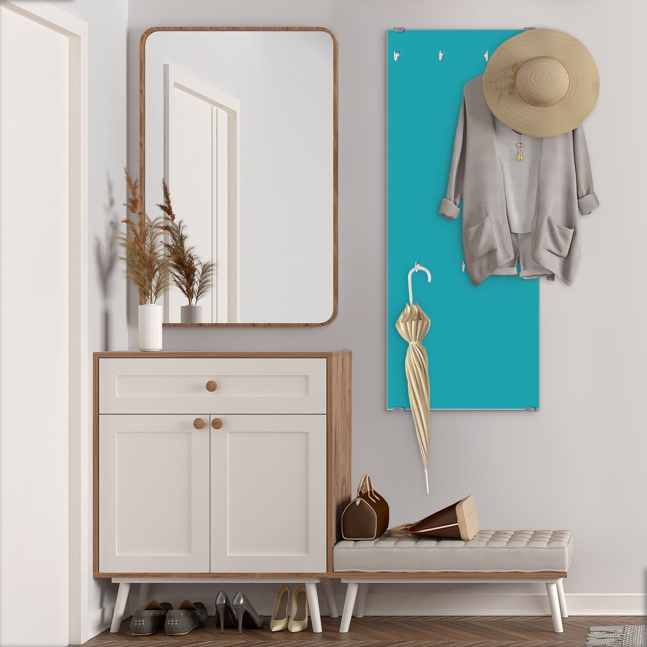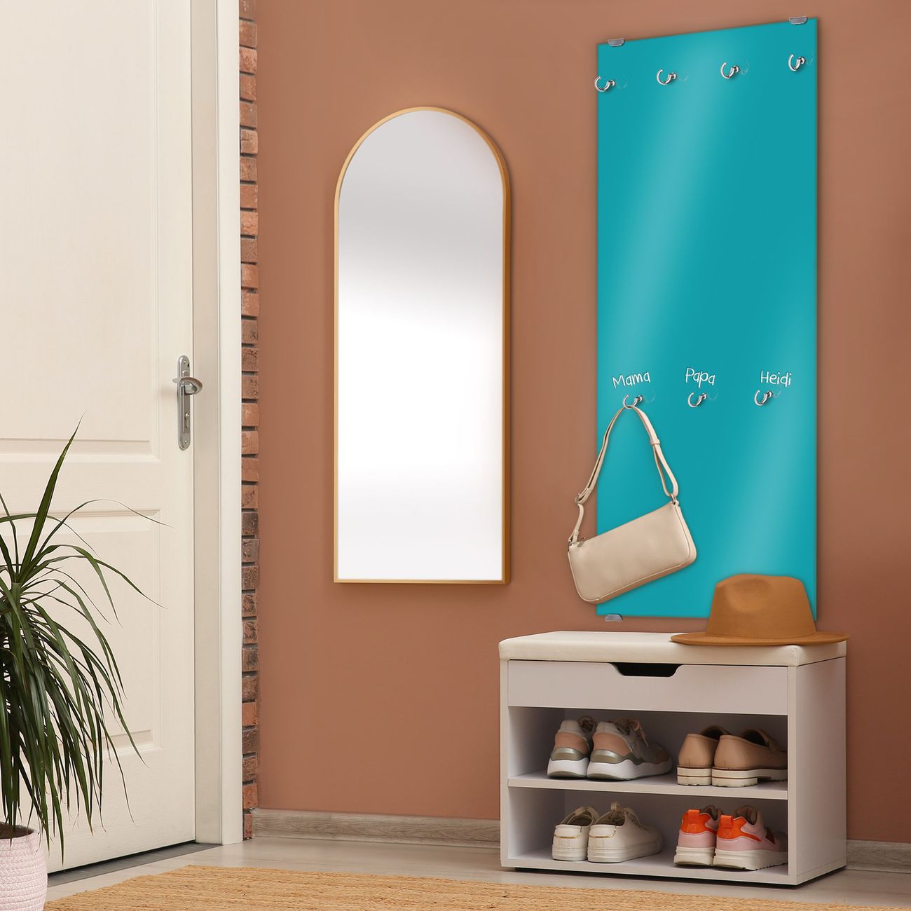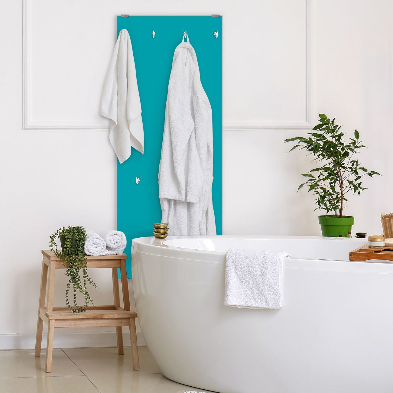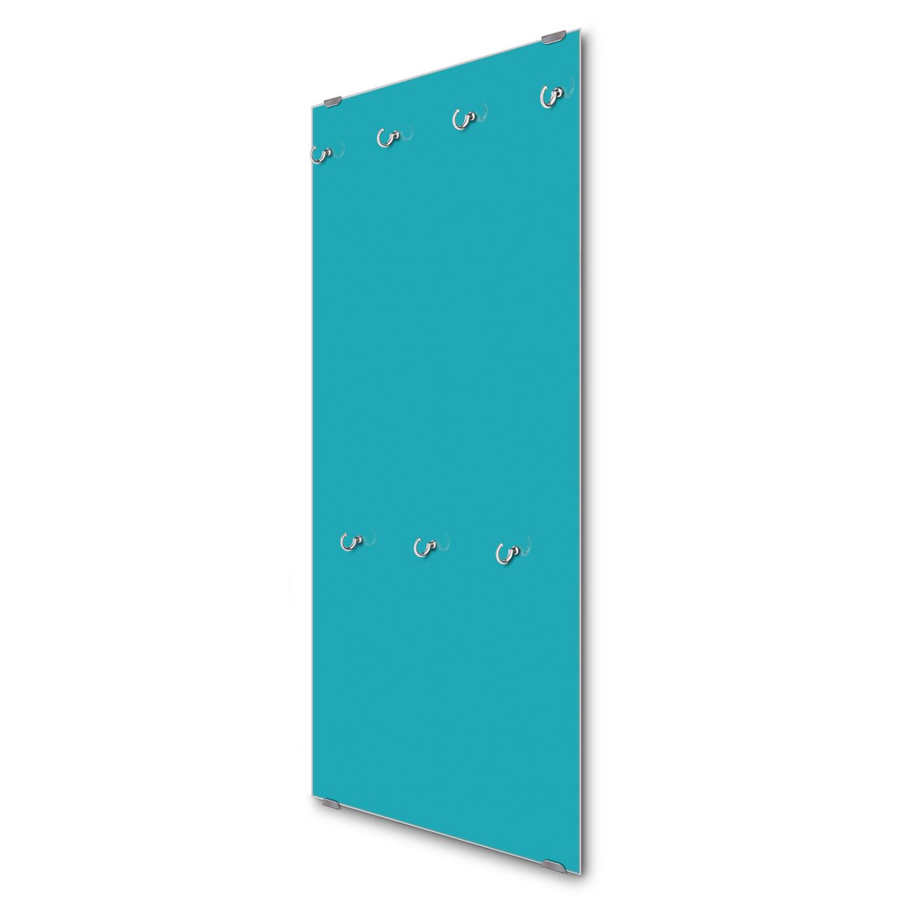 FUNKTION: Die banjado Wandgarderobe mit Farbe Türkis ist Ihr täglicher Begleiter. Zuverlässig hängen hier Ihre Jacken und Mäntel griffbereit. Das Echtglas ist Ihr Paneel auch beschreibbar und wieder abwischbar. DESIGN: Sie erhalten eine Garderobenleiste aus elegantem Echtglas mit dem Farbbrillanten Farbe Türkis hinterklebt. Das Design ist zeitlos klassisch, ohne dabei auf Funktionalität zu verzichten. Suchen Sie aus einer Vielzahl von Farbeen das für Ihre Einrichtung Passende aus. DETAILS: Die Flurgarderobe besteht aus 4mm gehärtetem Sicherheitsglas. Sie ist 50cm breit, 125cm hoch und 6cm tief. Die Garderobenhaken zur Selbstmontage präsentieren sich in Edelstahl-Optik, ebenso die Abstandshalter für die Wandmontage. Ihre neue Garderobe ist sofort einsatzbereit. NUTZEN: Ihre neue Garderobe hält nicht nur zuverlässig Ihre Kleidung, sie ist auch optisch ein Blickfang. Durch das Glas können Sie an der Garderobe mit wasserlöslichen Kreidestiften oder Whiteboard-Markern auch Nachrichten hinterlassen. BANJADO: Wir sind ein kleines kreatives Team aus Sachsen und entwickeln Produkte die Design und Funktionalität verbinden sollen. Viel Freude mit Ihrer neuen Garderobe wünscht das banjado-Team!
